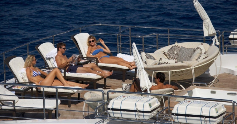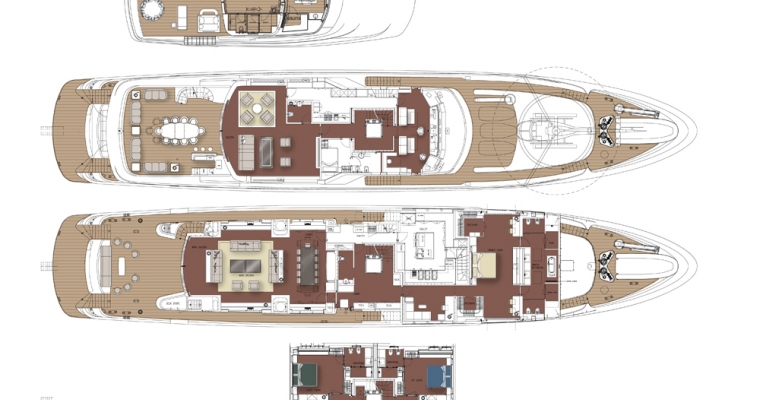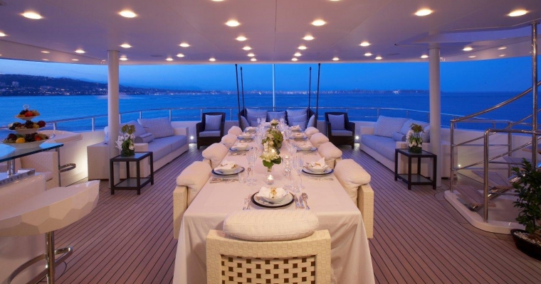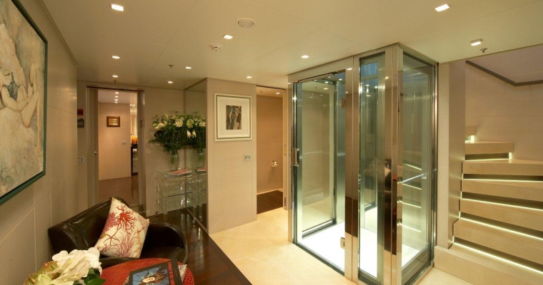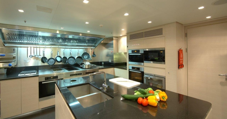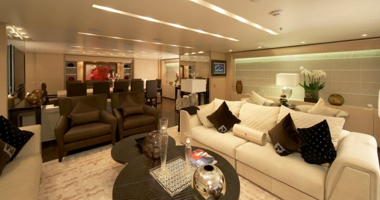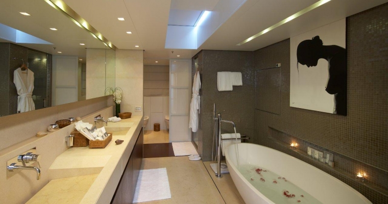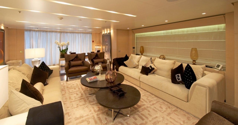 All guests furniture and fabrics are from the Luxury Italian design house Fendi. On the main deck, you will find the full beam Master Staterooms with a king size bed and walk-through bathroom including twin basins and large bath. She also includes a private office and two walk-in dressing rooms. A guest elevator goes from the lower cabin deck to the main deck. The elevator door opens to a maximum of 79 cm, wide enough for a small wheelchair. The lower deck consists in three Guest Staterooms with queen beds and one Twin Stateroom.