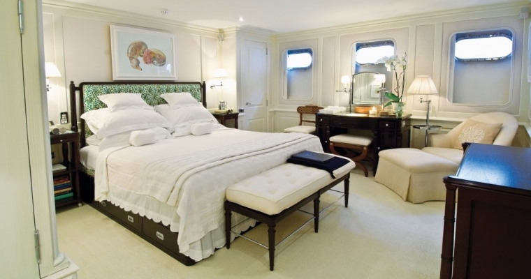 1 x master cabin 2 x double cabins (aft lower) 3 x twin cabins (including "Governor's cabin" for children only) 4 x baby beds in 2 twin cabins All cabins are with bath/shower room en suite Main deck: full beam master double cabin with his and hers bathroom en suite and office, 1 x twin convertible cabin for children only with bath and shower en suite Lower deck: 2 x double cabins each with en suite bathroom 2 x twin cabins with small baby beds pullman under beds (for children only) with bath and shower en suite.