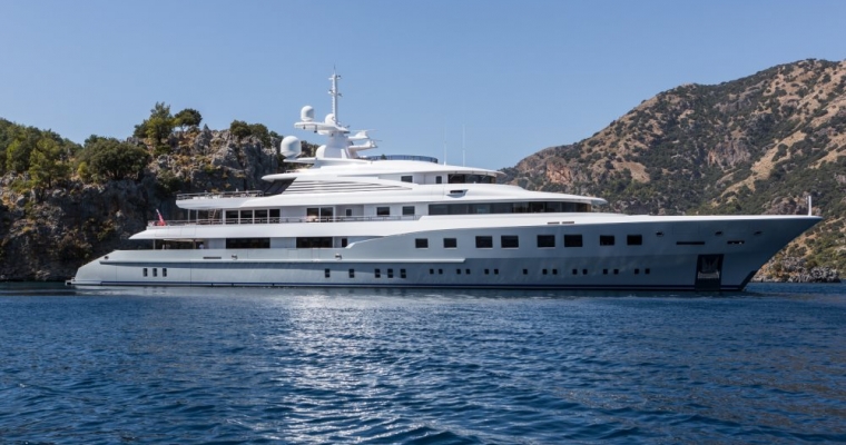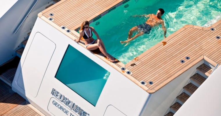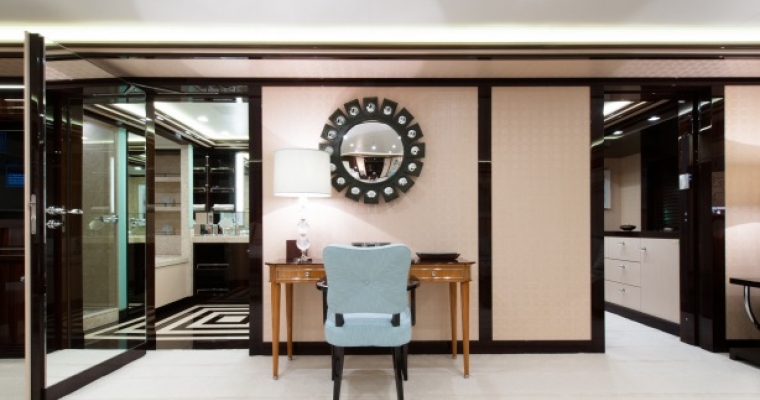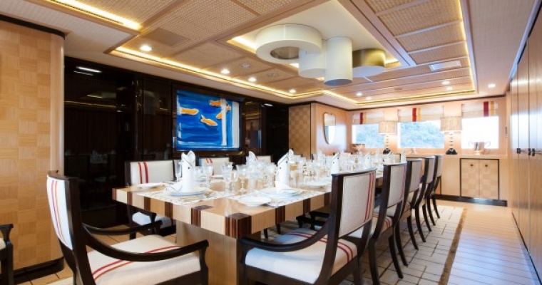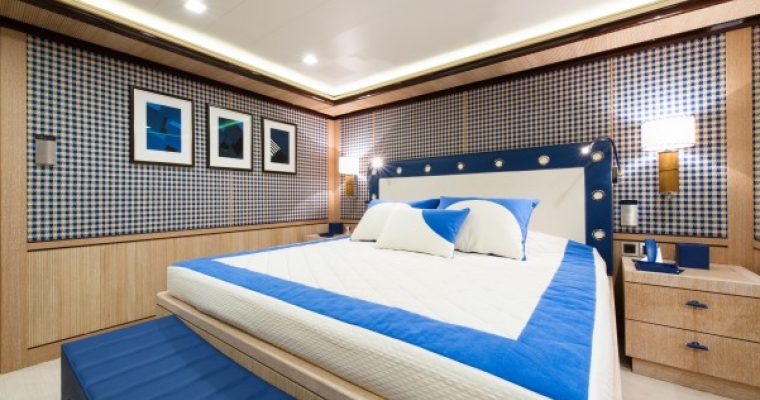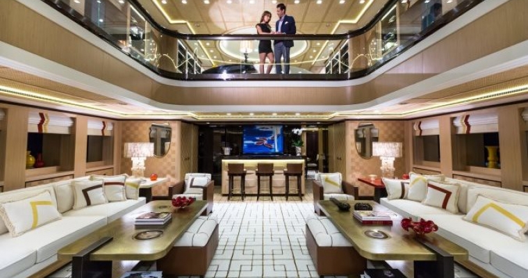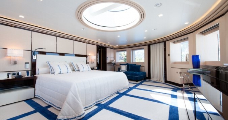 Axioma accommodates 12 guests in a master suite, VIP suite and four guest double cabins, two of which are convertible into twins. The yacht features stunning beach house-style interior by the legendary late designer Alberto Pinto that contrasts natural woods and luxurious flourishes. On the main deck, the infinity swimming pool is an outstanding exterior feature, while the open mezzanine in the main saloon creates a real 'wow effect' with its double-height and space. A large round table on the owner's aft deck offers an amazing alfresco dining. The media lounge on the owner's deck is a friendly socializing area with plenty of interesting books and also a large TV screen. The bridge aft deck features a large Jacuzzi with a swim-in bar, which is surrounded by large sun pads. Further on the bridge deck you will find a fully equipped gym, massage room and steam room. The sun deck features lounging and intimate seating and sunbathing areas with a shower and day head and a BBQ for perfect summer parties. The yacht also boasts a 3D cinema for 8 persons situated on the lower deck.