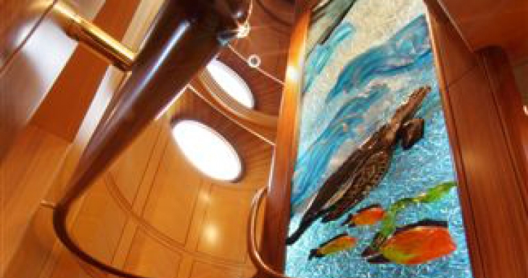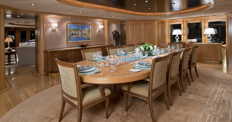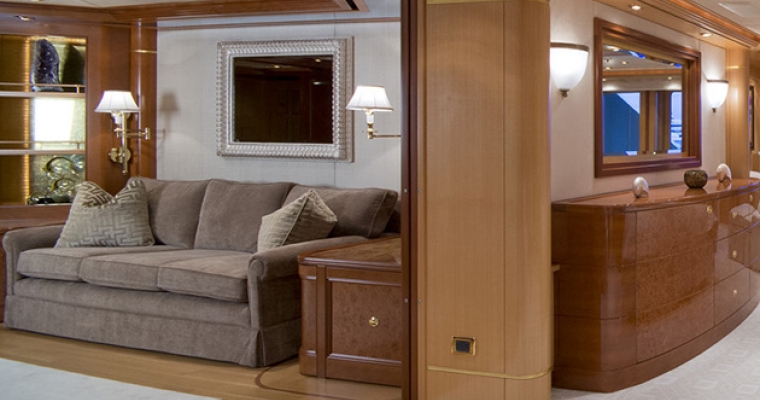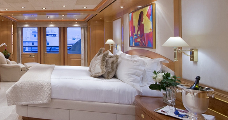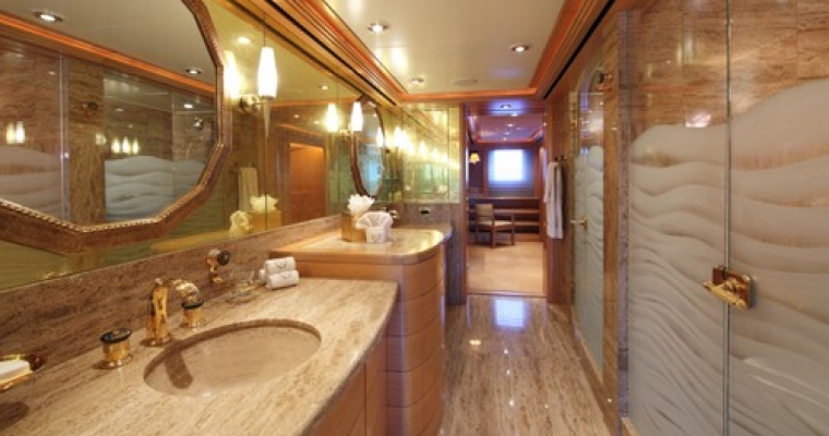 MAIN DECK MASTER SUITE: The luxurious full width suite, with centerline KING bed facing aft, is the ultimate for a restful, private, relaxing area. Linens in the master suite and all staterooms are 1200 tread count by Sferra. The location of the suite provides a very quiet, comfortable area while underway. There is a private deck/terrace, port and starboard of the master suite. Breakfast and refreshments can be delivered to the private area without disturbing guests in the suite. The terrace has a built in covered settee forward for shade and protection from the wind. There are chaise lounges, easy chairs and overhead heaters The ensuite bathroom is forward in the suite. The bathroom has double sinks, large double shower and a toilet in a separate room. Large wardrobes are on either side of the bathroom. The Owners lobby with coffee service, a sink and refrigerator is adjacent to the master suite study. The spacious study has a desk, cabinets, long sofa and easy chairs. LOWER DECK GUEST STATEROOMS – Access by elevator in the guest lobby or from the central stairway. 4 VIP STATEROOMS: Identical with KING beds, desk, and arm chair, each VIP has individual color scheme and wood inlay. Each ensuite bathroom has travertine marble, double gold Alchemy sinks and double showers. GUEST STATEROOM: Centerline QUEEN bed, with a SINGLE bed and a PULLMAN. The ensuite bathroom has a Jacuzzi tub, sower and double sinks.