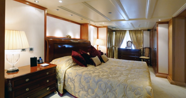 The master suite is spacious, with a sitting room and library. 10 main deck cabins extend from amidships, where they are larger due to the beam. The two cabins in the bow are smaller and are the only ones that don’t convert double/twin. The 6 cabins on the lower deck aft are also wider amidships, and gradually smaller as you go aft. They convert from double to twin, and have the same kind of amenities and bathrooms.