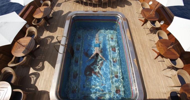 Tenders & Toys: Helicopter pad emergency use only Jacuzzi/pool on deck / lift - atrium 2 massage rooms, 1 beauty room, fitness therapists are included in the charter rate no additional cost inflatable swim platform 2 x passenger Hacker Craft Prestige varnished launches carrying 8 guests. 2 x 60-man watercraft lifeboats; Liferafts 8 x 20 pax + 2 x 25 pax 1 x Zodiac Medline 3, 12 guests 1 x Zodiac Medline 2 , 6-8 guests Various snorkelling equipment 2 x Ringos 1 x 6-man banana The vessel has the following gym equipment: 2 Cybex semi-recumbant bicycles - programmable 1 Power Plate 1 Life Fitness 9500 HR ellipitical bike cross trainer 1 LifeFitness Treadmill 9500 HR Various free weights + bench 1 YACHT TOBOGGAN AQUAGLIDE WITH A 6.50 METERS SLIDE RYA WATER SPORTS CENTRE 2 SEADOO SPARK 900 HO 3 seats with IBR system 1 SEADOO GTI 120 CV for 1 HOVERBOARD 1 FLYBOARDAudio Visual Equipment and Deck Facilities: Satellite TV Receivers Flat screens TV’s, DVD players in each cabin Cinema in the Callas lounge 3 Pianos on board, 2 original Steinway and 1 piano Roland RG – 7 Ipod docking station in the Callas lounge, lapis Lounge, Aris Bar, Jacuzzi bar, pool deck Communications: V Sat and GSM Cellular phone/Fax through PABX Wifi in the Library, Onassis Suite, Guests Cabins, Callas Lounge, Lapis Lounge, Aris Bar, Jacuzzi bar and pool deck.