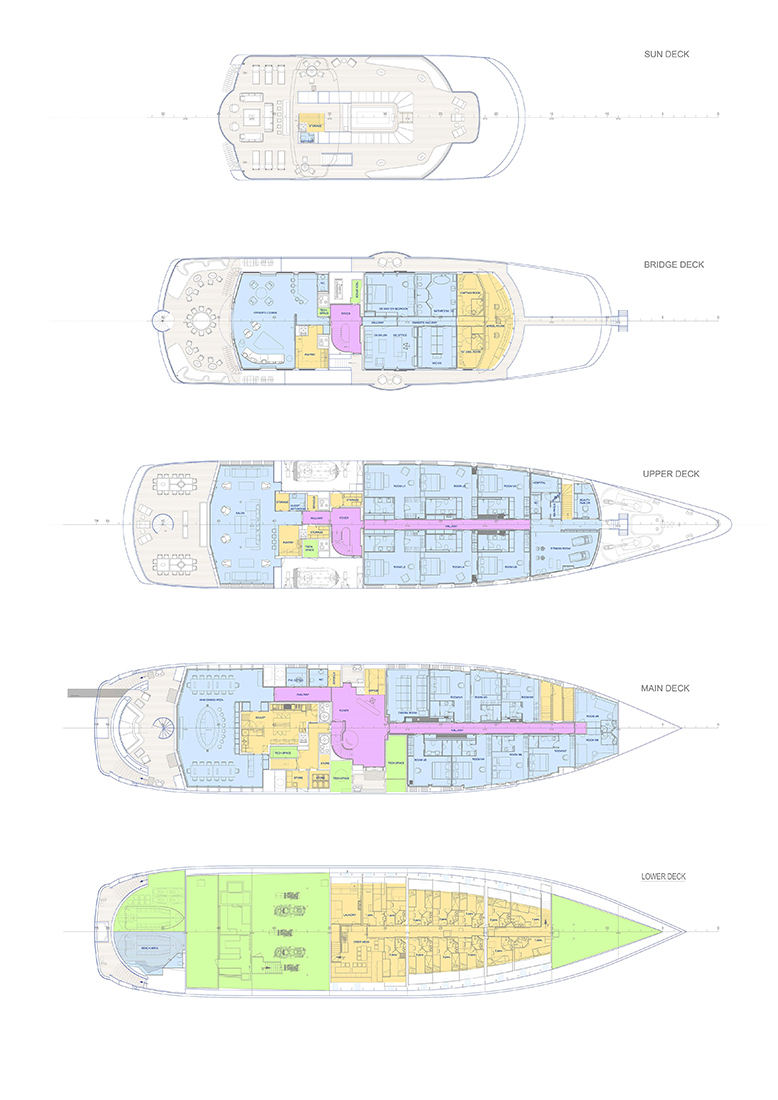 28 guests + 2 staff in 12 double cabins + 2 twins + 1 staff cabin