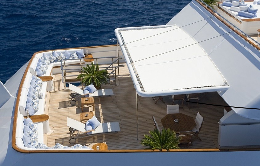 Guest Accommodation -Master cabin: Upper deck. King size + Private salon and his & hers bathroom. Shower + tub with hydromassage. -5 double cabins: 2 main deck and 3 lower deck. (VIP - tub) -5 twin cabins: 3 main deck and 2 lower deck. Showers. All cabins are equipped with phones for interior and exterior calls. MAIN DECK Main salon with ample seating area on both sides, Home cinema with a sliding down screen a projector (connected to a DVD player and SKY). Dining table for up to 20 guests. 2 double cabins and 3 twin cabins forward. Galley & pentry. LOWER DECK 2 double cabins, 1 VIP with tub and 2 twins. The cabins are connected through 2 stairsways, one at the aft entrance, and another by the dining table. UPPER DECK Upper deck salon with large bar. Private library with sat tv , sky, DVD and playstation. Alfresco dining for up to 18/20. 1 side table for 4. Seated area. Master cabin forward with Owner salon. SUNDECK 2 Large sun beds (fixed). 1 table for 4. One Jacuzzi. UPPER SUNDECK Brand new addition. Bar with a barbecue, ice maker and fridge. Comfortable seating area forward with 4 large parasols, 4 sun chairs and 1 side table for 4 people. Gym with a treadmill, bicycle, elliptical machine, power plate, weights, mats, massage table (all tecnogym).