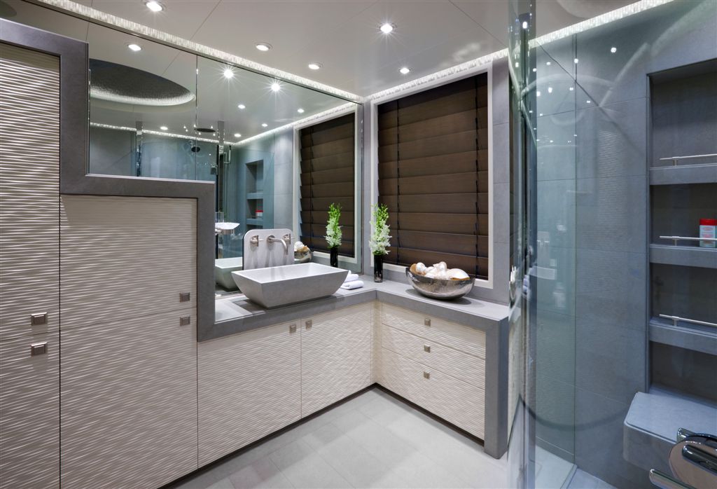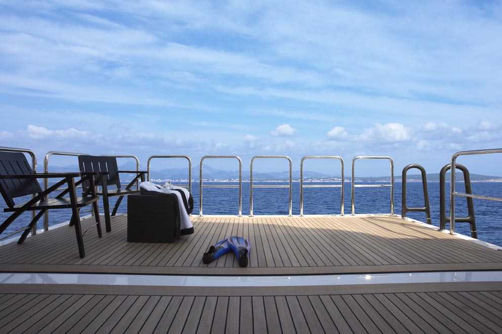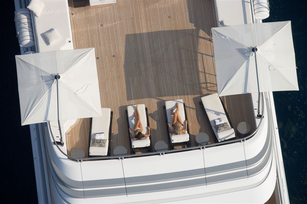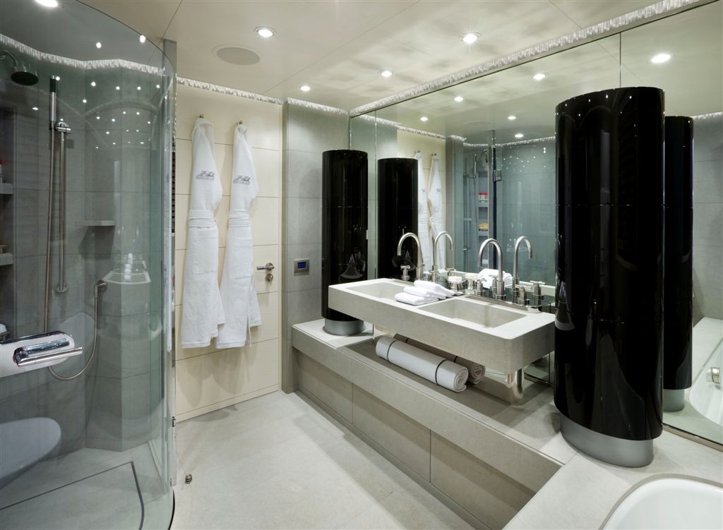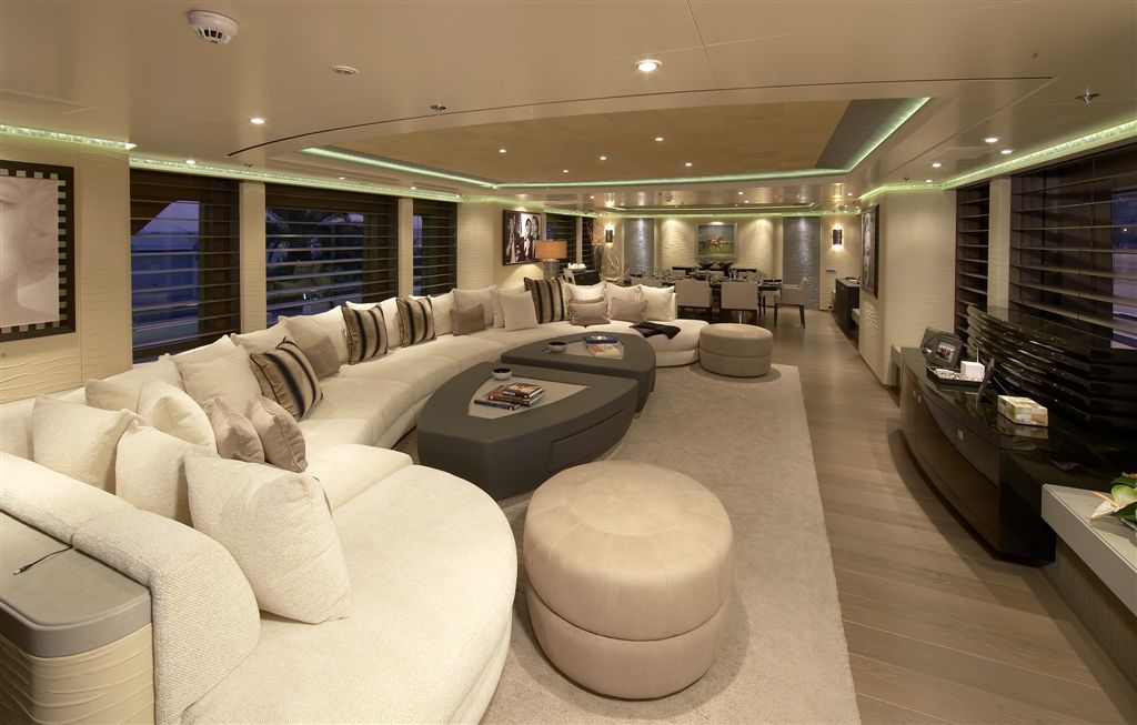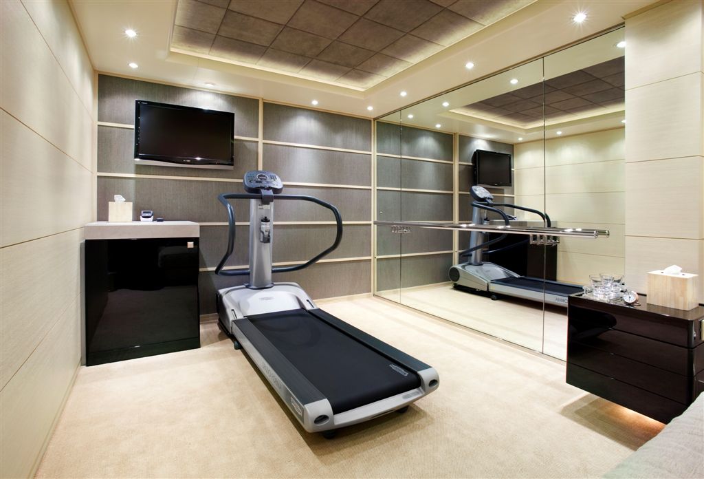 MAIN DECK The maindeck lounge is a large space with enormous couch and TV screen for a cool safe environment for the children. There is one flatscreen TV and digital surround sound. Touch screen Crestron audio-visual controls. Fibre-optic mood lighting. DVD / CD library stored on Kaleidescape and accessible on all guest TV’s. This space opens out onto a fair sized aft deck with comfortable seating. It offers dining for 12 in the traditional midships position. A staircase leads down to the beach – a 20 sq metre swimplatform with protective rails and a sturdy swim ladder. Full-width Master Stateroom on the main deck with large windows, with "his and her" bathrooms (showers only, heated floor), dressing room, lounge and study. There is plenty of storage in this room. The gymnasium (with running machine, treadmill, recumbent bicycle, mat and weights) can also be used as a cabin. It has a large comfortable single bed and a Pullman bed that can fold out of the wall, bathroom has separate shower and toilet. This is ideal for security, staff or could also be used for children. The bed in the gym is fixed and it is large for a single bed, it is 205cm = 6,72feet long by 114cm = 3,74feet wide. This space doubles as a massage room.(There is no masseuse onboard but they have a massage table) * LOWER DECK Two large double cabins with dressing rooms and bathrooms – with baths and showers. Two twin cabins with bathrooms with showers. Twin cabins are NOT convertible.