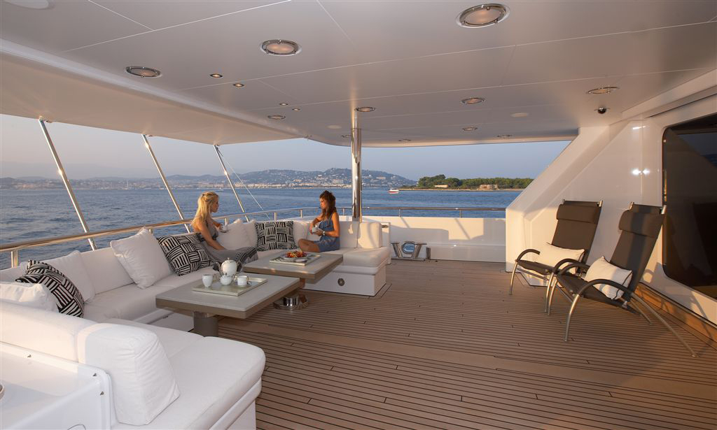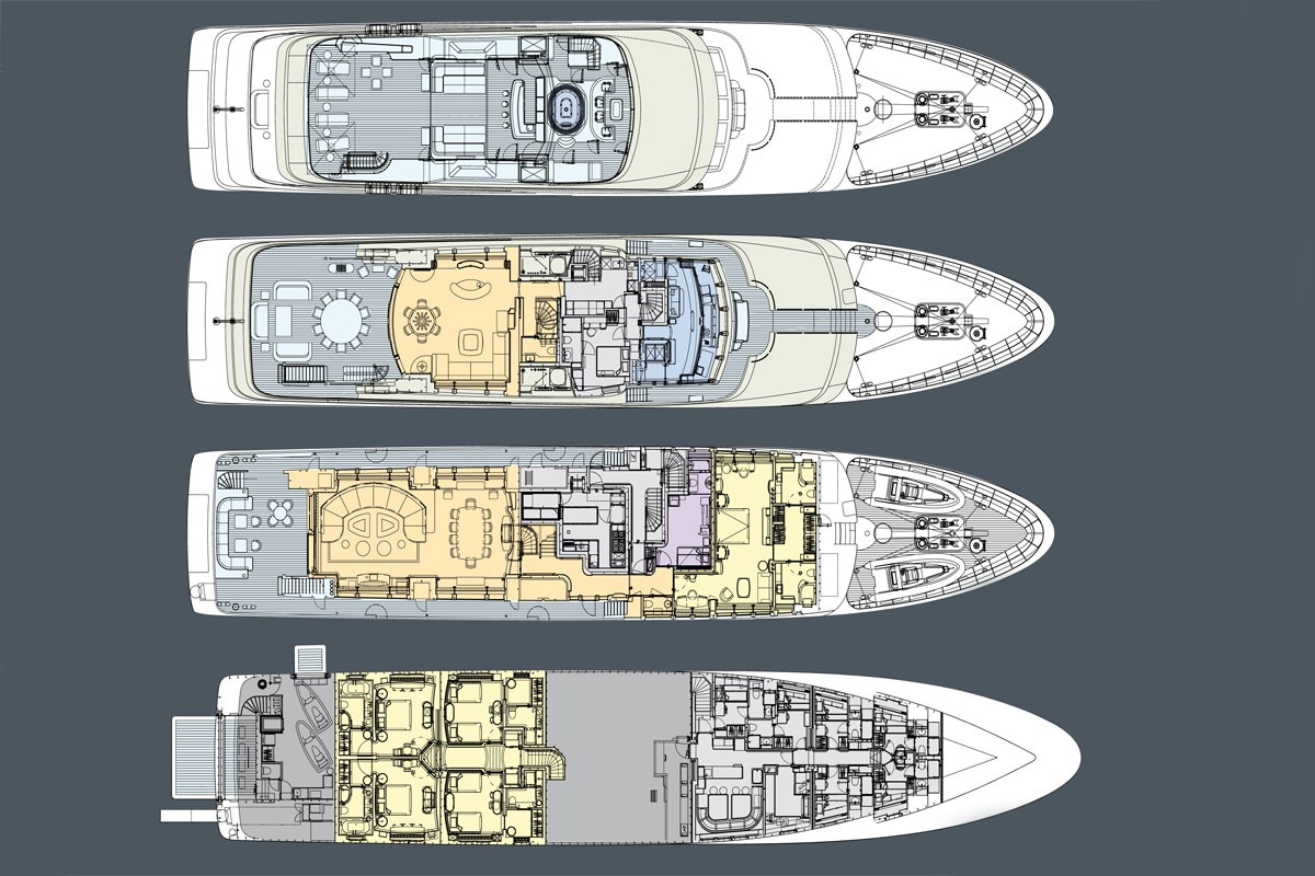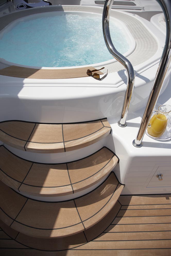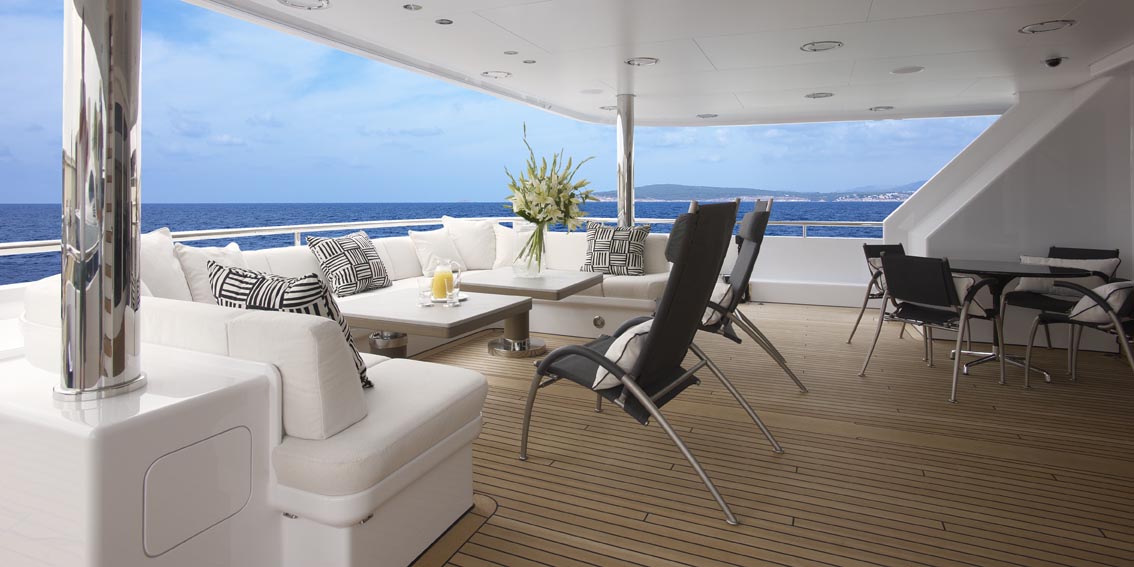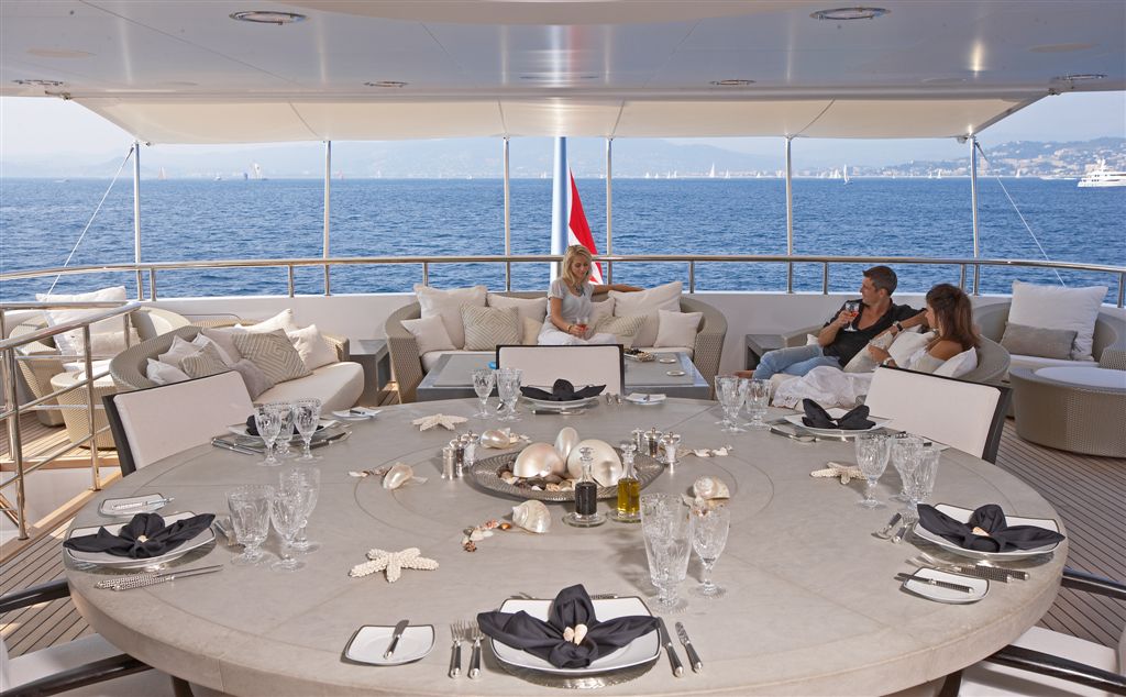 MAIN DECK The maindeck lounge is a large space with enormous couch and TV screen for a cool safe environment for the children. There is one flatscreen TV and digital surround sound. Touch screen Crestron audio-visual controls. Fibre-optic mood lighting. DVD / CD library stored on Kaleidescape and accessible on all guest TV’s. This space opens out onto a fair sized aft deck with comfortable seating. It offers dining for 12 in the traditional midships position. A staircase leads down to the beach – a 20 sq metre swimplatform with protective rails and a sturdy swim ladder. Full-width Master Stateroom on the main deck with large windows, with "his and her" bathrooms (showers only, heated floor), dressing room, lounge and study. There is plenty of storage in this room. The gymnasium (with running machine, treadmill, recumbent bicycle, mat and weights) can also be used as a cabin. It has a large comfortable single bed and a Pullman bed that can fold out of the wall, bathroom has separate shower and toilet. This is ideal for security, staff or could also be used for children. The bed in the gym is fixed and it is large for a single bed, it is 205cm = 6,72feet long by 114cm = 3,74feet wide. This space doubles as a massage room.(There is no masseuse onboard but they have a massage table) * LOWER DECK Two large double cabins with dressing rooms and bathrooms – with baths and showers. Two twin cabins with bathrooms with showers. Twin cabins are NOT convertible.