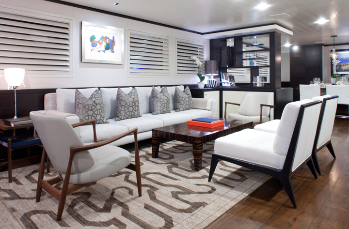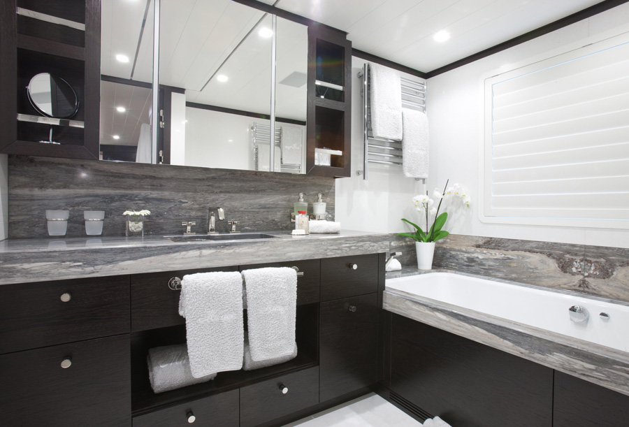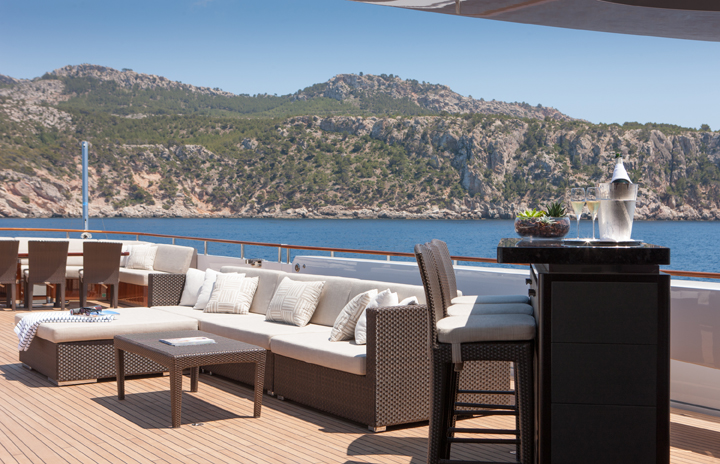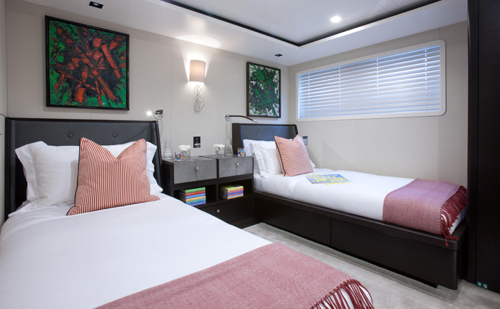 All staterooms have individual climate control and are ensuite. Each is equipped with Sonos sound system, LCD screen & DVD. Owner's Suite, Main deck, foward: KING size bed with ensuite bathroom with shower and bath and 52 inch SAT TV & DVD. VIP Suite, Main deck forward of Owner's Suite: KING size bed with ensuite bathroom (shower) and SAT TV & DVD. (2) Guest Staterooms, Lower deck: Queen size with ensuite bathroom (shower) and LCD screen & DVD. (4) Guest Staterooms, Lower deck: (4) TWIN with ensuite bathroom (shower) and LCD screen & DVD with Pullmans. SAT TV IN Master, VIP and Skylounge/Outdoor cinema. Choice of 610 daily newspapers from 76 countries in 36 languages. For static charters she can sleep up to 20 guests when safely moored to the quay.