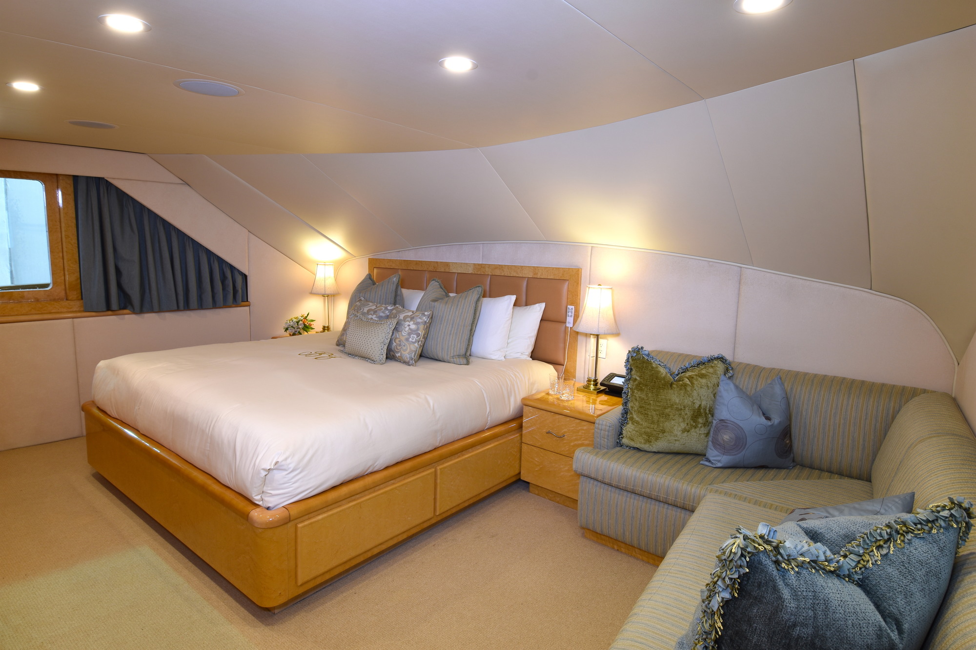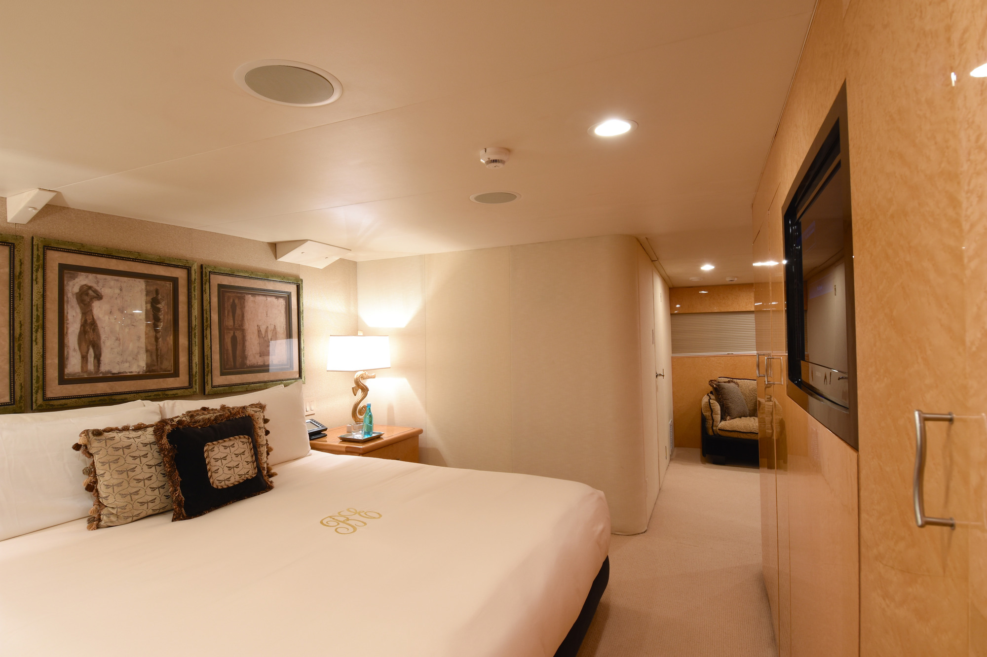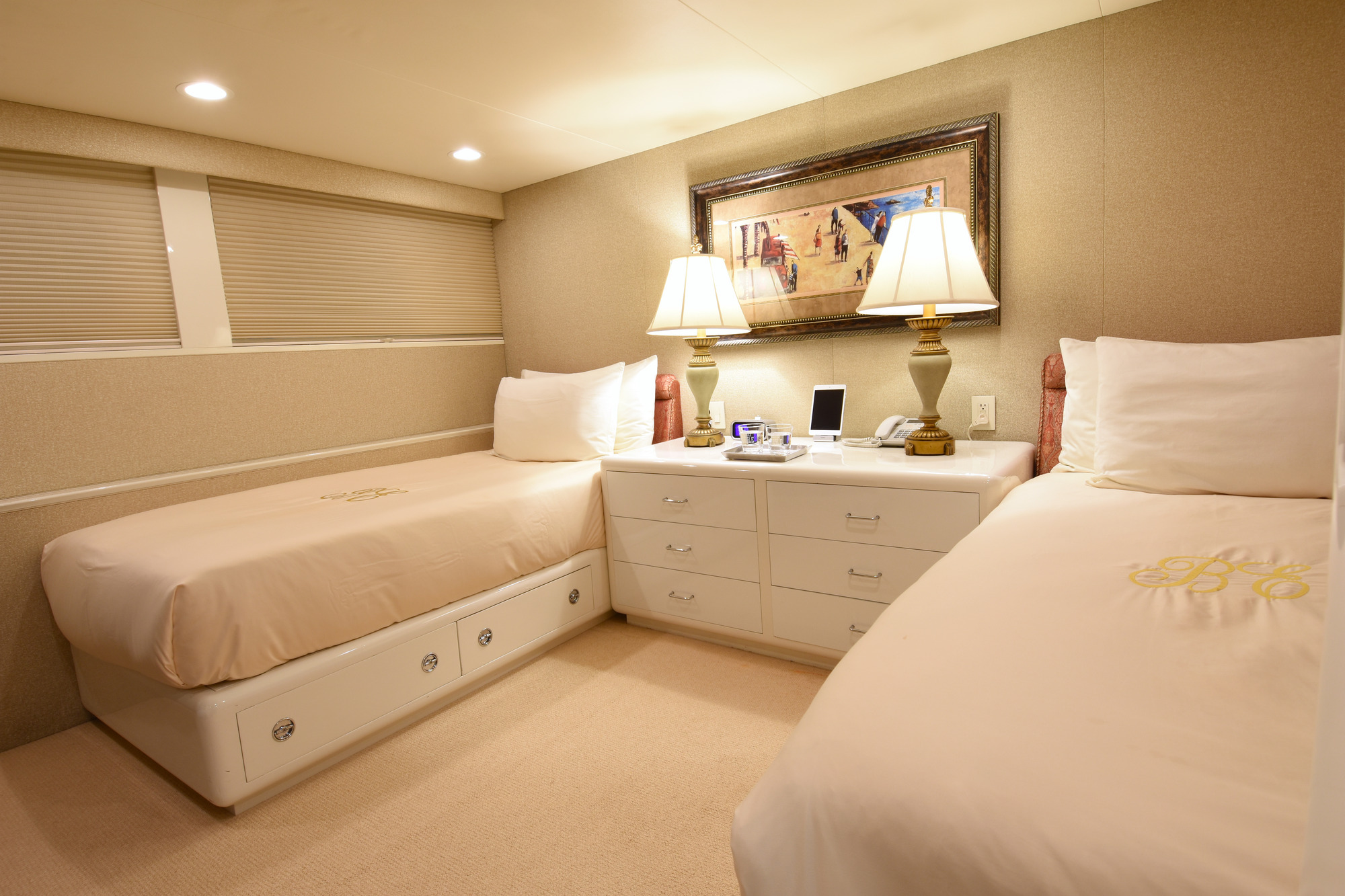 Master Stateroom - Main Deck Forward Full beam suite with King bed, desk and sitting room. Ensuite marble head with spa tub and shower. TV/DVD/CD stereo. Night blinds. VIP Stateroom - Below Deck Aft, Full beam suite with King bed. New remodeled ensuite bathroom. TV/DVD/CD stereo. Night blinds. Queen Stateroom - Queen bed, new remodeled ensuite. TV/VCR/CD stereo. Night blinds. Twin Stateroom - 2 twin beds, new remodeled ensuite. TV/DVD/CD stereo. Night blinds. Twin Stateroom - 2 twin beds, new remodeled ensuite. TV/DVD/CD stereo. Night blinds. Twin Stateroom - 2 twin beds, new remodeled ensuite. TV/DVD/CD stereo. Night blinds.