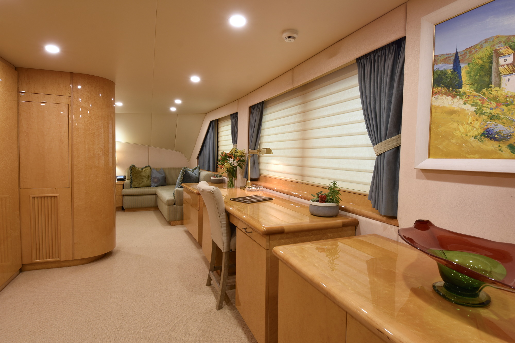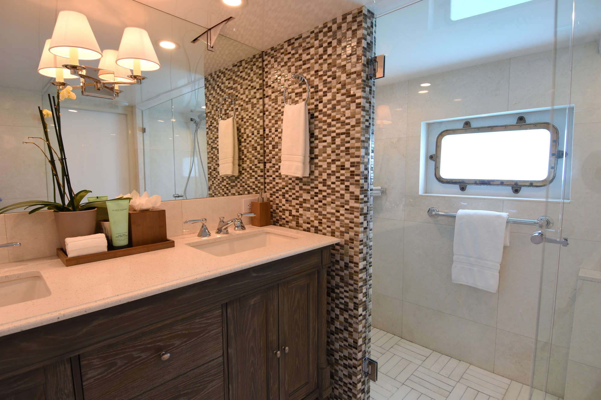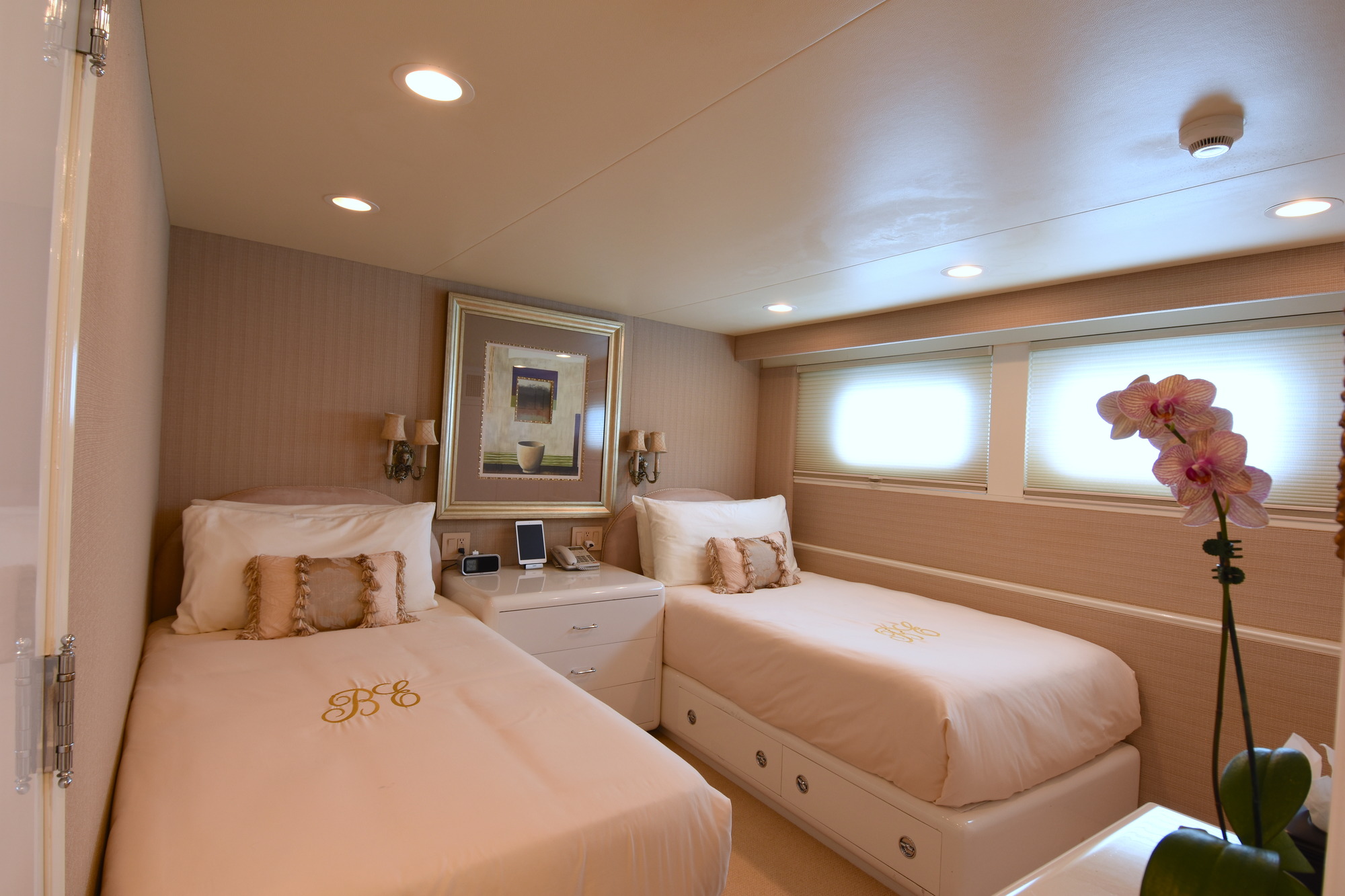 Master Stateroom - Main Deck Forward Full beam suite with King bed, desk and sitting room. Ensuite marble head with spa tub and shower. TV/DVD/CD stereo. Night blinds. VIP Stateroom - Below Deck Aft, Full beam suite with King bed. New remodeled ensuite bathroom. TV/DVD/CD stereo. Night blinds. Queen Stateroom - Queen bed, new remodeled ensuite. TV/VCR/CD stereo. Night blinds. Twin Stateroom - 2 twin beds, new remodeled ensuite. TV/DVD/CD stereo. Night blinds. Twin Stateroom - 2 twin beds, new remodeled ensuite. TV/DVD/CD stereo. Night blinds. Twin Stateroom - 2 twin beds, new remodeled ensuite. TV/DVD/CD stereo. Night blinds.