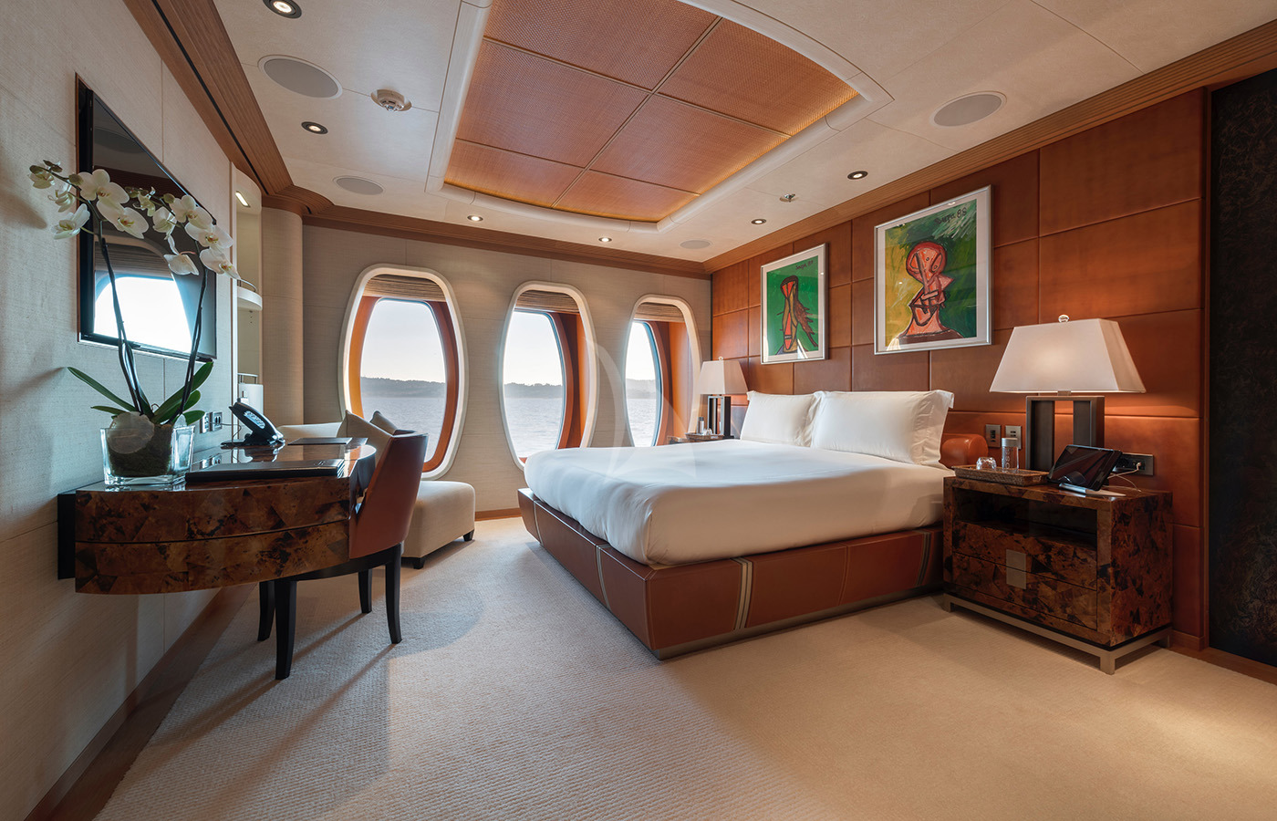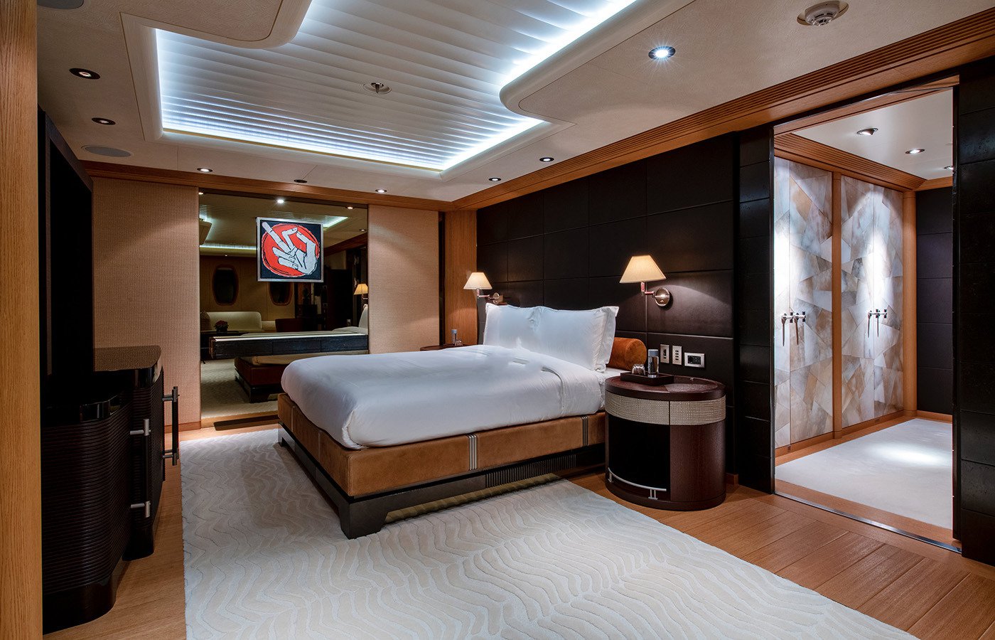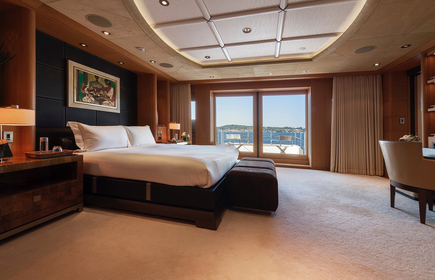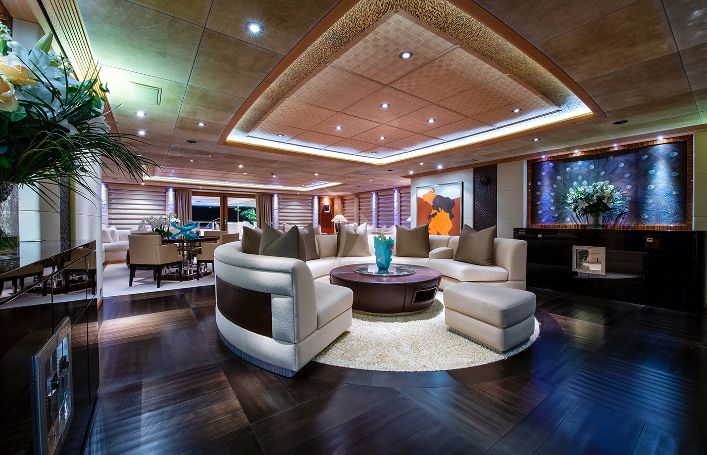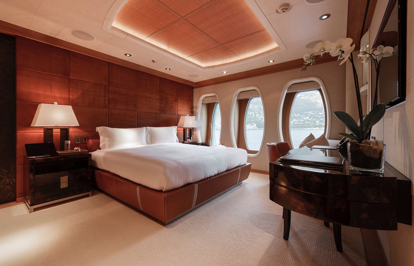 Master double suite with separate dressing room, bath and shower room en-suite, private outside deck with bbq and jacuzzi pool. Ceiling height 235cm. Super king size bed. VIP double cabin with shower room en-suite, fold-out balcony. Ceiling height 235cm. King size bed. Study– study converts to double sofabed with shower room en-suite and fold-out balcony. Ceiling height 235cm. King size bed. VIP double cabin with dressing room, bath and shower room en-suite. Ceiling height 235cm. King size bed. 2 x double cabins each with pullman, bath and shower room en-suite. Ceiling height 235cm. King size beds. 2 x twin cabins each with pullman, bath and shower room en-suite. VIP double cabin with shower room en-suite. (Beach suite cabin). King size bed. Master Cabin:.2095L x 2000W(2x1000) x 200H VIP Cabin: 2000L x 1800W x 200H Double Cabins: 2000L x 1900W x 200H Twin Cabins: 2000L x 1000W x 200H . Pullman Beds: 2000L x 800W x 120H Other:.2000L x 1800W x 150H Total of 15 beds for a total of 22 guests if you count the pullman berths and the bed in the Owner's study. Please note that the twin beds are fixed. OVERALL LAYOUT MAIN DECK The main deck holds a VIP cabin and four guest cabins which connect to each other. The large dining room can be converted into a video conference room with the optional use of the adjacent library. The standard foldable exterior bulwark assures guests an unrestricted view while dinner is served. Aft of the sleeping accommodation is a full beam lounge. OWNER’S DECK The Master suite is located on the upper deck, which is totally dedicated to her owner. The suite includes en-suite his & hers bathrooms and dressings, a private full beam lounge, a study room and a VIP cabin. Both rooms have foldable sea balconies and can also be connected with the Master suite, thus serving as one living area. In addition, the owner’s exterior foredeck hosts a whirlpool and sunbathing area. On the spacious aft deck two round tables can convert into one very large oval dining table for up to 22 guests.