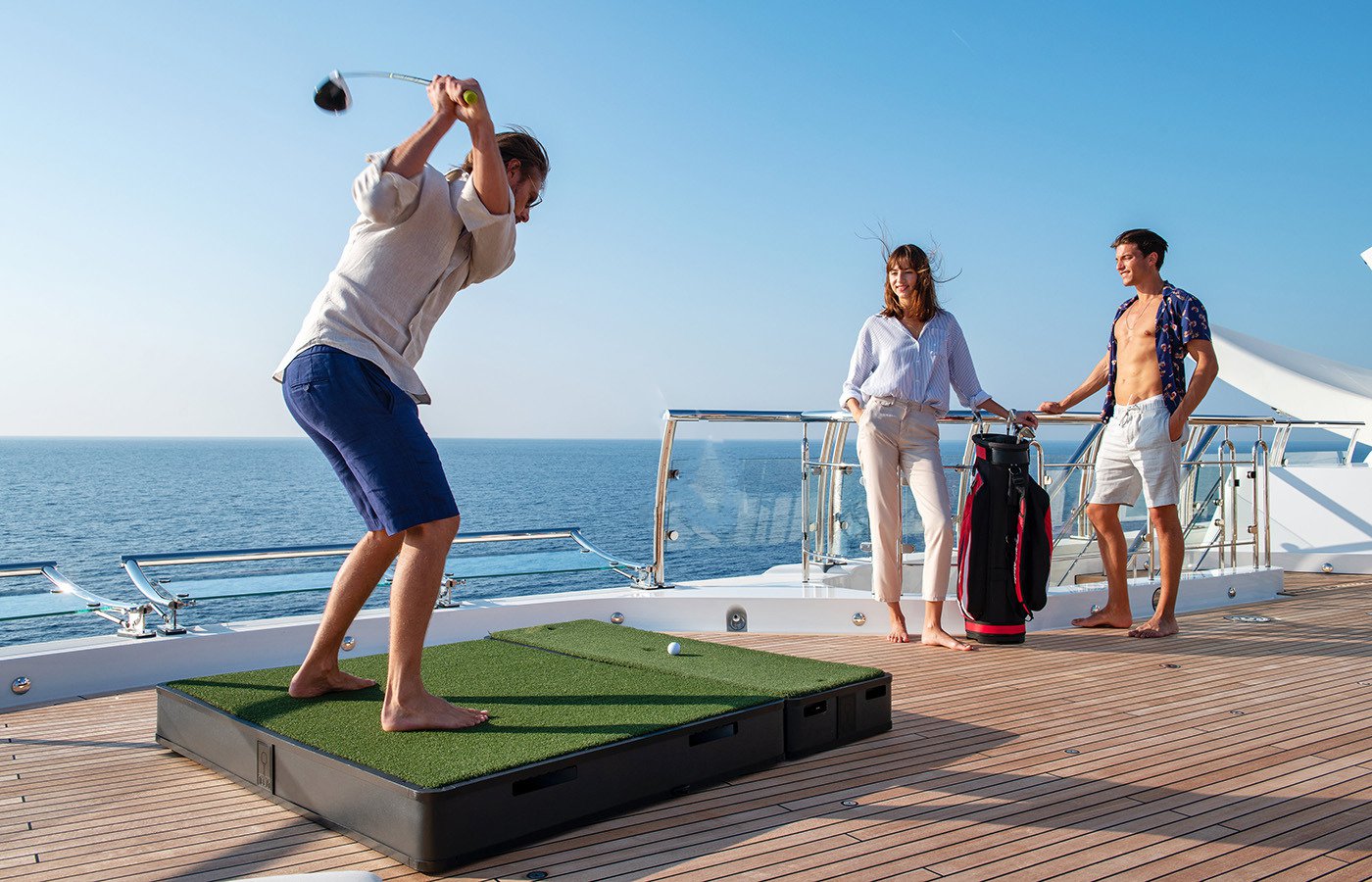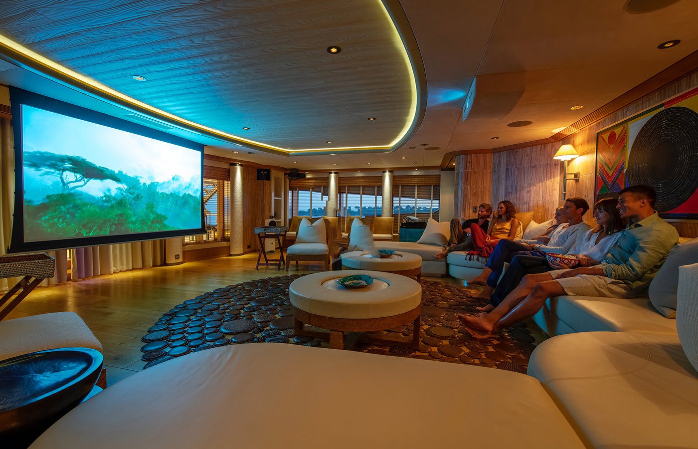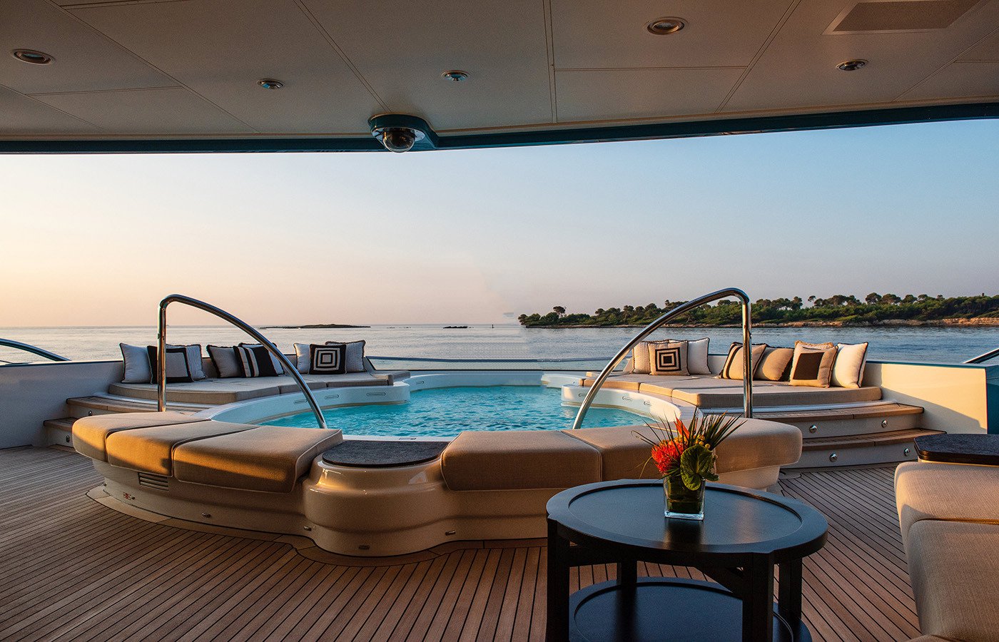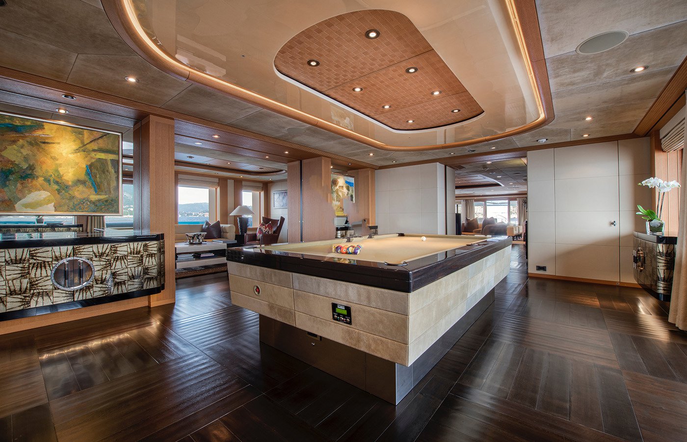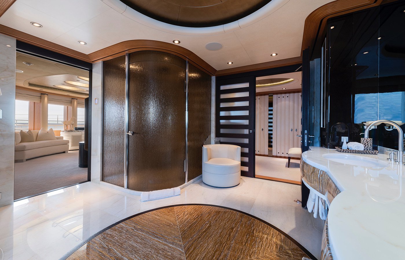 Master double suite with separate dressing room, bath and shower room en-suite, private outside deck with bbq and jacuzzi pool. Ceiling height 235cm. Super king size bed. VIP double cabin with shower room en-suite, fold-out balcony. Ceiling height 235cm. King size bed. Study– study converts to double sofabed with shower room en-suite and fold-out balcony. Ceiling height 235cm. King size bed. VIP double cabin with dressing room, bath and shower room en-suite. Ceiling height 235cm. King size bed. 2 x double cabins each with pullman, bath and shower room en-suite. Ceiling height 235cm. King size beds. 2 x twin cabins each with pullman, bath and shower room en-suite. VIP double cabin with shower room en-suite. (Beach suite cabin). King size bed. Master Cabin:.2095L x 2000W(2x1000) x 200H VIP Cabin: 2000L x 1800W x 200H Double Cabins: 2000L x 1900W x 200H Twin Cabins: 2000L x 1000W x 200H . Pullman Beds: 2000L x 800W x 120H Other:.2000L x 1800W x 150H Total of 15 beds for a total of 22 guests if you count the pullman berths and the bed in the Owner's study. Please note that the twin beds are fixed. OVERALL LAYOUT MAIN DECK The main deck holds a VIP cabin and four guest cabins which connect to each other. The large dining room can be converted into a video conference room with the optional use of the adjacent library. The standard foldable exterior bulwark assures guests an unrestricted view while dinner is served. Aft of the sleeping accommodation is a full beam lounge. OWNER’S DECK The Master suite is located on the upper deck, which is totally dedicated to her owner. The suite includes en-suite his & hers bathrooms and dressings, a private full beam lounge, a study room and a VIP cabin. Both rooms have foldable sea balconies and can also be connected with the Master suite, thus serving as one living area. In addition, the owner’s exterior foredeck hosts a whirlpool and sunbathing area. On the spacious aft deck two round tables can convert into one very large oval dining table for up to 22 guests.