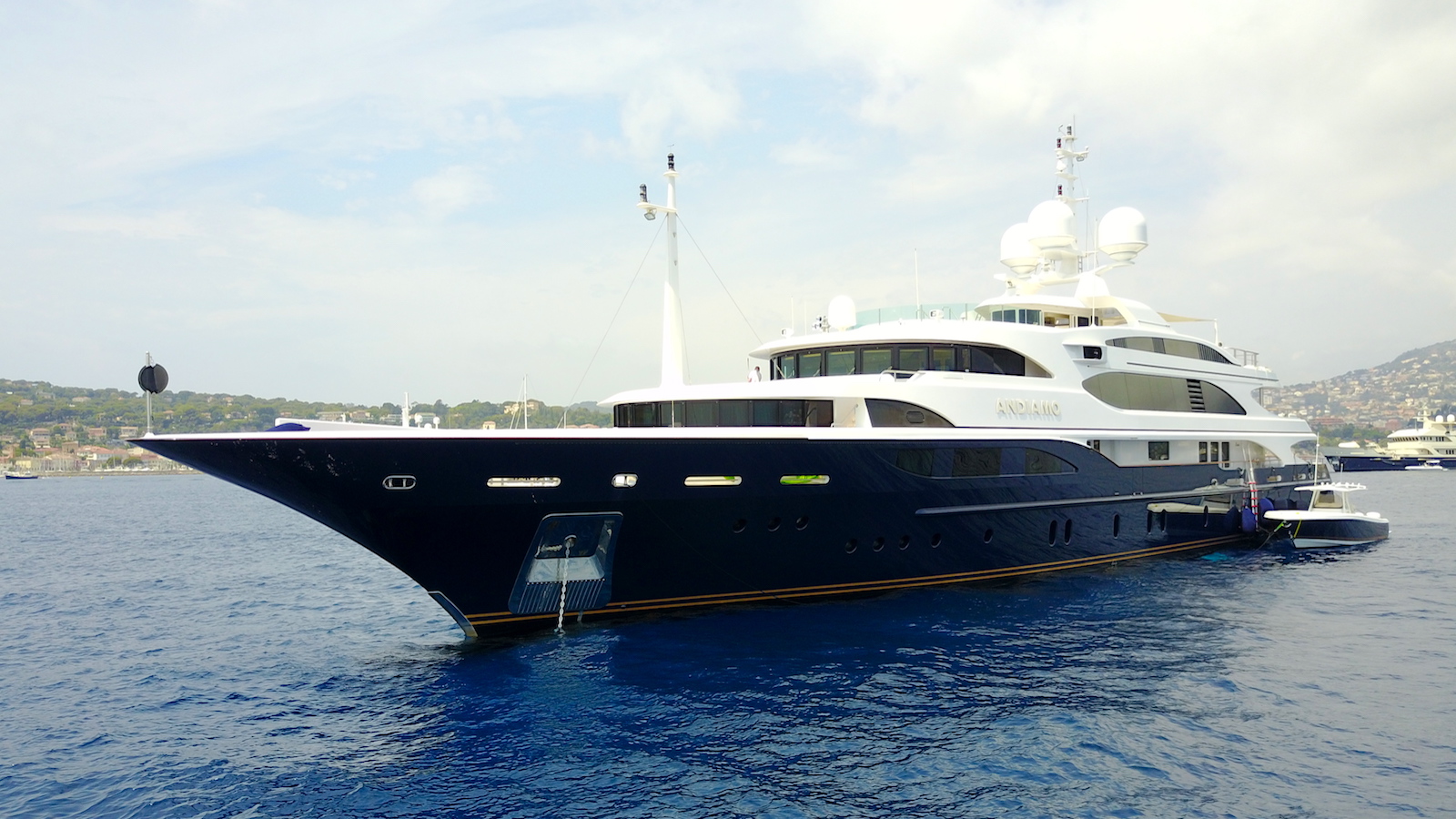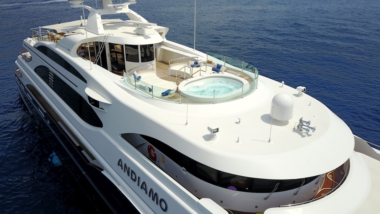 ANDIAMO is a fabulous 6 stateroom yacht and a well-known player in the international luxury charter market. She was built in 2009 and had a major interior refit in Spring 2017 along with a new dark blue hull. With classic exterior styling by Benetti and her new chic interior by Patrick Knowles Designs, ANDIAMO will continue to be a highly sought after choice for luxury charter.WALK THROUGH MAIN / DINING SALON. Open plan. Sofa, cocktail table and 2 arm chairs both port and starboard Formal dining area forward Powder room and elevator off foyer MAIN AFT DECK U-shaped stern seating with 2 cocktail tables, 2 chairs Staircase to starboard for access to stern Stern folds down to swim platform / "beach club". Sauna for 2 persons within stern area Passerelle / port side boarding SKYLOUNGE Sofa, cocktail table and 2 arm chairs port and starboard Wet bar with 2 stools aft port / game table starboard Xbox VIP queen guest stateroom Powder room SKYLOUNG AFT DECK Stern built-in seating port and starboard, each with cocktail table 2 arm chairs Dining for 12 SUNDECK Forward: raised area with jacuzzi and sun beds under shade awnings, 2 x umbrellas Central area: GYM: air-conditioned with treadmill, spinning bike, rowing machine, free weights Dining aft under shade awning. Built in sofa with cocktail table to starboard. Service area to port. BBQ Aft: raised area with 4 chaise lounges and moveable seating under optional shade awnings ______ SPECIAL FEATURES: **6 Staterooms **Full width Master on main deck with private observation lounge **VIP Queen on bridge deck **Sundeck with raised entertaining areas fore and aft **Jacuzzi on sundeck **Alfresco dining on Skylounge aft deck and Sundeck (central area) **Elevator to all decks **Beach Club with Sauna
