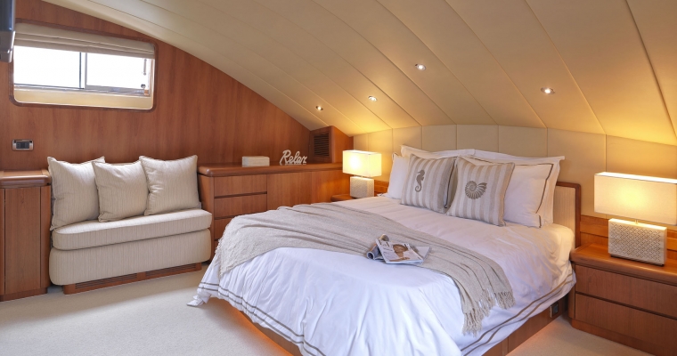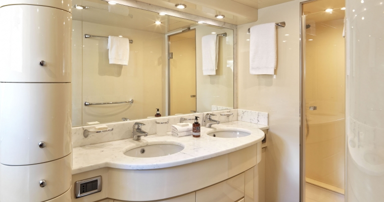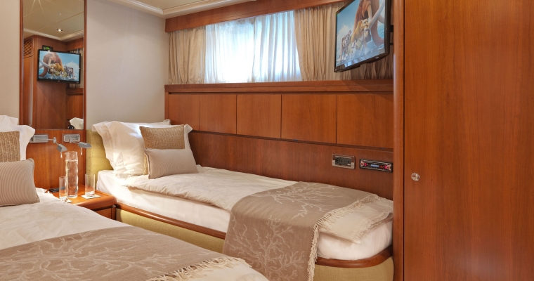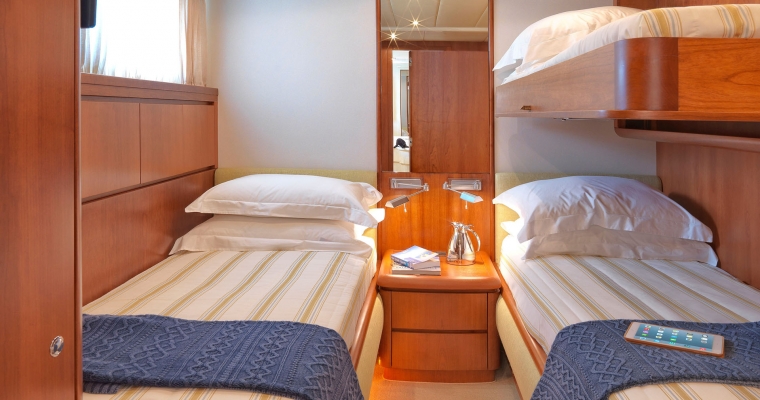 Lower deck: One Master cabin. One VIP cabin. Two cabins with twin beds convertible to double beds plus a Pullman berth. Upper deck: One double cabin. En suite private facilities in all cabins.