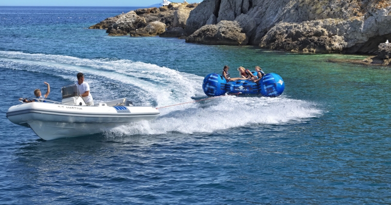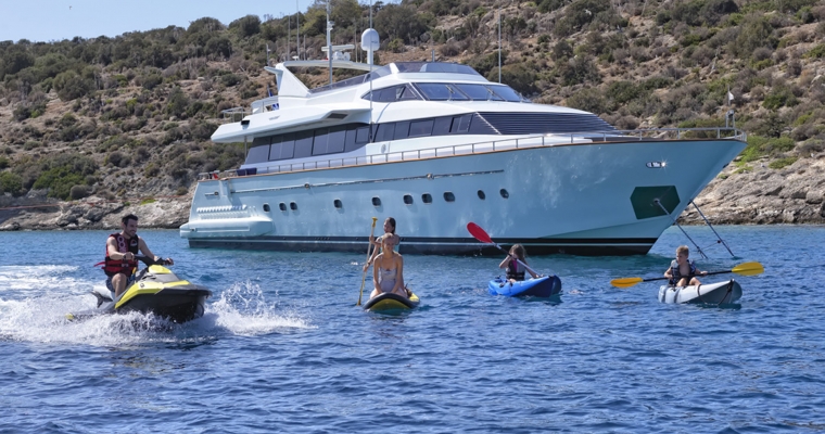 Tenders & Toys: One Novurania 4.6m with 90hp Yamaha outboard, one Jetski Seadoo Spark (3 seats), water ski, folding bicycle, wakeboard, SUP, various inflatable water toys, snorkeling and fishing equipment. Audio Visual Equipment and Deck Facilities: 3G WiFi, Audio, Home Cinema Equipment, Cable & SAT TV in all cabins. Mini iPads with playlists in all cabins, movie index, internet access. Extended movies library with more than 800 titles in hard discs, iPad with extended music library (organized in playlists). Go Pro camera , Printer/Scanner/Copier.