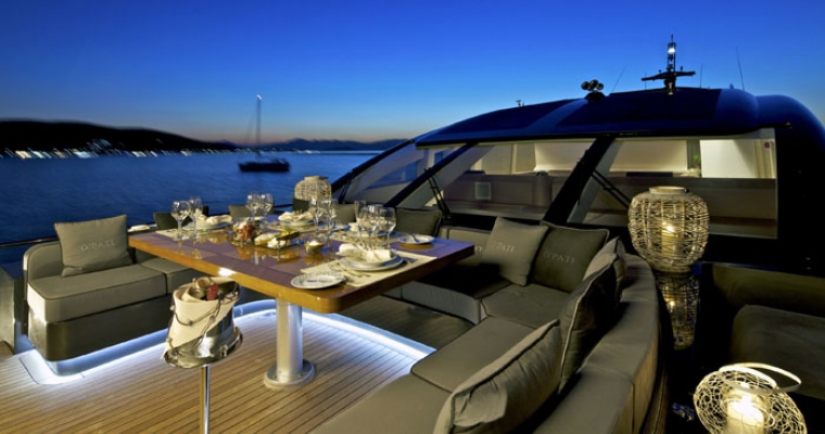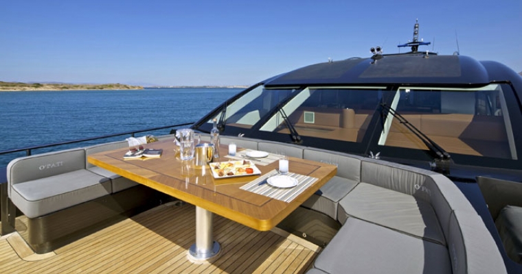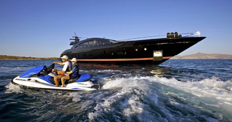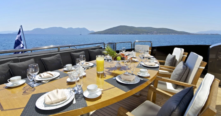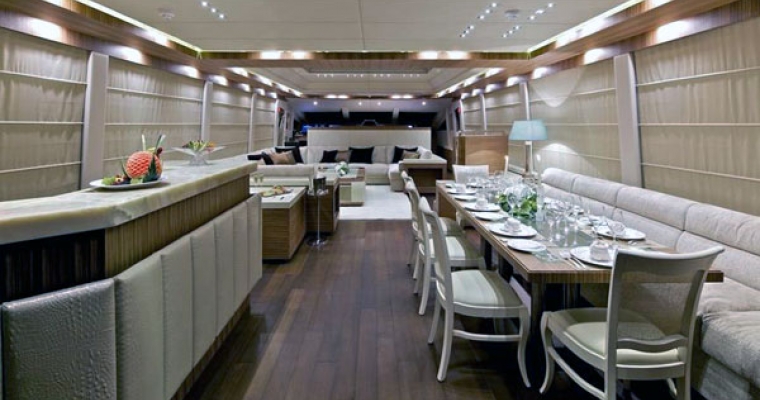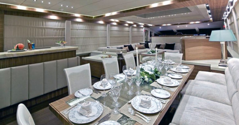Tenders & Toys: One ZAR 5.30m tender with 140hp outboard, one jet ski 3 seat Kawasaki, sea bob, water ski equipment, wake board, tubes, stand up paddle SUP fishing and snorkeling equipment. Fly board upon request. Rendezvous diving only. Audio Visual Equipment and Deck Facilities: LCD Monitors, Home Cinema System and AV surround system in all staterooms and salons. CD/DVD/Blue Ray/mp3 player, PS3, PS4, Satellite receivers, ios devices compatibility, Airplay, Apple tv, I pads. Communications: SATCOM, Satellite and 4G Internet connection at all areas.