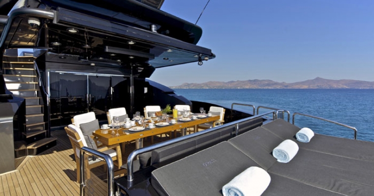 A unique 40m open yacht in the East Med market with a minimal interior environment. This impressive modern motor yacht with her dark hull and sleek powerful lines designed by Giorgio Vafiadis, was built in 2011 by Golden Yachts, in Greece and has been awarded by International Super Yachts Society as the Best Power Yacht 24-40 meters. Her spacious exterior areas offer large sunbeds for sunbathing lovers and ample space for al fresco lunches under the large retractable automatic awning. Her stylish minimal interior in leather, wood and high quality fabrics features a main salon with a luxuriously sized central sofa with home theatre and a comfortable dining area on main deck.