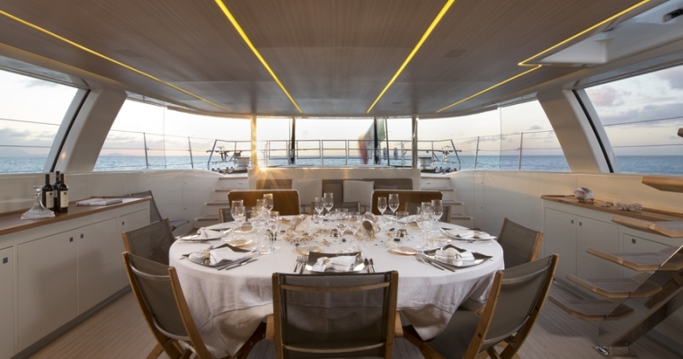 Audio Visual Equipment and Deck Facilities: DECK FACILITIES: Dining Room In the main saloon, with an exquisite black marble dining table and views through the starboard windows and the glass floating stairs Main Saloon Includes the bar, cinema and lounge area, with glass floating stairs accessing the flybridge Main Deck The main deck has an outside dining and lounging area Flybridge The flybridge has two helm stations as well as sofas and sunbeds for guests to lounge while enjoying the views from up top Aft Cockpit The aft cockpit has a large sunbeds area next the swimming platform ENTERTAINMENT EQUIPEMENT: – Satellite receiver throughout the yacht Main Saloon – 55” full HD LED TV – IPod docking station Seating Aft Deck (Cockpit) – Waterproof speakers, 4 – iPod Airplay Sundeck (Flybridge) – Waterproof speakers, 4 – iPod Airplay Owner’s Stateroom – 40” full HD LED TV – iPod docking station Guest Cabins – 32” HD LED TV – iPod docking station