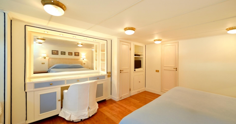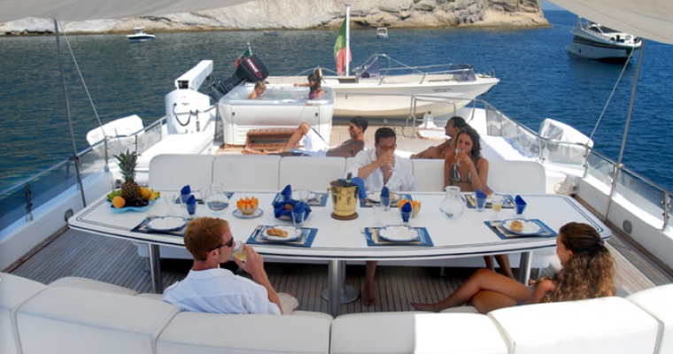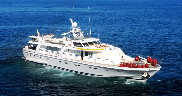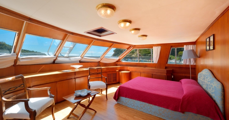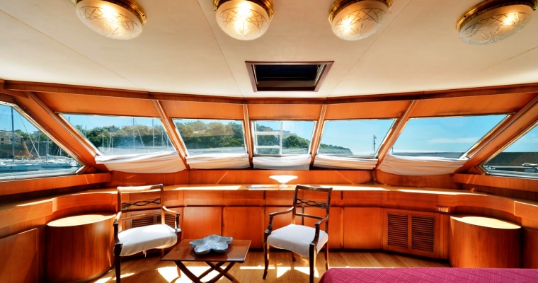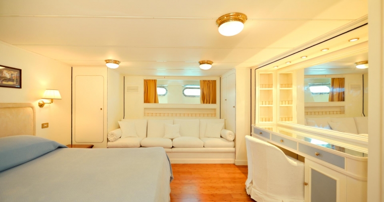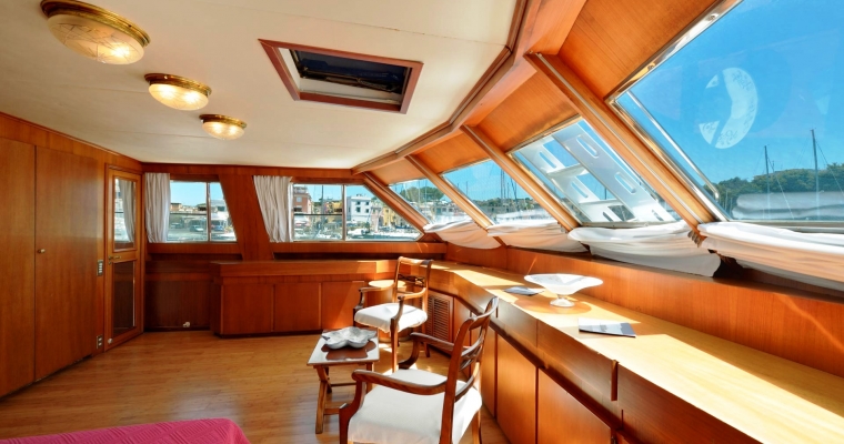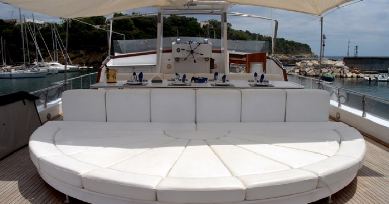 A splendid example of Italian shipbuilding, Nafisa is a classic “Gentlemen's yacht" with its expansive deck spaces that make her ideal to those who really wish to experience life on the sea. Rebuilt in 1995, Nafisa is in excellent conditions also thanks to a refit in 2015, including complete hull and superstructure painting. She has also been equipped with brand new furniture and tapestries, a new sofa in the saloon, parquet in all cabins and the teak deck has been completely refitted. She offers comfortable accommodation for 10 guests in a magnificent full beam Owner' s stateroom, a VIP suite, 2 spacious twin cabins and 1 additional double cabin Nafisa boasts very ample open spaces, offering a variety of different seating and lounging areas: on the fly bridge, two huge sofas, an al fresco dining area and a fantastic 4 seats Jacuzzi to relax while admiring the breathtaking views of the Mediterranean landscapes. On the main deck Nafisa hosts a huge salon, a beautiful relax area at stern with a coffee table and sofas and a beautiful solarium on the foredeck. Stable, comfortable and stylish, Nafisa is the perfect choice for unforgettable cruising holidays.
