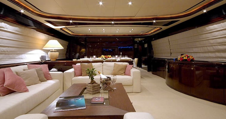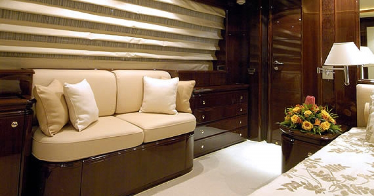 TWO-KAY (ex: Bo Veerle, Rasha) is the first Custom Line 112 flagship yacht by Ferretti, launched in 2001, with a refit in 2016, she measures 34m (112ft) and can accommodate up to 10 guests in 5 cabins. Built to the highest standards by the Zuccon International Project workshop, with great attention to external and internal design, the latter in collaboration with the CRN engineering division of which Custom Line is part, TWO-KAY offers a modern interior with clean lines. She is a very practical yacht with a good functional layout and neutral pleasing decor. Her salon is comfortable, cozy and offers ample seating space, with three sofas to port side, around a big coffee table. It leads on to the open plan formal dining area, large enough to seat a group of 10/12 people, ideal for indoor meals in the company of family and friends. Her full beam master suite is located forward of the main deck, whilst the 4 guest staterooms are located below. This luxurious motor yacht also offers striking exterior styling with teak decks and an excellent aft deck area where it is possible to enjoy shaded alfresco dining. She also boasts a lovely Flybridge with a vast sunbathing area, Jacuzzi, settees and a barbecue, ideal for entertainment out in the sun. The stern area offers a spacious garage large enough for a 5 metre tender and a jet ski and this charter yacht offers all sorts of toys for the pleasure of the water lovers. TWO-KAY has 2 x MTU 12V4000, V12 diesel engines rated 2040 kw @ 2.100 rpm each with ZF direct drive gearbox. She cruises at speeds of 23 knots with top speeds of 27 knots.
