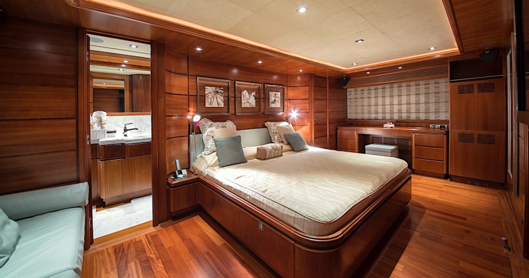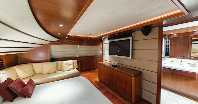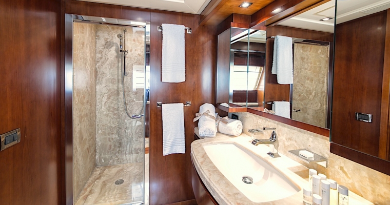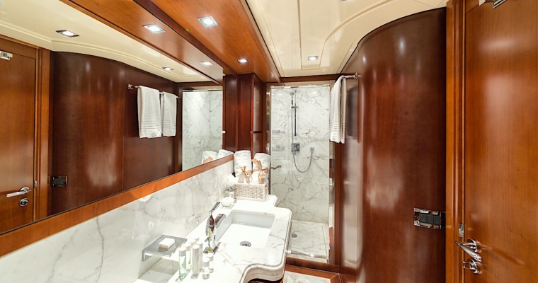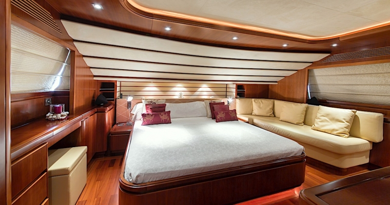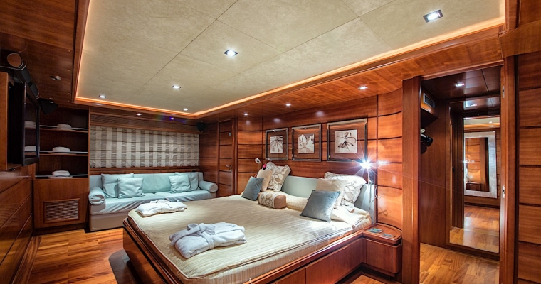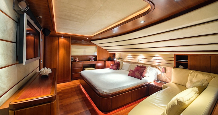 MASTER bedroom on the main deck with King size bed, sofa, vanity unit, walk-in wardrobe, toilet, shower. Possibility to use the sofa bed to accomodate one child. VIP cabin full-with in the lower deck with king size bed, sofa, vanity unit, walk-in wardrobe, toilet, shower GUEST cabin with double bed, toilet and shower GUEST cabin with twin beds and pullman bed, toilet and shower
