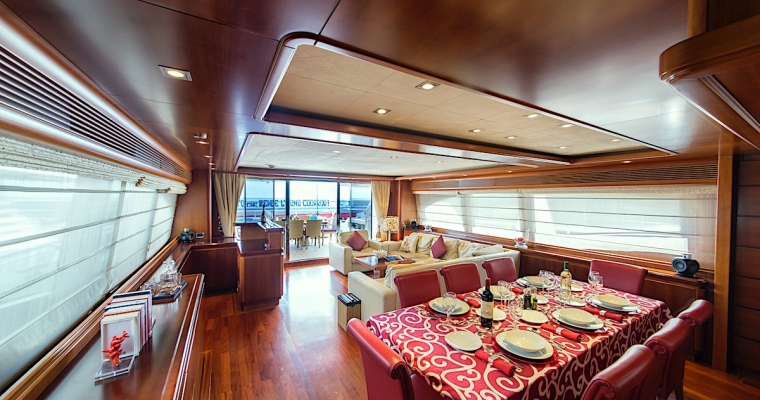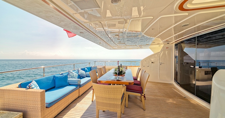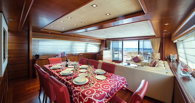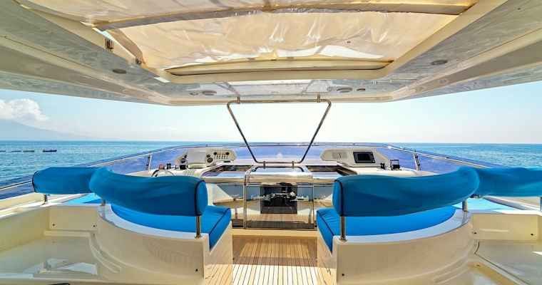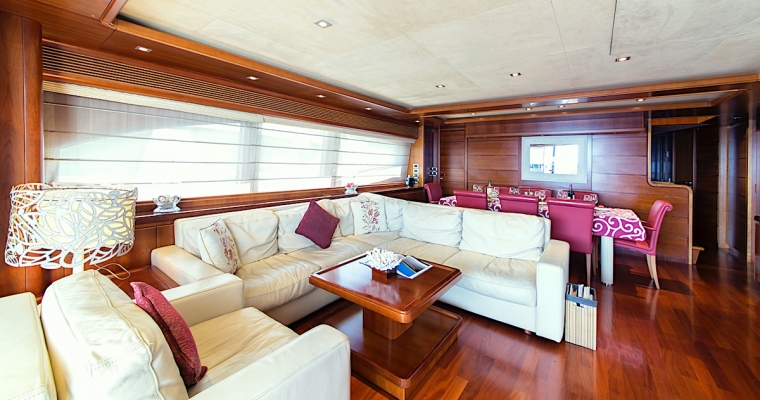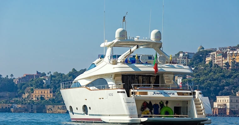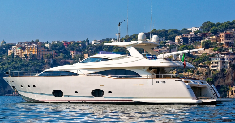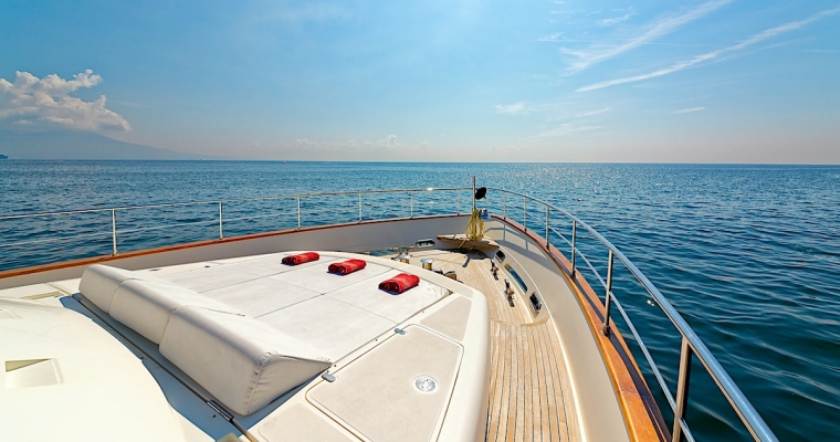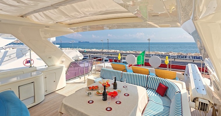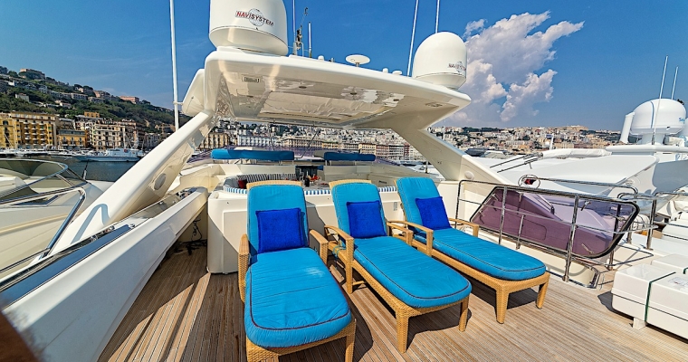 Launched in 2008 by Italian shipbuilder Ferretti group, motor yacht ANNE MARIE features elegant interiors, spacious deck areas, salon and dining designed as an open space. A cozy lounge featuring sofa, coffee table and entertainment system is aft. Forward is a formal dining table seating up to 9 guests. Guest can enjoy amazing views through the newly designed panoramic windows in every stateroom and all over the yacht, through which natural light can infuse the stylish space. ANNE MARIE boasts 4 amazing en-suite cabins, 3 double and 1 twin-bedded with a Pullman berth, all located below decks, to sleep up to 10 charter guests (9 adults + 1 child). She also offers a highly professional crew of 5, who will ensure an unforgettable charter experience. A fully equipped bar is set on the starboard side, and guests will also find a spacious wine cooler. The dining area can seat up to 8 guests, it features a 42-inch plasma TV folding down from the ceiling. The aft deck is the ideal place to have an alfresco meal, a relaxed breakfast, evening cocktails among friends, romantic dinners. The table here can seat up to 10 guests, the area features a large additional sofa facing the stern, a 37” B&O TV, automatically lowered from the ceiling. The splendid Fly Bridge is the ideal place to relax, to have a barbecue with friends or enjoy a sunset. The sun deck boasts cooking facilities and a dining area for up to 10 people. ANNE MARIE offers a good range of amenities such as a Yamaha Jet Ski, Wake board, a 4,5 mt Castoldi Jet Tender, a 3 mt Novamarine Tender with 15 HP Yamaha engine, a banana boat, water skis and snorkeling gear.