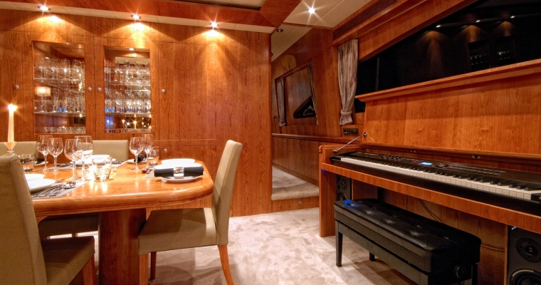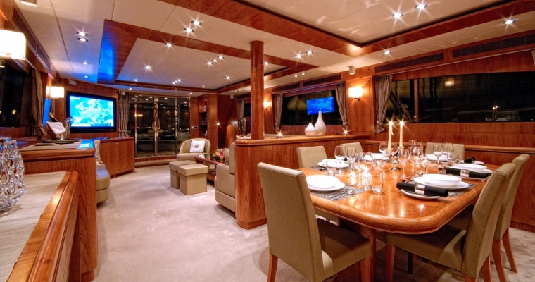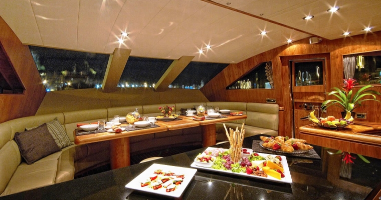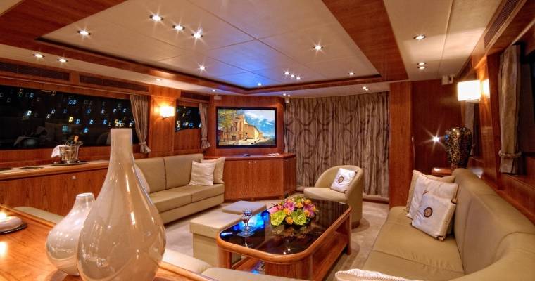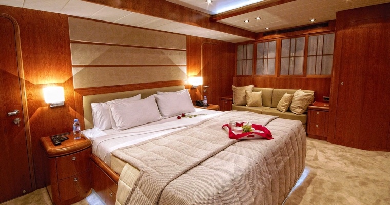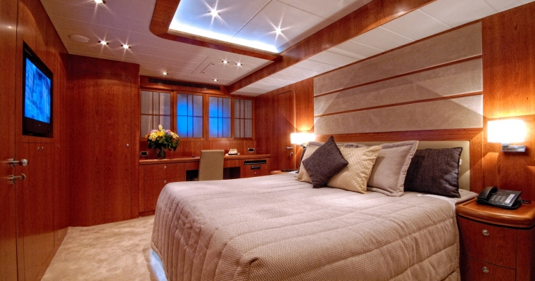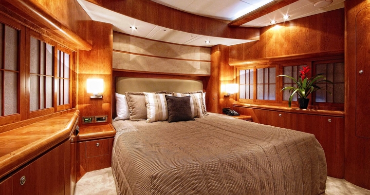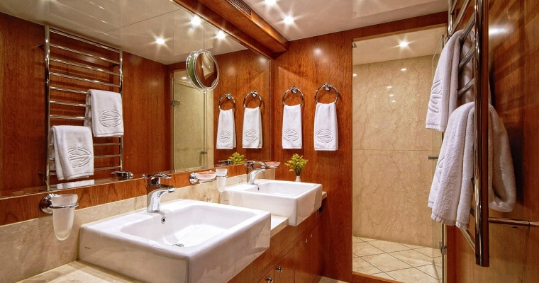 Four Staterooms consist of 1 Master, 1 VIP and two twins, each with an additonal pullman. All cabins have ensuite bathrooms. The master stateroom features a large walk around king size bed and a large closet with a built in safe. The master has plenty of storage and a small sitting area comfortable for two. The ensuite features ‘his and hers’ basins and a large walk-in shower. The VIP is also spacious with a centrelined queen bed and ensuite. Both twin cabins are fitted with two single beds and one pullman berth plus an ensuite bathroom. These cabins can convert with the two single beds turning into a full cabin width king sized bed. Berth measurments: Master berth is 2.0 metres in length. / Master is 1.87 meters wide. VIP berth is 1.97 metres in length. / VIP is 1.73 meters wide. Mid Cabin berth's are 1.95 metres in length. / St'bd Mid Cabin is 2.00 meters wide ( configured as King ). Mid Cabin berth's are 1.95 metres in length. / Port Mid Cabin is 2.09 meters wide ( configured as King ).