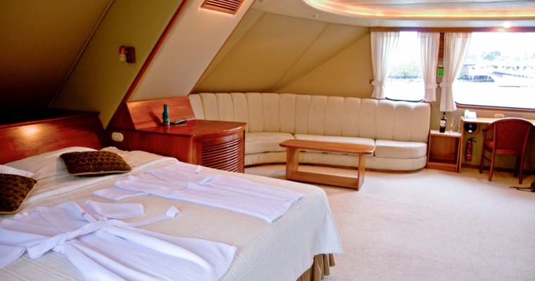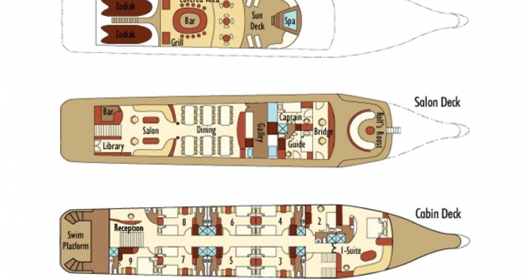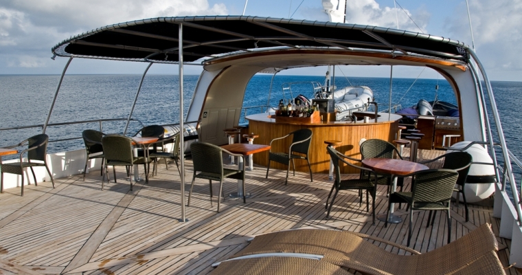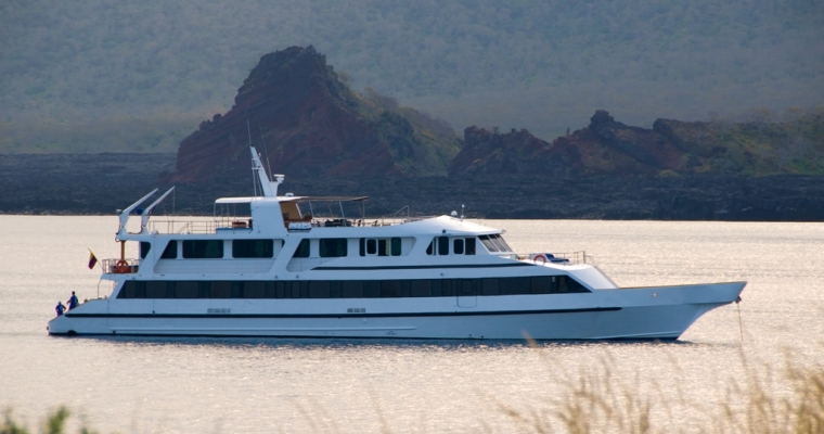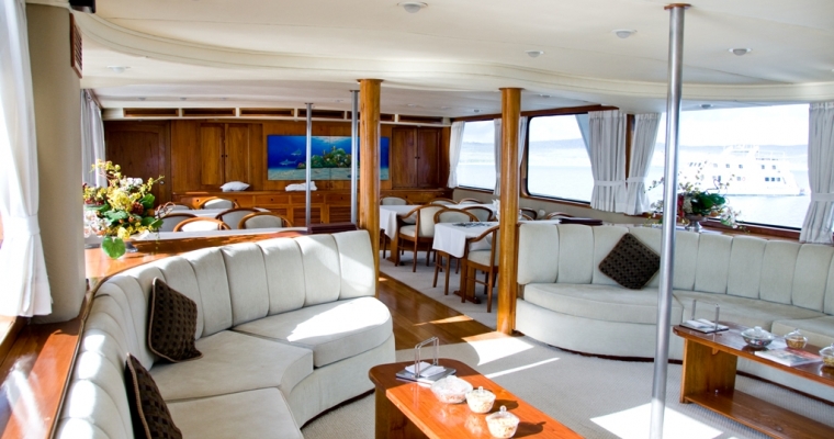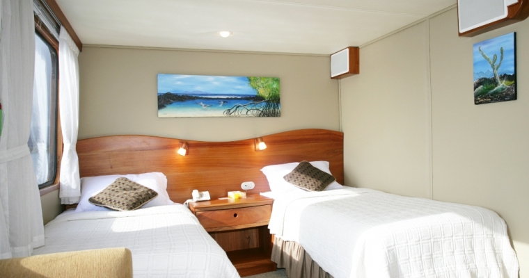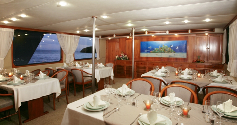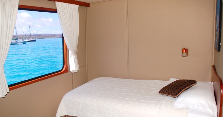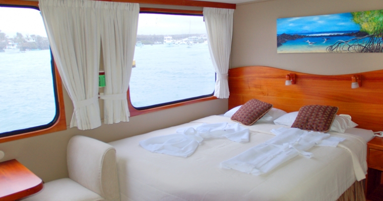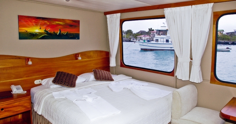 STATEROOMS: All 9 staterooms are located on the main deck: 1 Master King bed Suite (non-convertible), 1 Queen Bed Stateroom (non-convertible), 1 twin bed stateroom (non-convertible), 1 single bed stateroom (non-convertible) and the rest of the cabins can either be twin beds or converted to king beds. Each stateroom has large picture windows, individual climate control, satellite telephone, a stocked refrigerator, and an entertainment center with CD/DVD and LCD monitor. Bathrooms are en suite with a full-size shower and lavatory. MAIN SALON: The comfortable salon has a bar and is bathed in natural light, perfect for reading or listening to lectures on Galápagos natural history and geology, and enjoying snacks and beverages. A wide-screen media center is hidden behind the painting of undersea life and is available for viewing the day's images as well as the naturalist's informative presentations. SUNDECK: On the partially covered top deck, you'll find an on deck Jacuzzi, bar, BBQ, tables with chairs, and comfortable chaise lounges. It´s a place to relax, enjoy a beverage or nap in the gentle breezes.