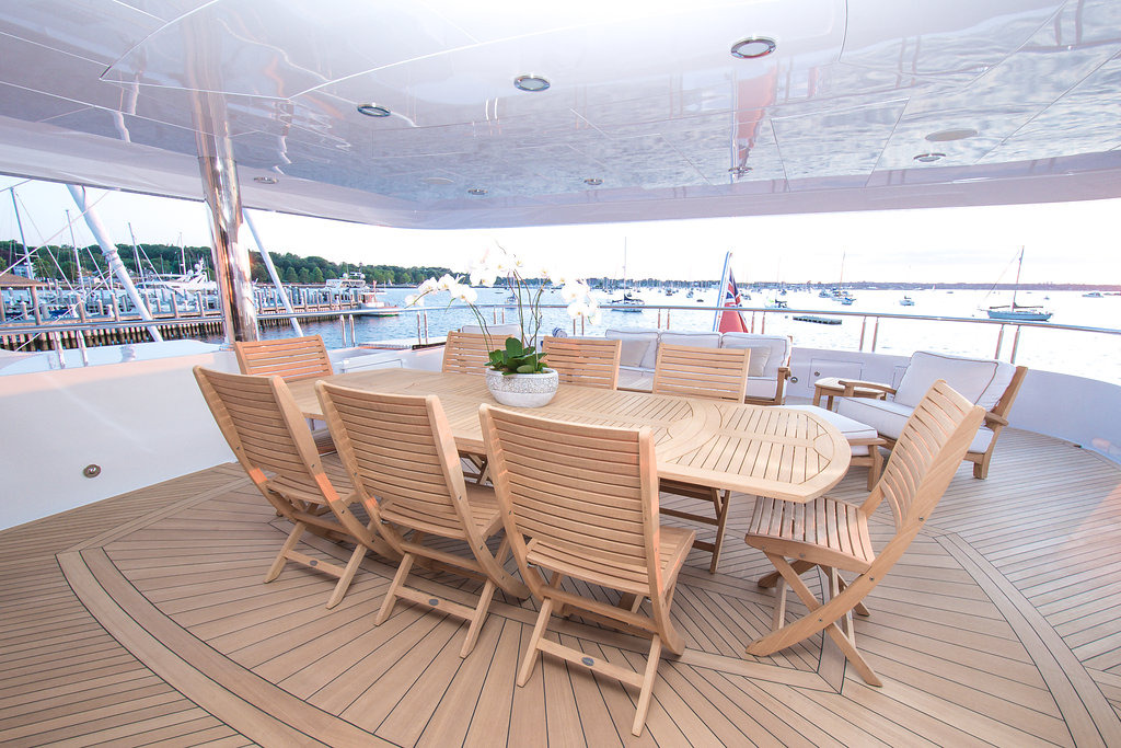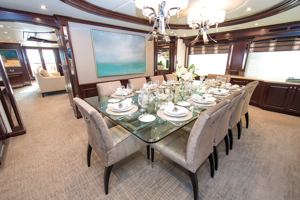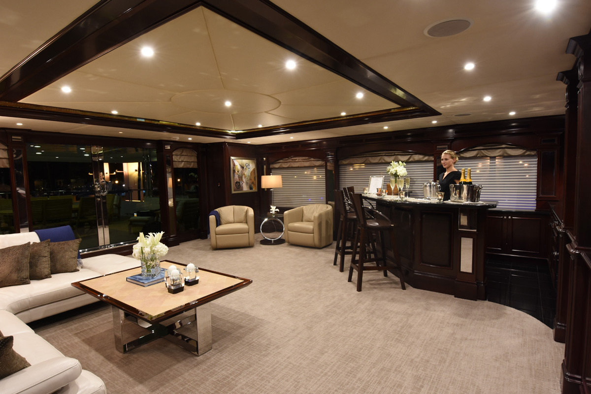 REBEL’s interior design exudes an understated, welcoming ambiance with the open plan salon and formal dining area on the main deck. The skylounge on the bridge deck level is full-width; each level offers large windows and sliding glass doors to the aft deck bringing the outdoors inside. REBEL accommodates 10 guests in 5 beautifully-appointed en suite staterooms. The impressive full-width master suite with king bed is located on the main deck forward with a study, seating area and a walk-in closet. The master suite his / hers bathroom features a large Jacuzzi tub and oversize shower. Below are four guest staterooms: 3 with king beds and 1 twin bed stateroom. Each spacious stateroom provides an ultra-luxurious private retreat after a busy day enjoying the sights ashore and watersports. The expansive exterior decks offer alfresco dining and lounging areas. The latest in audio/ visual entertainment ensures the enjoyment of movies and music throughout the exterior and interior. Entertainment is enhanced with three fully-equipped bars: in the main salon aft, in the skylounge and on the sundeck. The forward sundeck is furnished with 4 chaise lounges with optional awnings for shade. REBEL is a proven oceangoing vessel yet her draft easily allows exploring shallow waters. Zero speed stabilizers ensure calm seas at the dock or at anchor. Watersport equipment aboard REBEL is second to none. The large swim platform, accessed by dual staircases from the main aft deck, allows for easy access to the tenders and toys.