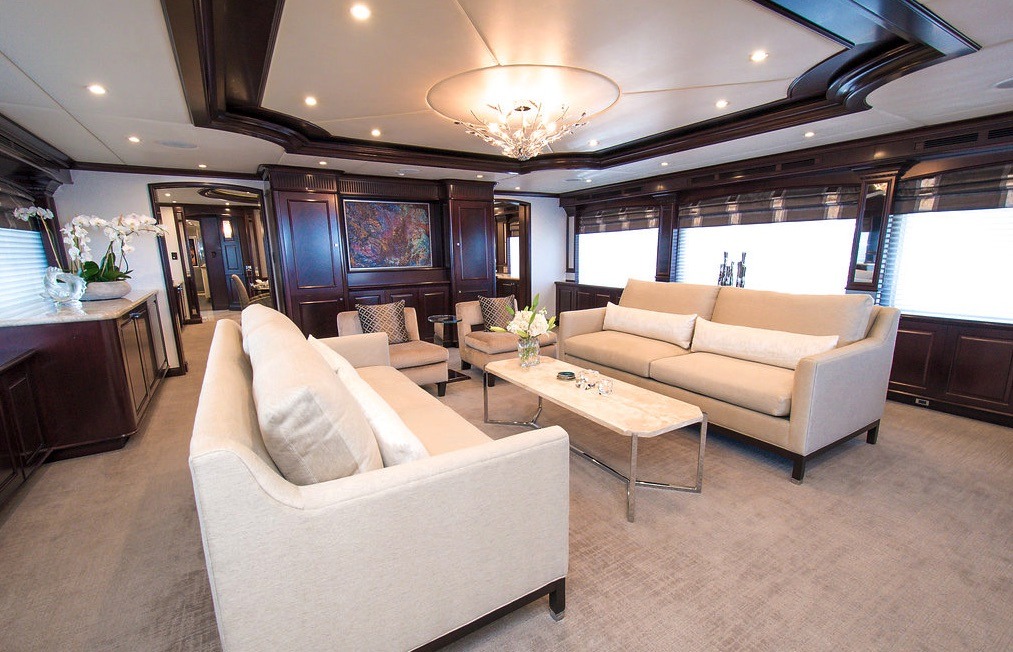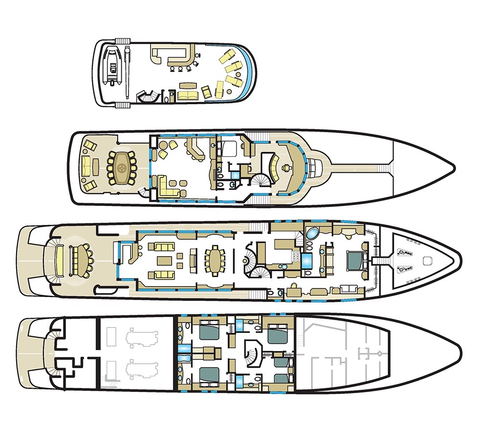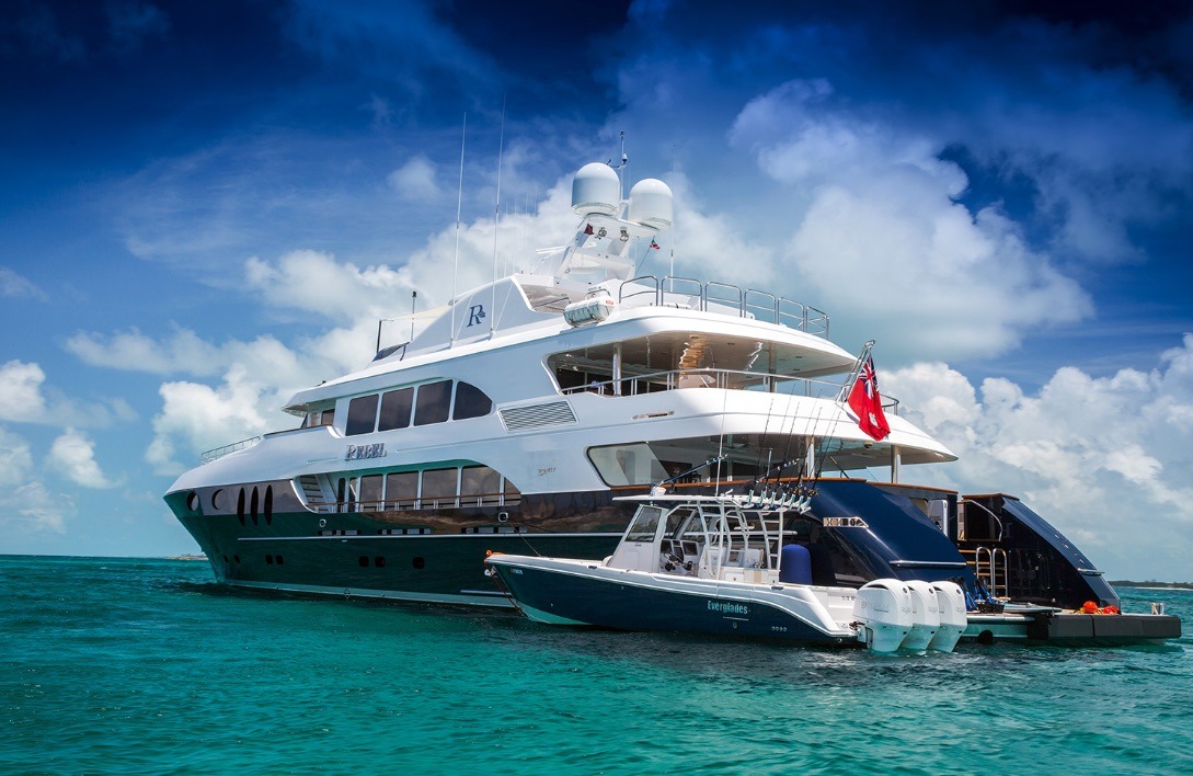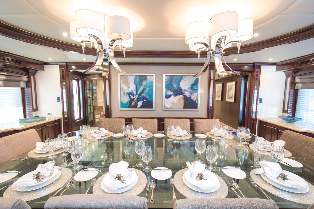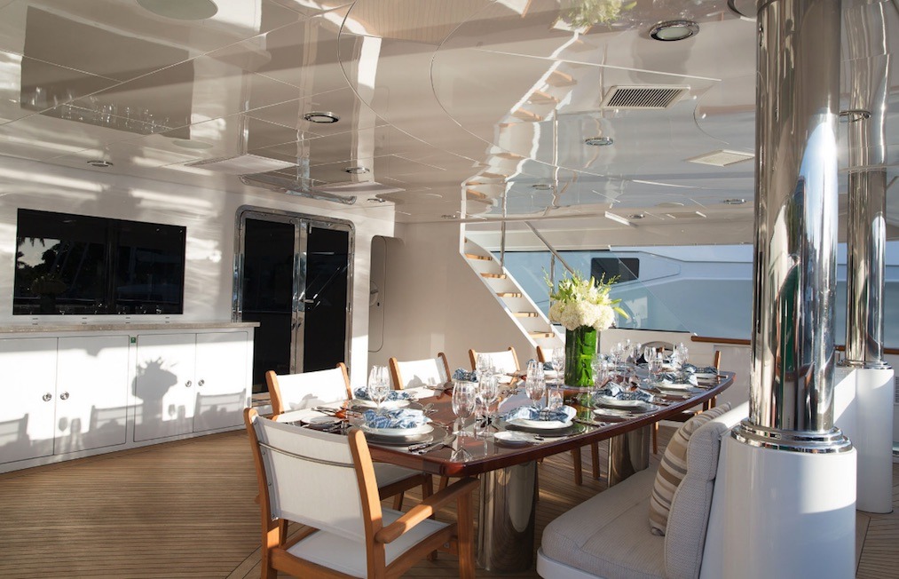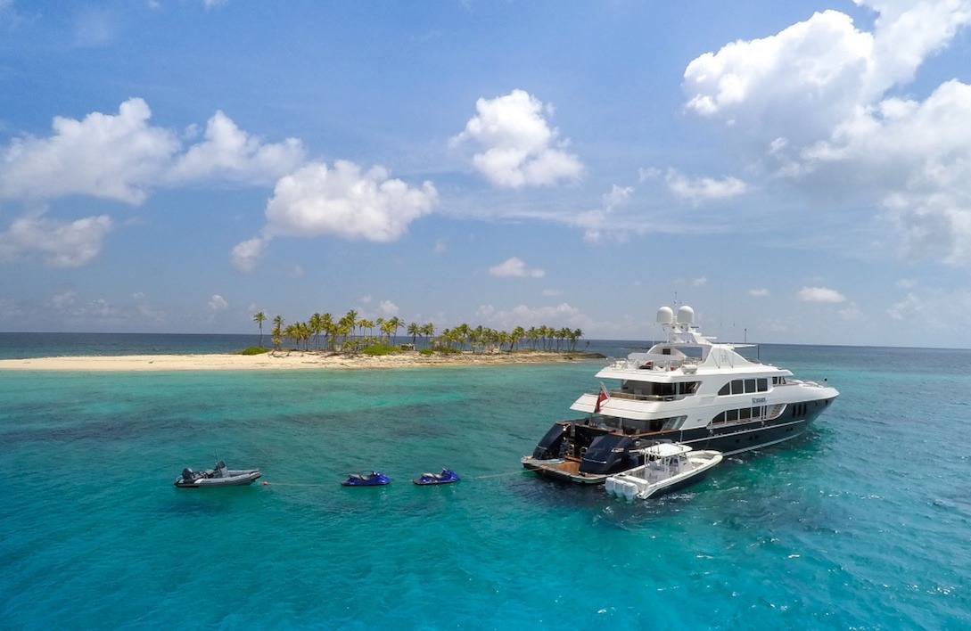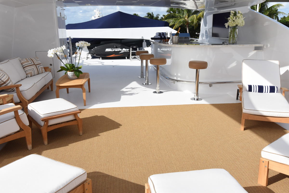 Tenders & Toys: 35.5 ft / 10.8 m Everglades tender / 900 hp / fully-rigged for sport fishing / (day head) 17.5 ft / 5.3m Zodiac Pro RIB center console / 115 hp 2 x Seadoo RXP waverunners 1 x Seadoo RXP X 300 waverunner (as of December 2016) 1 x Yamaha Super-Jet stand up jet-ski 3 x Seadoo underwater dive scooters, 3 x F5 Seabobs 2 x sea kayaks 16 ft / 4.87 m (spray skirts and rudders/ocean kayak style) wakeboards, water skis, array of towed inflatable toys 3 x stand-up paddle boards, ample snorkel gear *SCUBA/compressor Additional equipment: 2 x mountain bikes EXERCISE EQUIPMENT (Sundeck): programmable cycle trainer Bowflex reclining workout bench 55 Ibs Bowflex adjustable dumbbells 1 x 25 lb plate ladies' dumbbell sets: 10 lb, 5 Ib, 2 Ib 15 lb medicine ball, skipping ropes 2 x inflatable exercise balls various resistance bands, TRX band boxing bag, various sized boxing gloves/pads speed ball, multi-grip pull up barAudio Visual Equipment and Deck Facilities: USA or Caribbean HD Direct TV satellite channels. All A/V equipment was updated to newest HD smart 3D models in 2015 Main salon: 55 inch Skylounge: 50 inch Sundeck: 55 inch Master suite: 42 inch Guest staterooms port/starboard aft: 42 inch Guest stateroom port forward: 42 inch Guest twin: 32 inch 2 x Xbox- skylounge & main salon ( library of games) 1 x Wii -skylounge Entertainment equipment: karaoke machine, disco lighting, hazers, event lighting Communications: Satcom, Wifi throughout