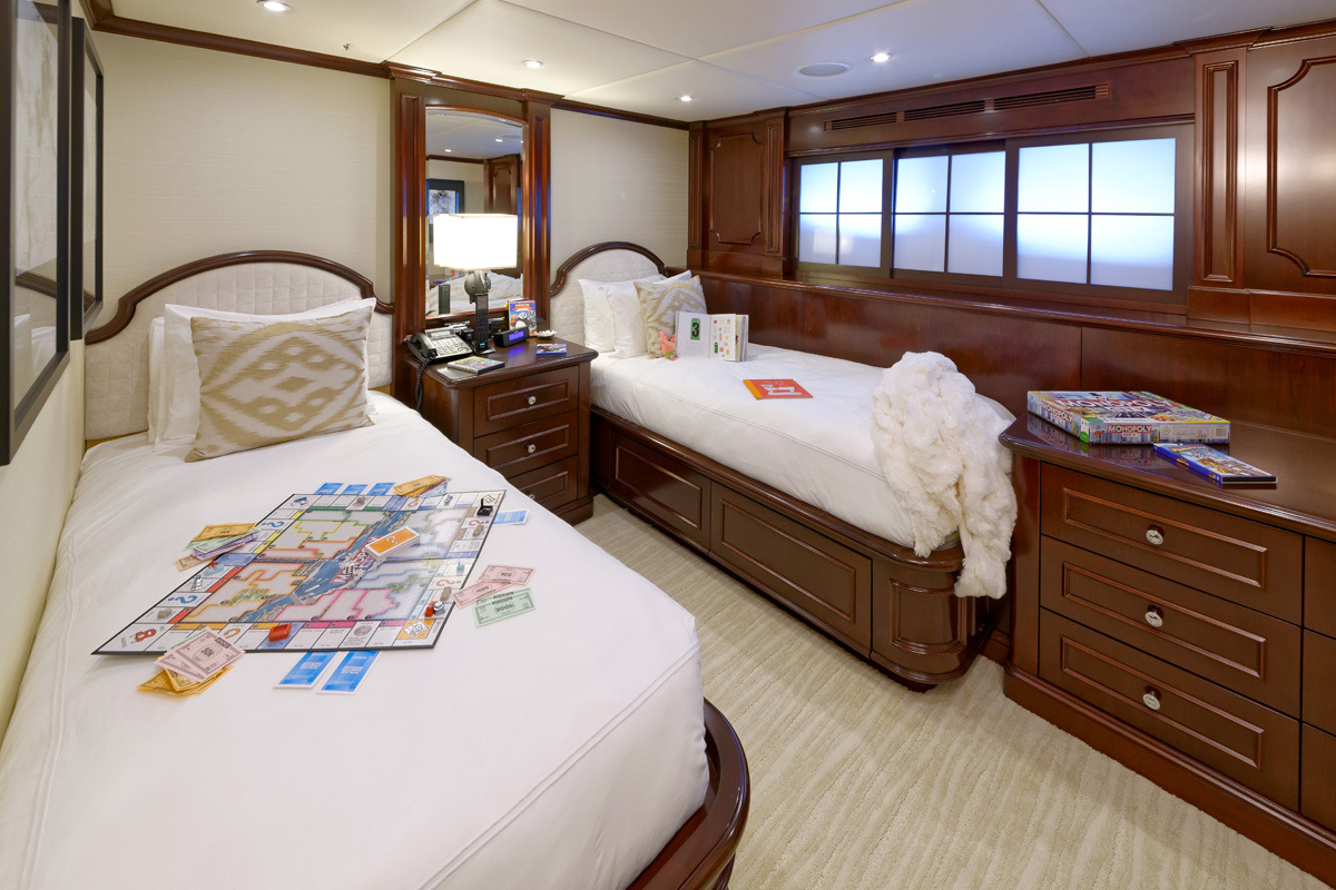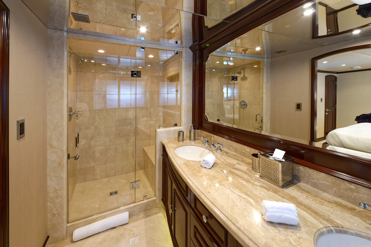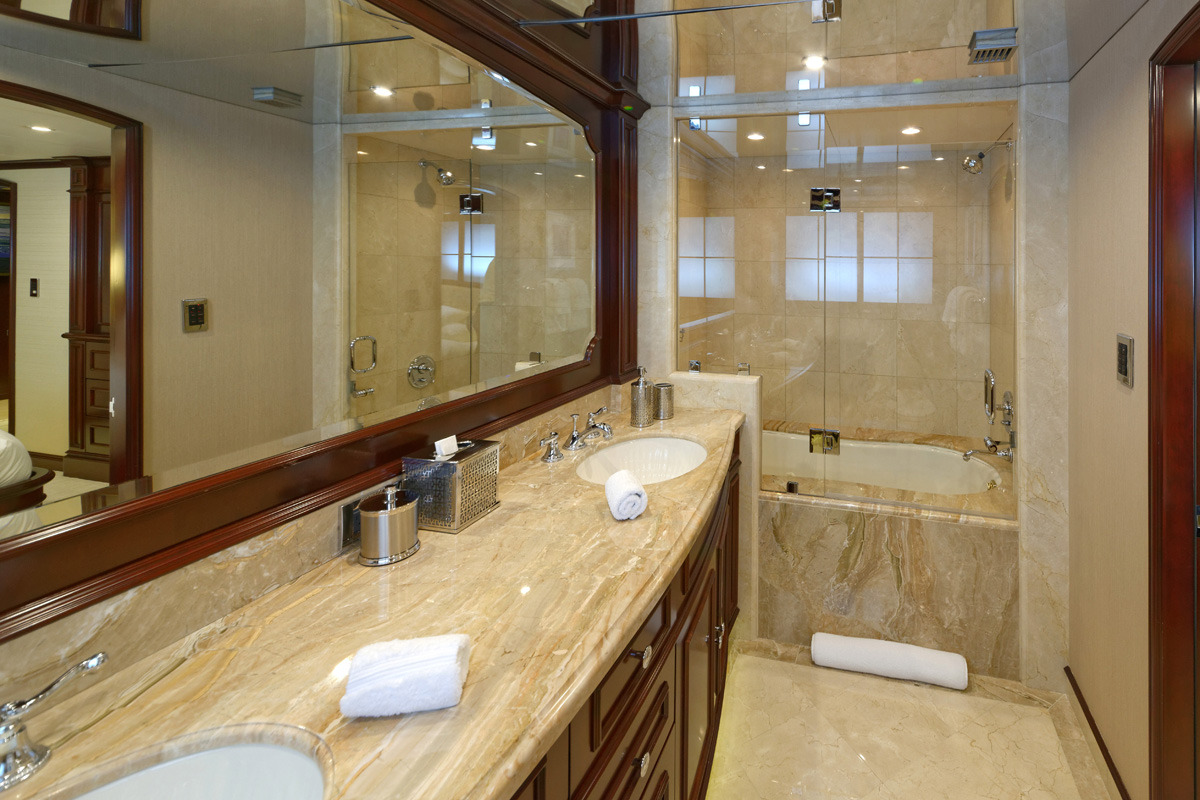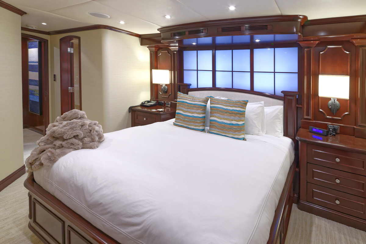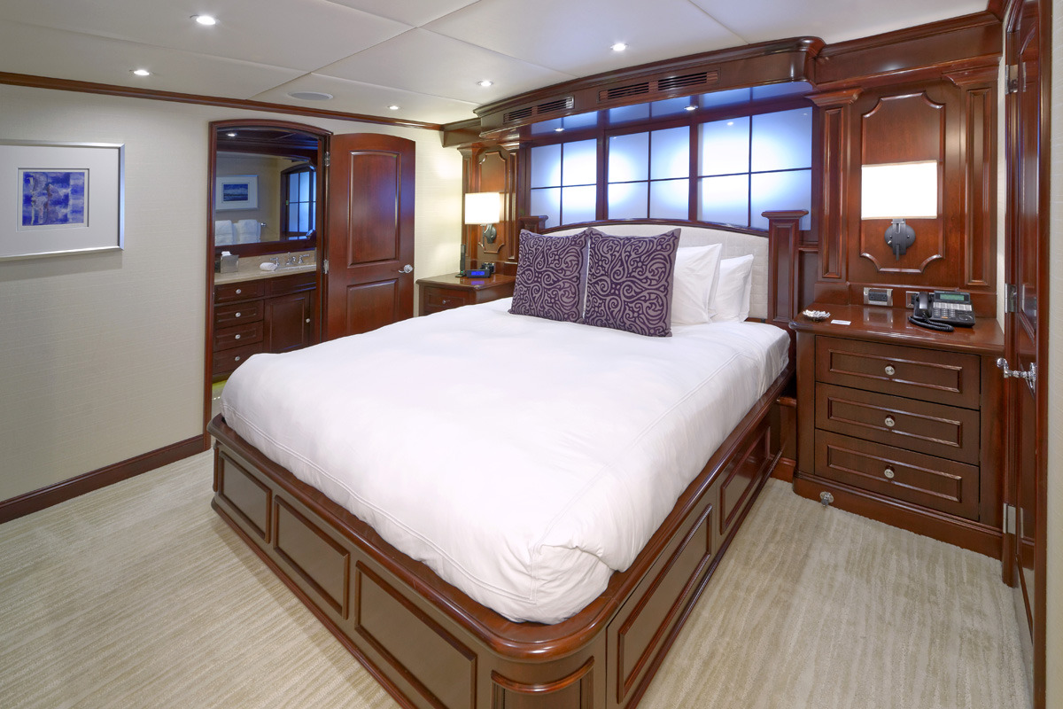 REBEL offers 5 ensuite staterooms. USA or Caribbean HD Direct TV satellite channels. Apple TV / Blue Ray player in every stateroom. STATEROOMS KING. Master stateroom / main deck forward. Full-width. Desk at entrance. Sofa to starboard, vanity/desk to port Large His/Hers bathroom with central shower with steam / Hers-Jacuzzi. Double sinks ______ Below amidships: KING. Starboard aft. Tub. Double sinks KING. Port aft. Shower. Double sinks KING. Port forward. Shower TWIN. Starboard forward. Shower