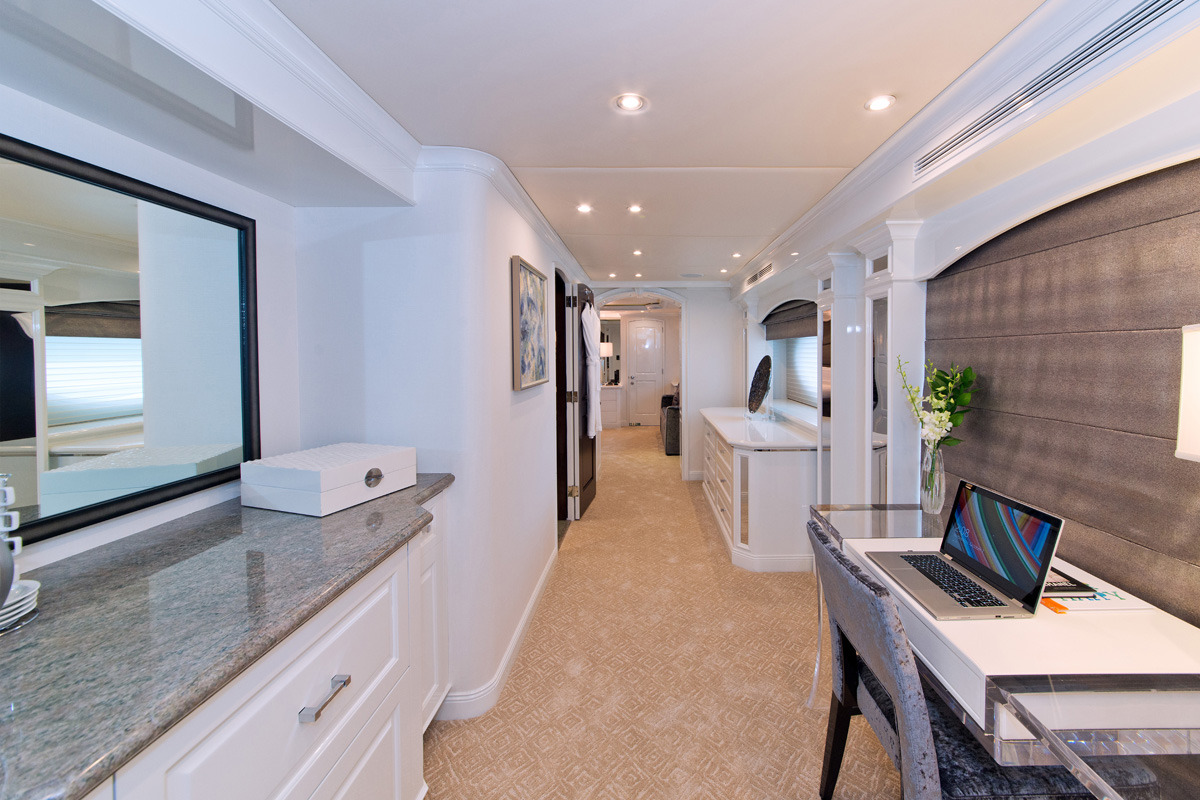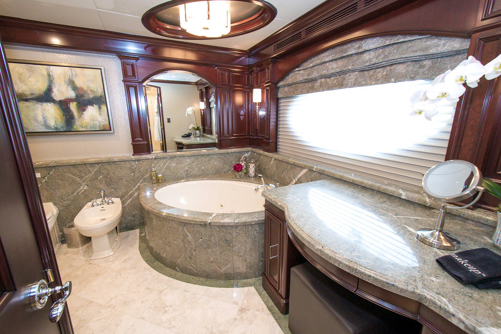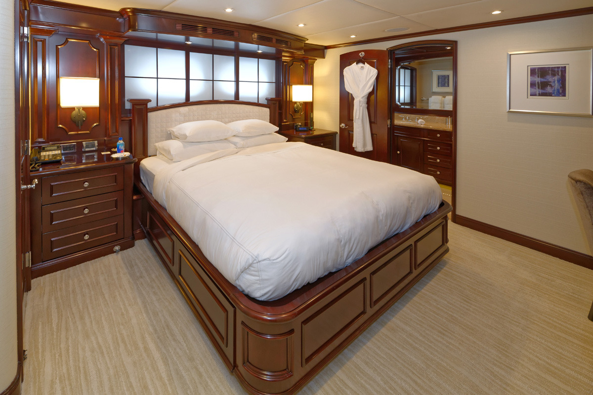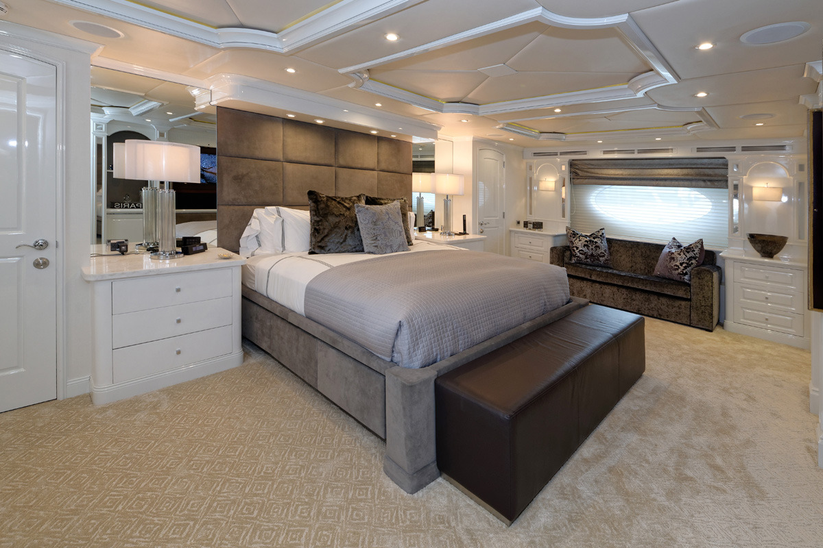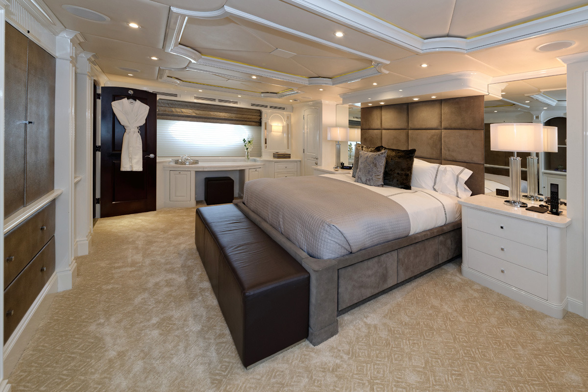 REBEL offers 5 ensuite staterooms. USA or Caribbean HD Direct TV satellite channels. Apple TV / Blue Ray player in every stateroom. STATEROOMS KING. Master stateroom / main deck forward. Full-width. Desk at entrance. Sofa to starboard, vanity/desk to port Large His/Hers bathroom with central shower with steam / Hers-Jacuzzi. Double sinks ______ Below amidships: KING. Starboard aft. Tub. Double sinks KING. Port aft. Shower. Double sinks KING. Port forward. Shower TWIN. Starboard forward. Shower