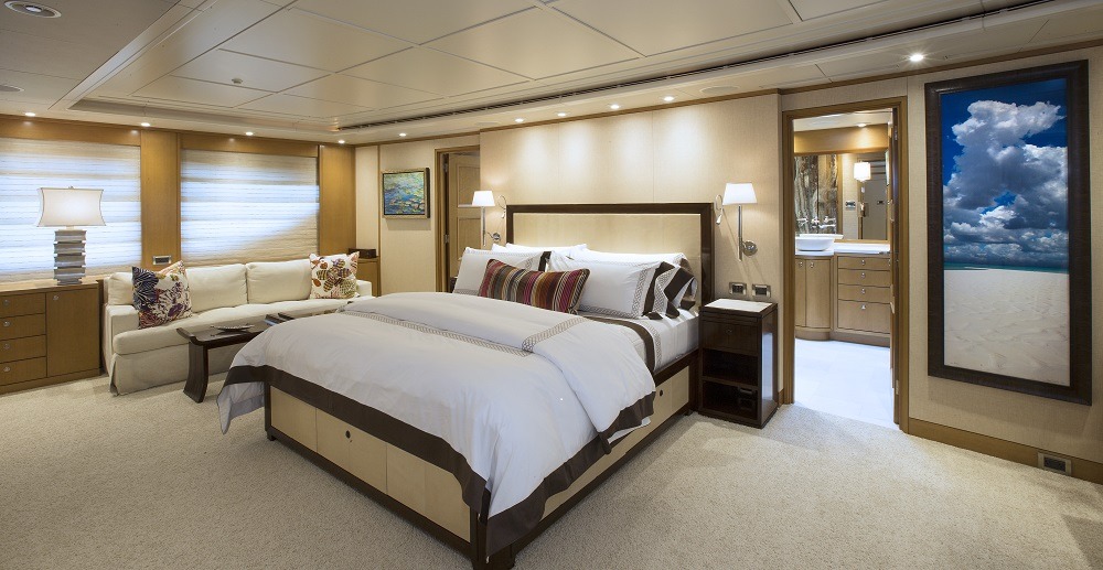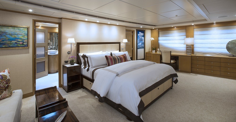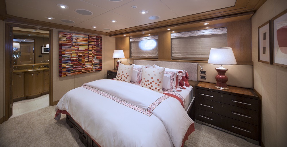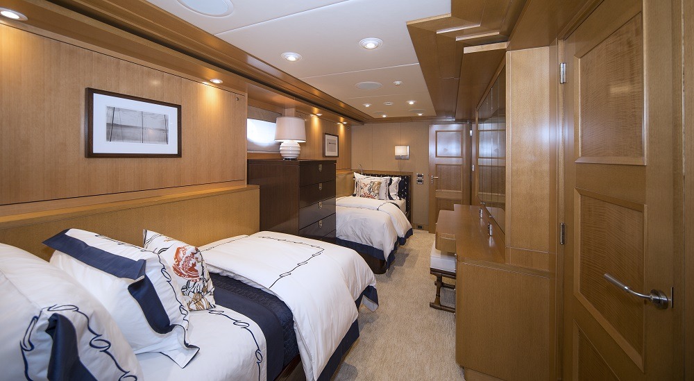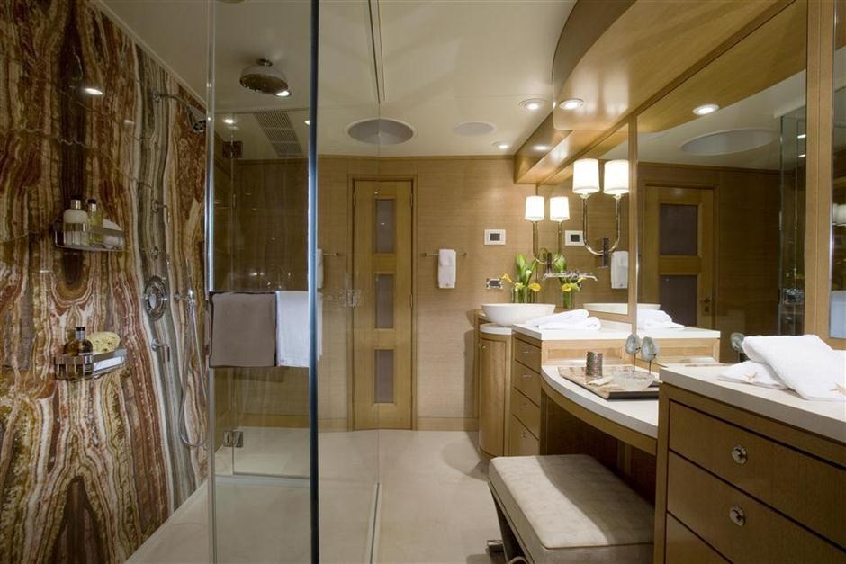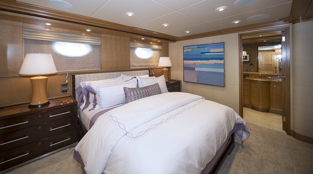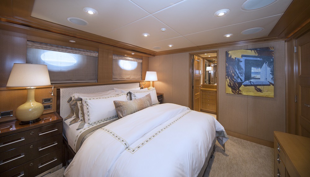 Master full beam suite with King bed, walnut furnishings, leather panels and textural weaves. Very large windows on port and starboard offers amazing vista’s. To port is a sitting area with settee, table and chair. To starboard is a desk and built in drawer storage. Forward is the master bath fitted with his and hers water closets, a double walk in shower center finished with Onice Fantastico stone in shades of sand, ochre, rust and ivory. Forward and on center is a vanity with two wash basins featuring Paloma Bianca limestone i for surfaces and sinks. The lower deck features a gorgeous u-shaped foyer with four staterooms. Three of the staterooms have king beds. The fourth starboard stateroom has 2 twin beds and 2 pullmans. All guest baths have showers with port lights and walls that are clad in tortoise‐finish glass tiles.