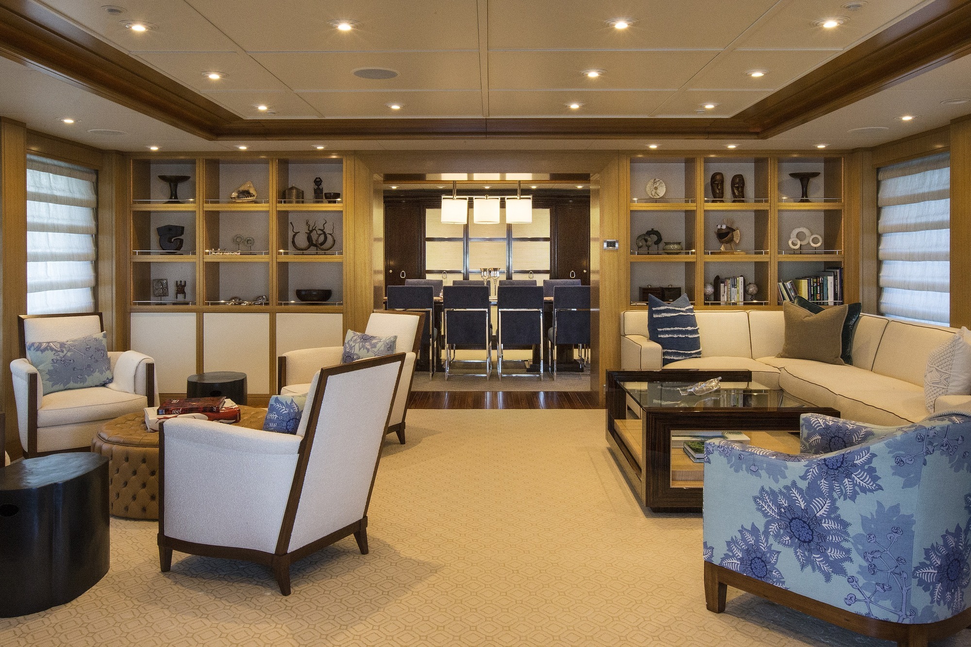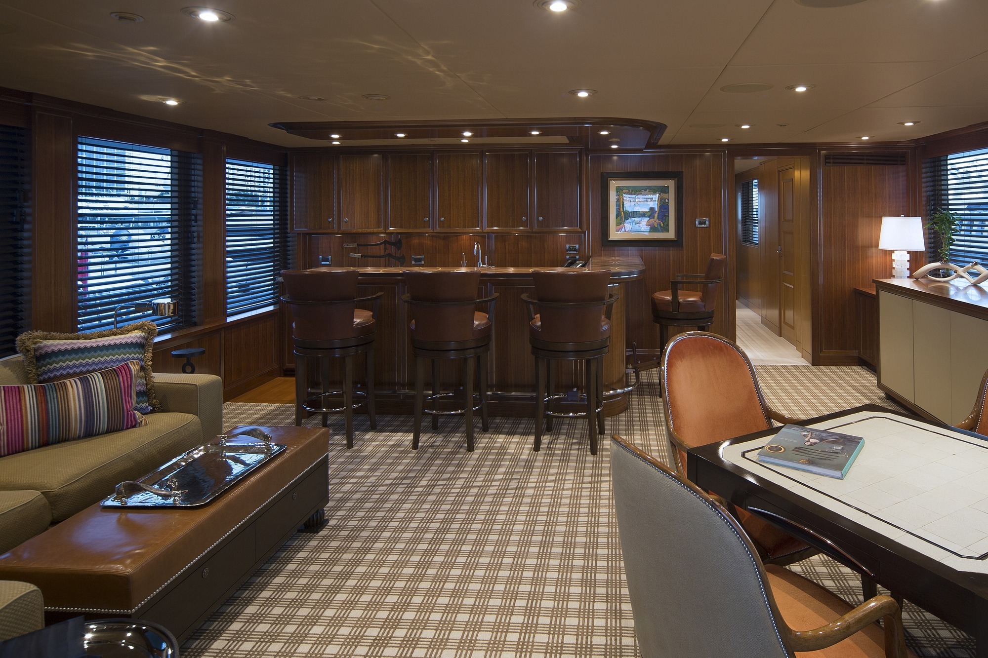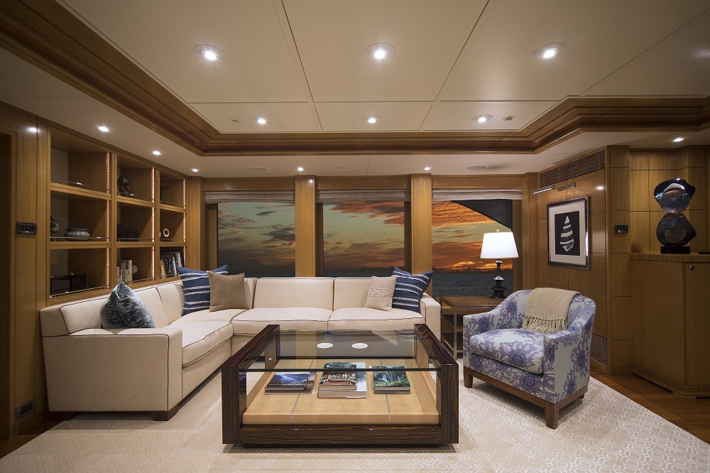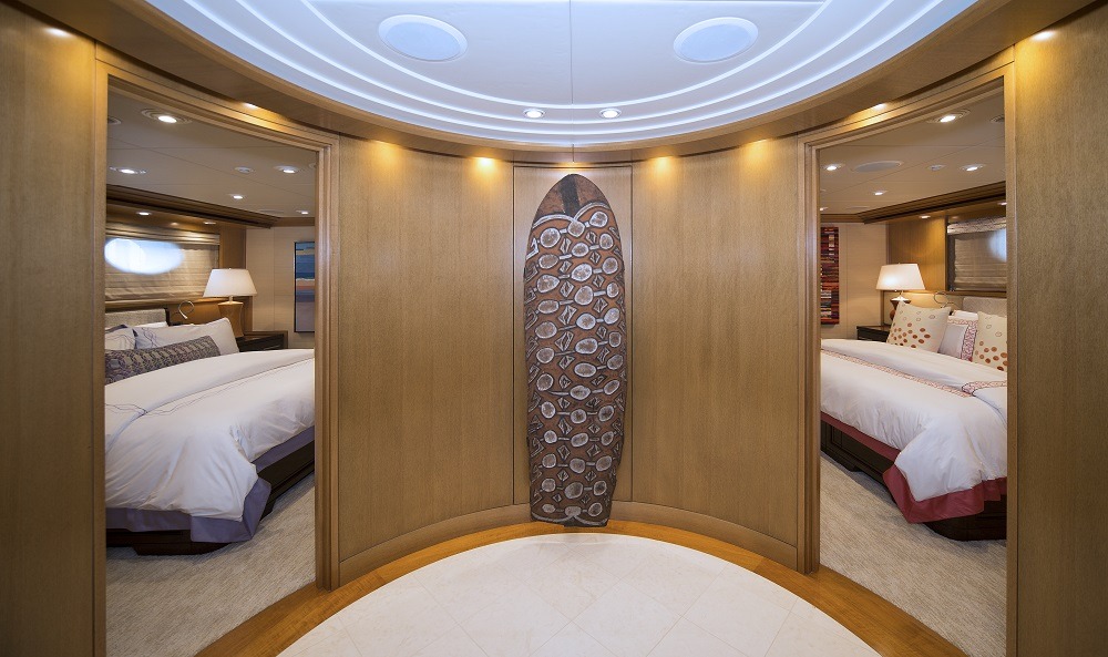 Master full beam suite with King bed, walnut furnishings, leather panels and textural weaves. Very large windows on port and starboard offers amazing vista’s. To port is a sitting area with settee, table and chair. To starboard is a desk and built in drawer storage. Forward is the master bath fitted with his and hers water closets, a double walk in shower center finished with Onice Fantastico stone in shades of sand, ochre, rust and ivory. Forward and on center is a vanity with two wash basins featuring Paloma Bianca limestone i for surfaces and sinks. The lower deck features a gorgeous u-shaped foyer with four staterooms. Three of the staterooms have king beds. The fourth starboard stateroom has 2 twin beds and 2 pullmans. All guest baths have showers with port lights and walls that are clad in tortoise‐finish glass tiles.