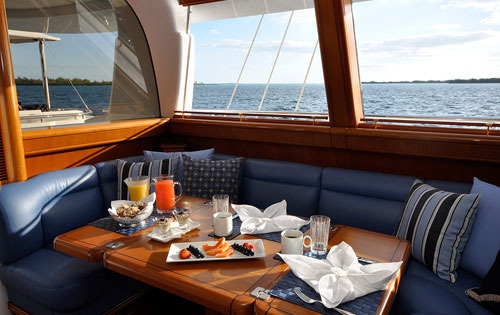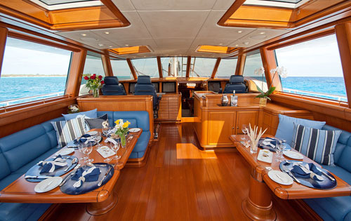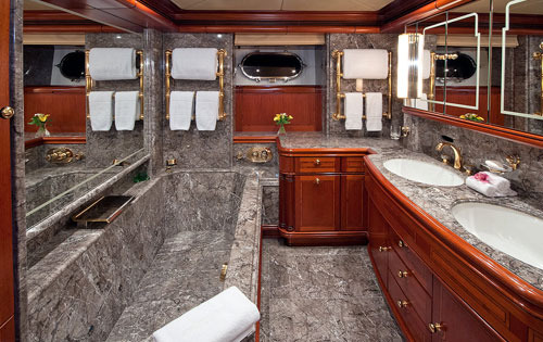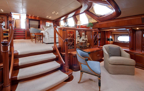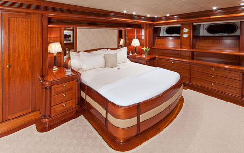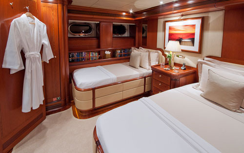 Full beamowner's cabin located aft with king-sized bed, study area and bathroom en-suite. Double cabin starboard side aft with queen size bed, shower room en-suite. Twin cabin on port side aft with two single beds and shower room en-suite.