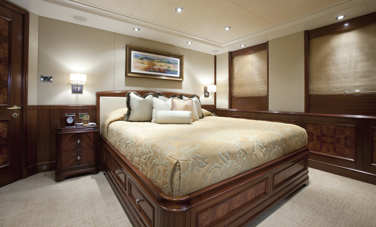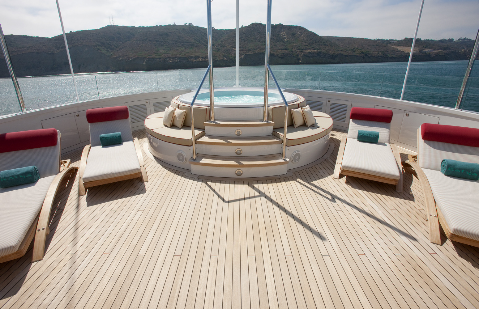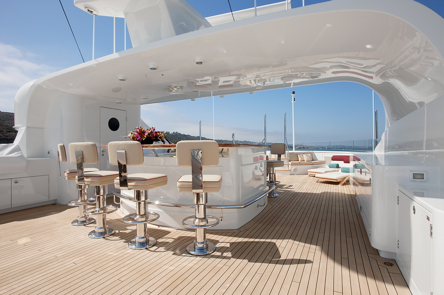 A total of 5 staterooms accommodating up to 12* guests when children are included or a maximum of 10 adults. *Note: dining tables accommodate 10 seated. All accommodations have been upgraded with extensive all new AV technology including new 4k hi def flatscreen TVs. Each stateroom is equipped with individual climate control, individual satellite receivers, complete blackout, iPod docking stations, Crestron iPad controls, hair-dryers, telephone and intercom MASTER STATEROOM SUITE The Master Stateroom Entrance is situated on the Main Deck. Upon entering, Owner’s office area is to Stbd and features a desk and chair. The walk-around King bed faces aft and features a 43” flat screen TV, surround sound, vanity to port and couch to starboard. En-suite bath (can either enter on His side or Her side) with over sized Jacuzzi Tub, separate shower, twin sinks, private toilet. Heated flooring. The entire Master suite features 5 very large oval windows offering stunning views and plenty of natural light. Safe. BELOW DECK Access to the 4 below guest staterooms are lead by a spiral stairwell with railings on either side. The guest foyer below also features a stunning Tiger’s Eye inlay. The two aft starboard side and port side guest staterooms feature a walk around King bed. Vanity/desk. En-suite bath features an over-sized shower with bench seating, twin sinks & private toilet. The forward starboard side stateroom features a walk around Queen bed. Vanity/desk. En-suite bath features an over-sized shower with bench seating, twin sinks & private toilet. The forward Port stateroom features a double size bed and one single bed plus a pullman. This is a great children's cabin, nanny cabin or can be used for two adults. There is a vanity/desk.. En-suite bath features an oversized Jacuzzi tub, shower, twin sinks & private toilet. From the main salon (with 55" TV) to the skylounge (with 65" TV and bar), guests have a variety of social environments to enjoy. While on the exterior, there are two dining area - main and bridge levels (43" TV exterior) plus plenty of relaxation and entertaining space from beach club all the way up to the expansive sundeck with central bar.