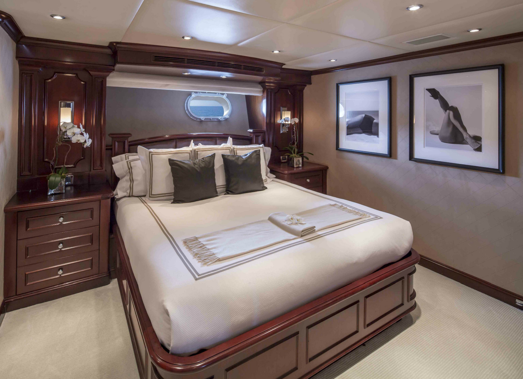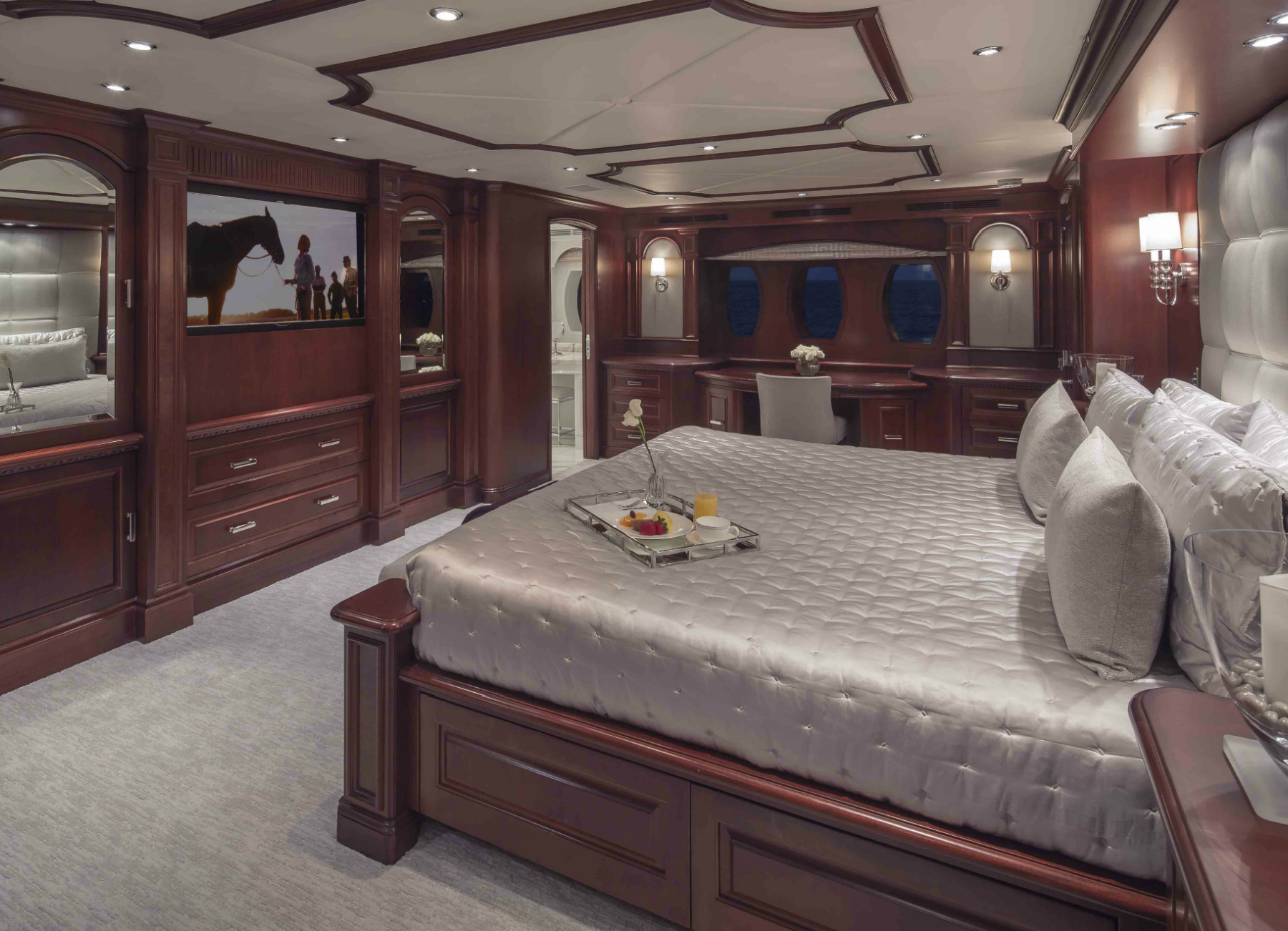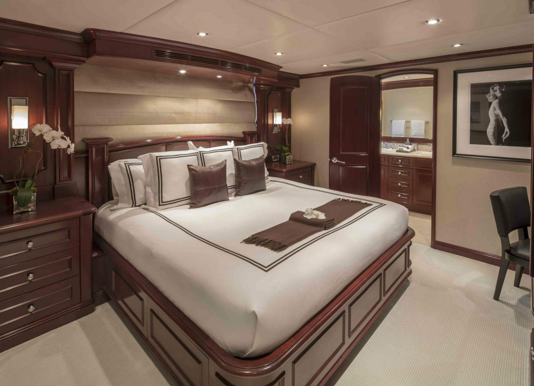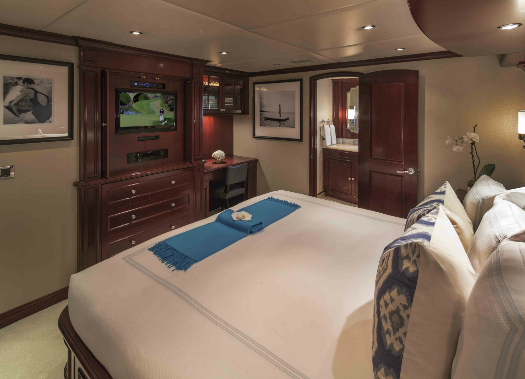 Each en suite stateroom equipped with TV/DVD. Each with a custom cedar-lined closet. KING. Master. Full width. Main deck. His/hers bathrooms-His/central shower & hers/Jacuzzi. Walk-in closet. Sofa, vanity. Private study at entrance BELOW: VIP KING. Forward. Port. Shower. Adjoining starboard TWIN + Pullman berth stateroom can be opened to be used as a lounge/dressing room. TWIN + Pullman berth (noted above). Forward starboard. L-shaped bed arrangement. Shower KING. Starboard. Air bath tub. Desk KING. Port. Shower. Desk
