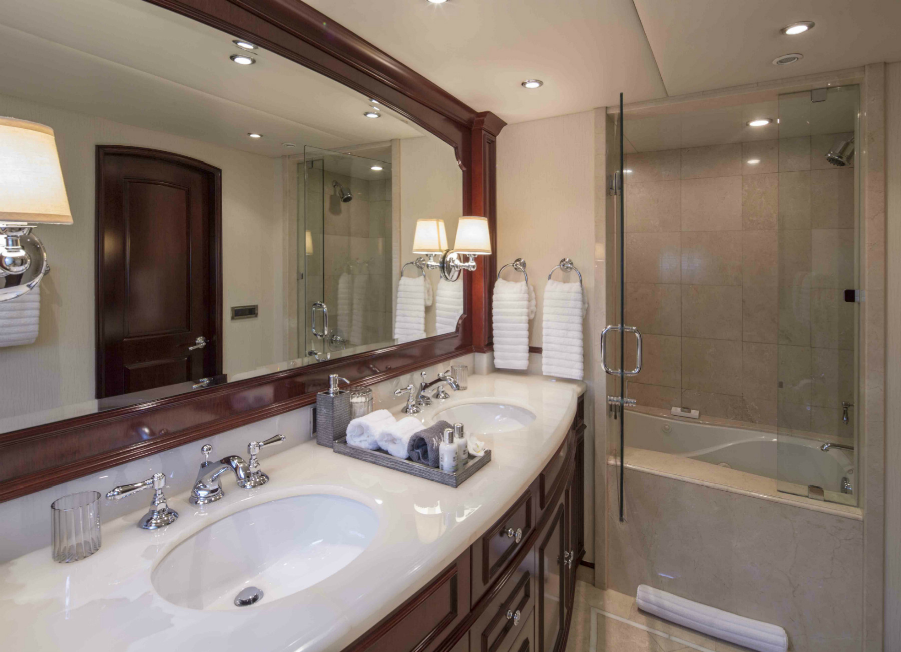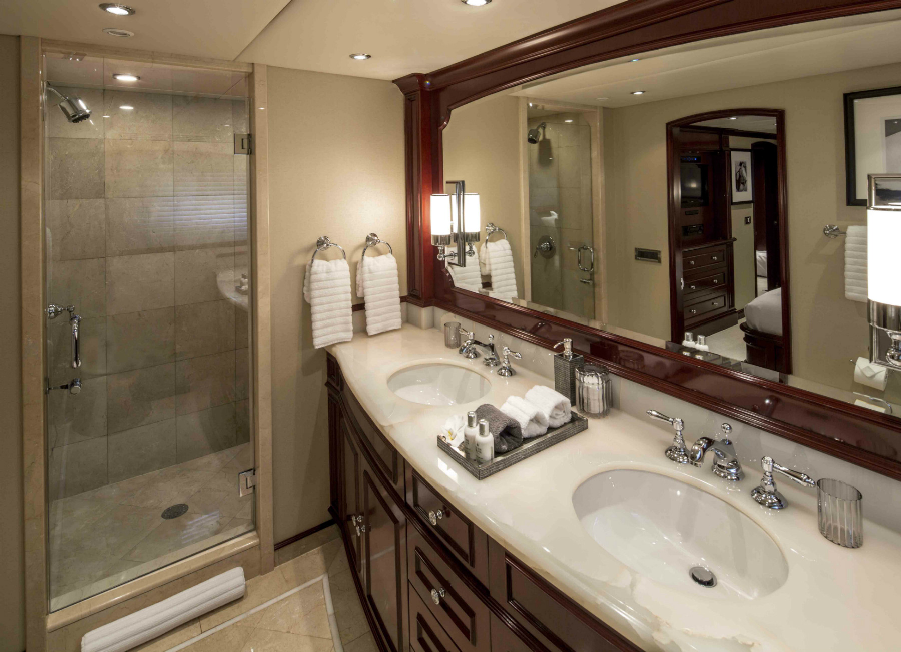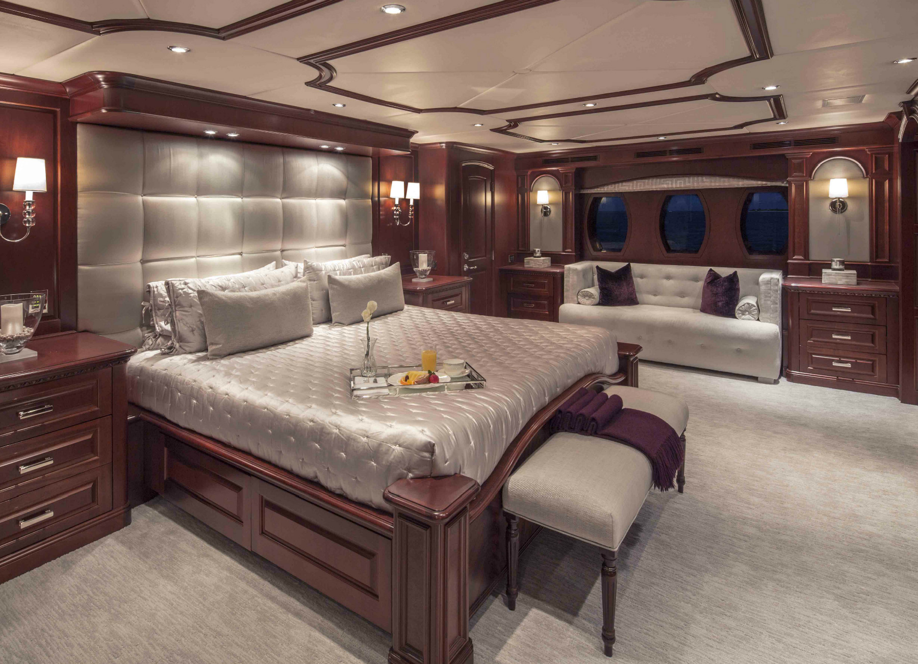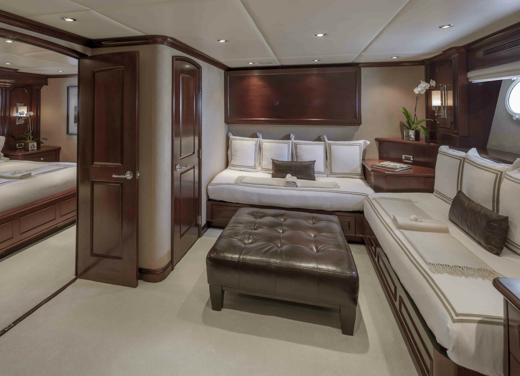 Each en suite stateroom equipped with TV/DVD. Each with a custom cedar-lined closet. KING. Master. Full width. Main deck. His/hers bathrooms-His/central shower & hers/Jacuzzi. Walk-in closet. Sofa, vanity. Private study at entrance BELOW: VIP KING. Forward. Port. Shower. Adjoining starboard TWIN + Pullman berth stateroom can be opened to be used as a lounge/dressing room. TWIN + Pullman berth (noted above). Forward starboard. L-shaped bed arrangement. Shower KING. Starboard. Air bath tub. Desk KING. Port. Shower. Desk