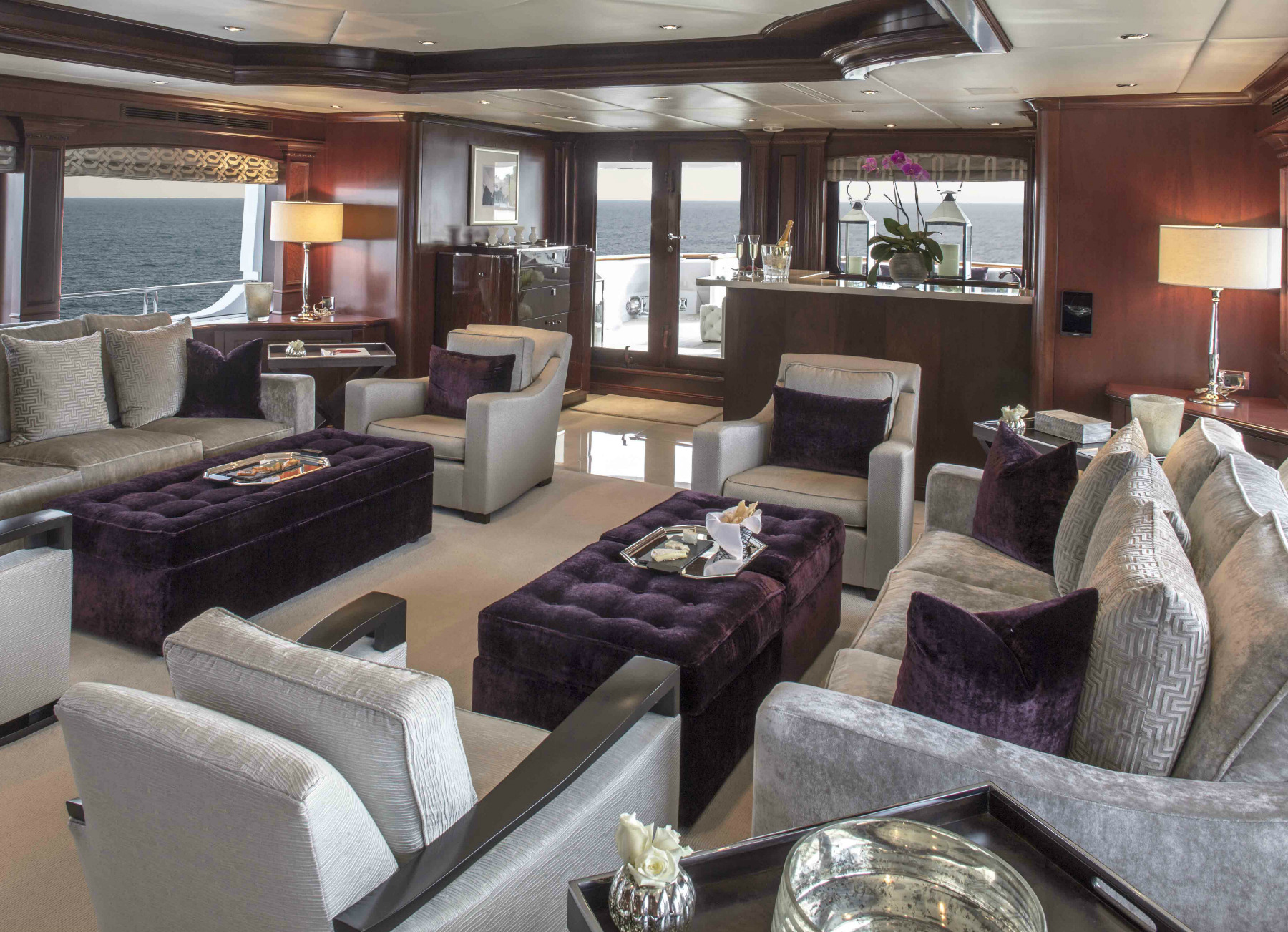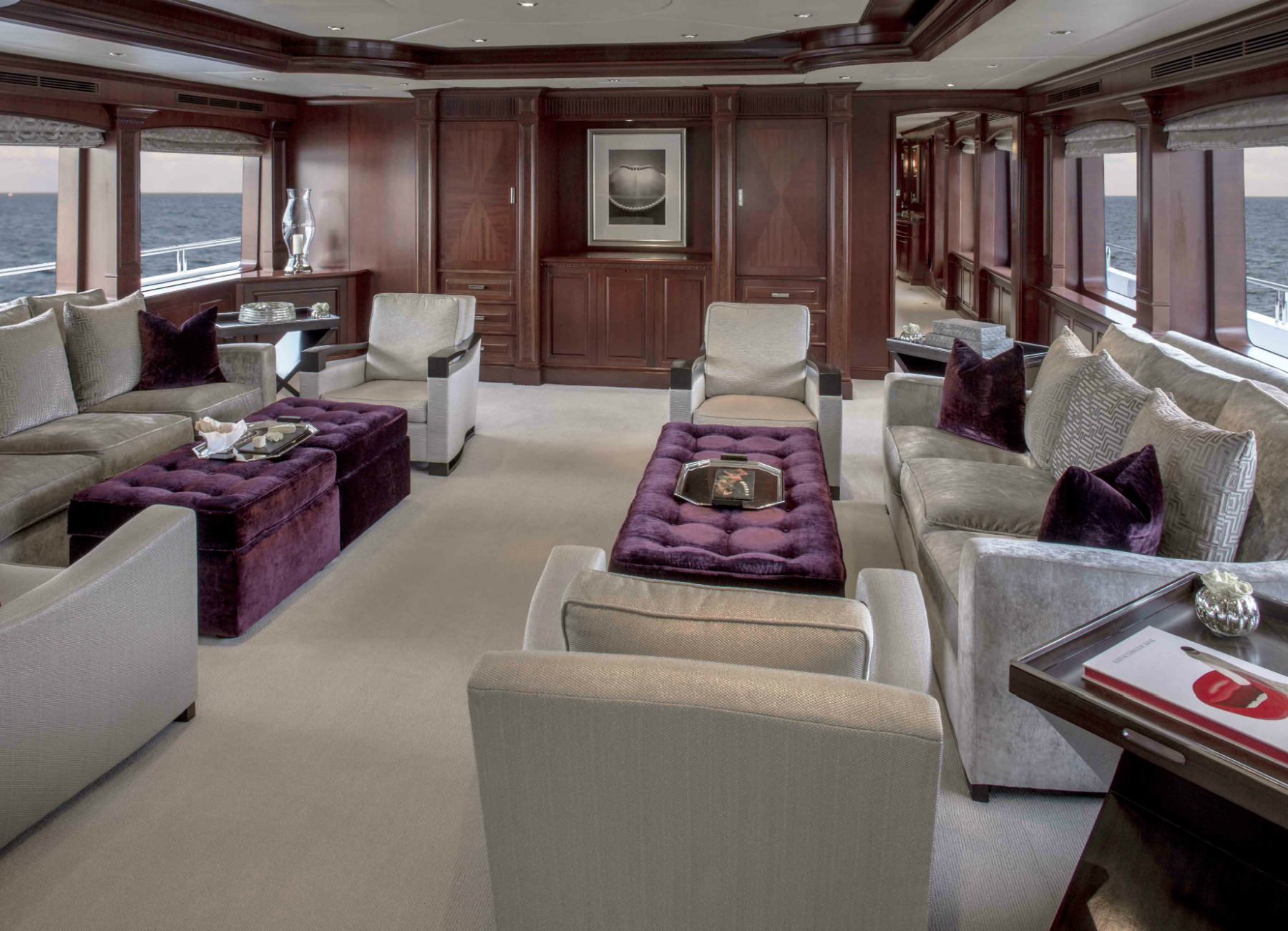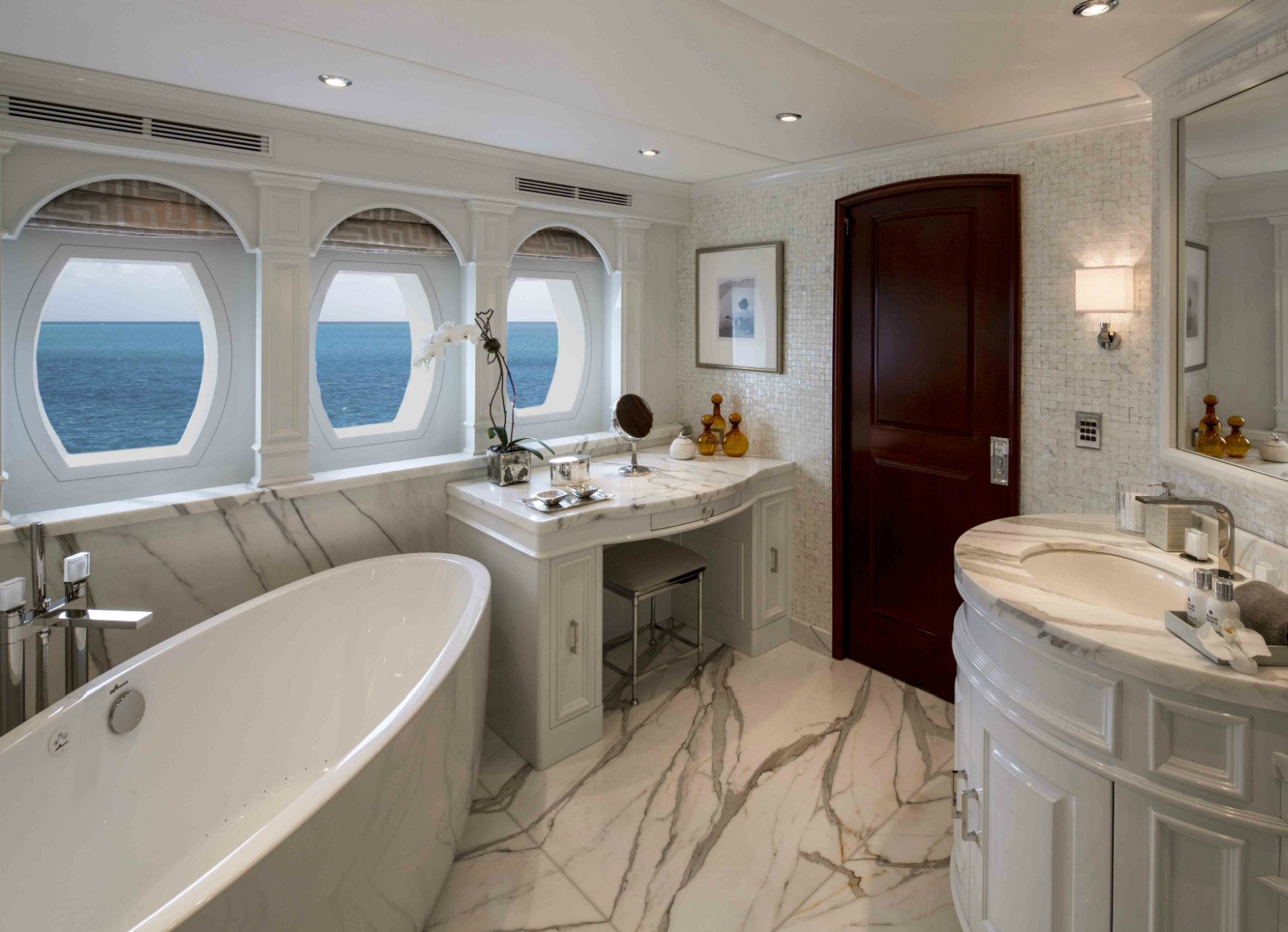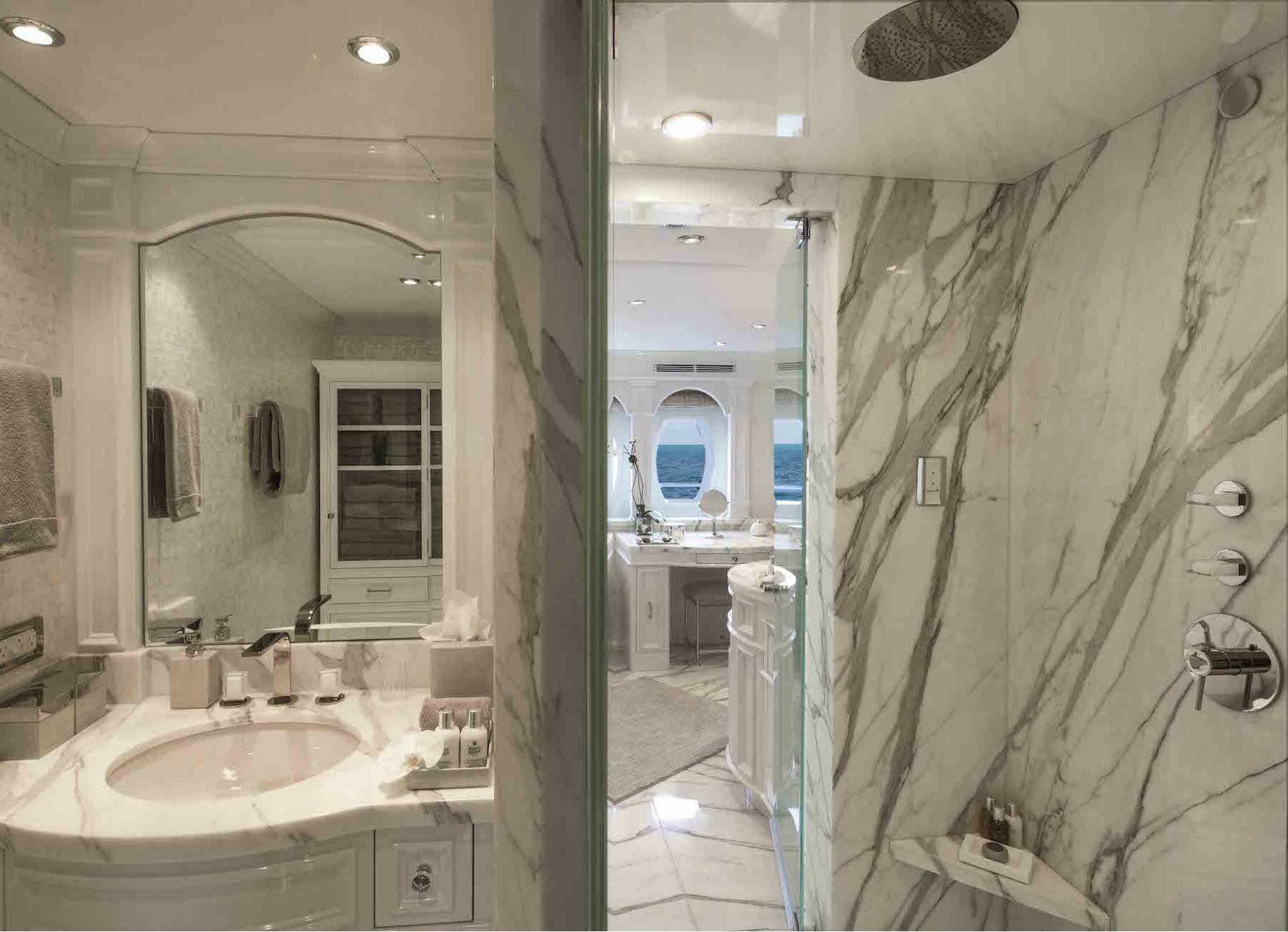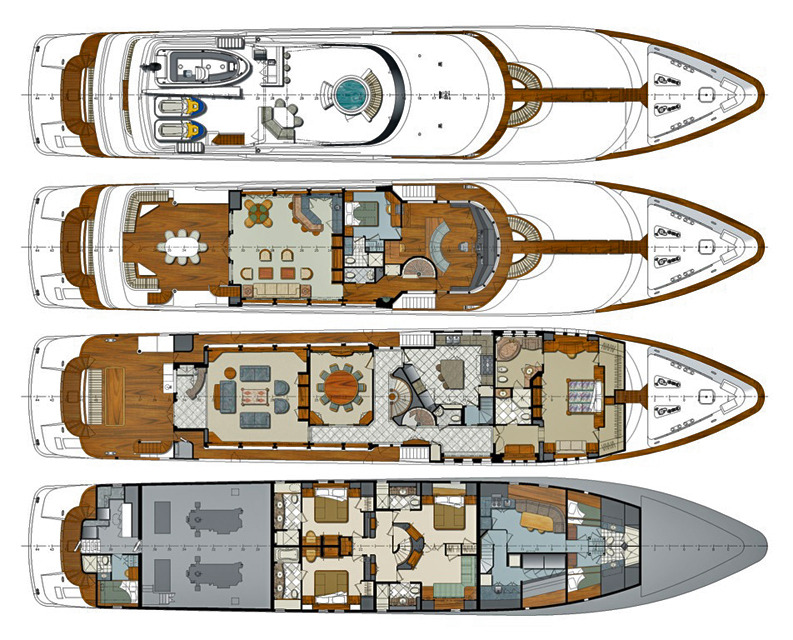 Each en suite stateroom equipped with TV/DVD. Each with a custom cedar-lined closet. KING. Master. Full width. Main deck. His/hers bathrooms-His/central shower & hers/Jacuzzi. Walk-in closet. Sofa, vanity. Private study at entrance BELOW: VIP KING. Forward. Port. Shower. Adjoining starboard TWIN + Pullman berth stateroom can be opened to be used as a lounge/dressing room. TWIN + Pullman berth (noted above). Forward starboard. L-shaped bed arrangement. Shower KING. Starboard. Air bath tub. Desk KING. Port. Shower. Desk