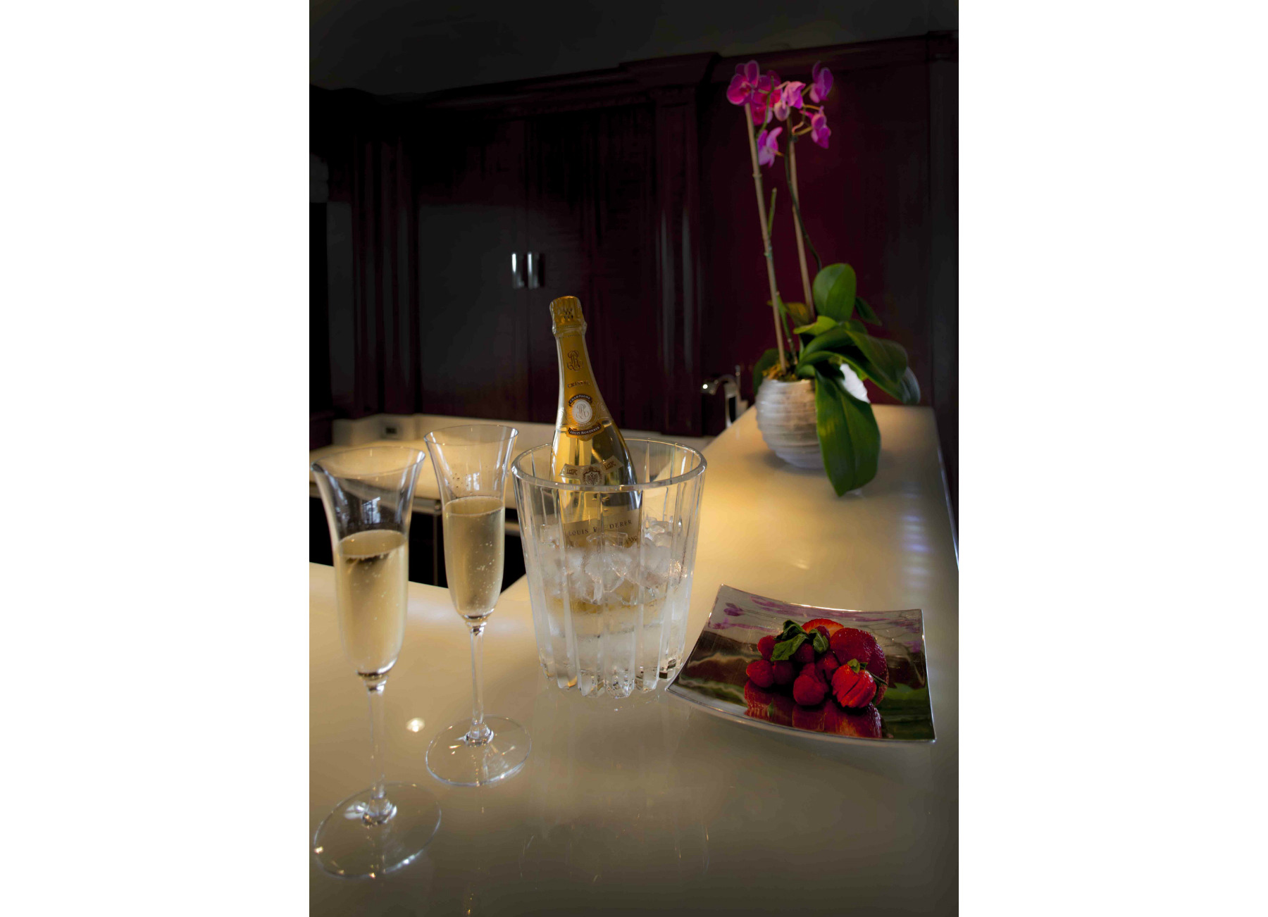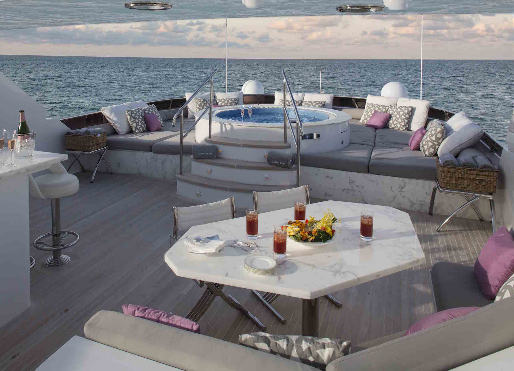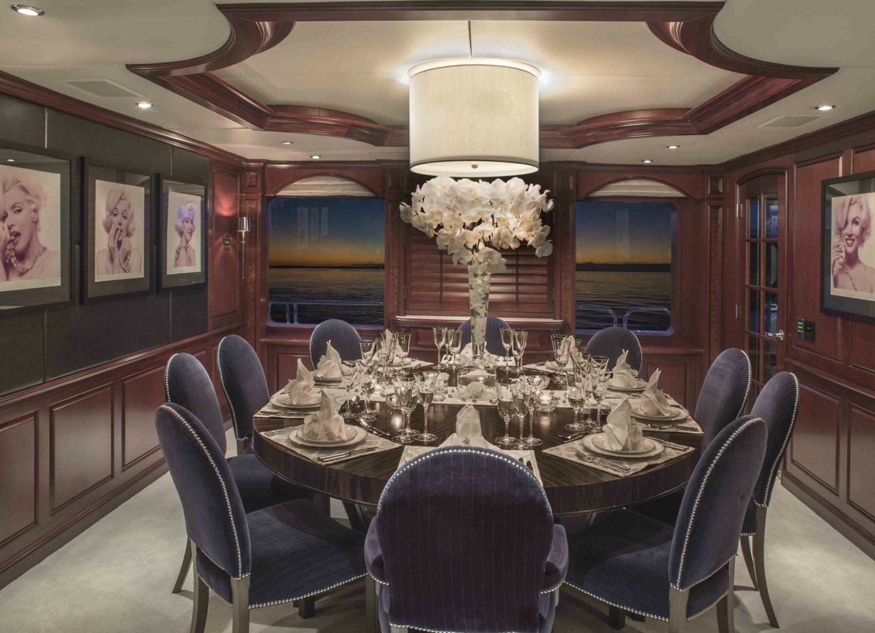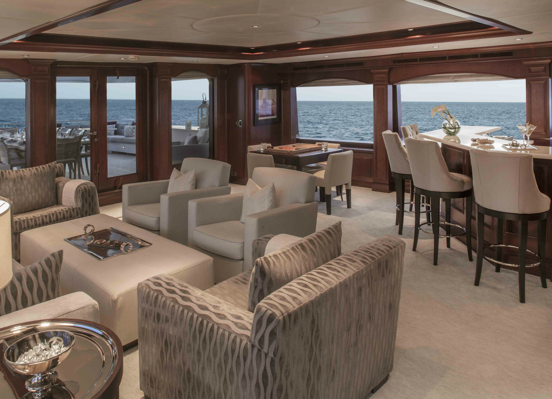 Each en suite stateroom equipped with TV/DVD. Each with a custom cedar-lined closet. KING. Master. Full width. Main deck. His/hers bathrooms-His/central shower & hers/Jacuzzi. Walk-in closet. Sofa, vanity. Private study at entrance BELOW: VIP KING. Forward. Port. Shower. Adjoining starboard TWIN + Pullman berth stateroom can be opened to be used as a lounge/dressing room. TWIN + Pullman berth (noted above). Forward starboard. L-shaped bed arrangement. Shower KING. Starboard. Air bath tub. Desk KING. Port. Shower. Desk