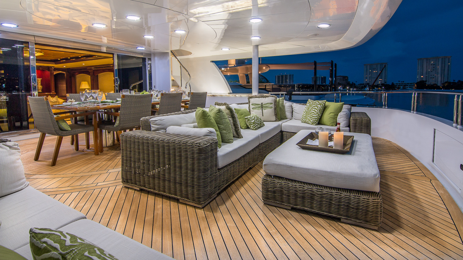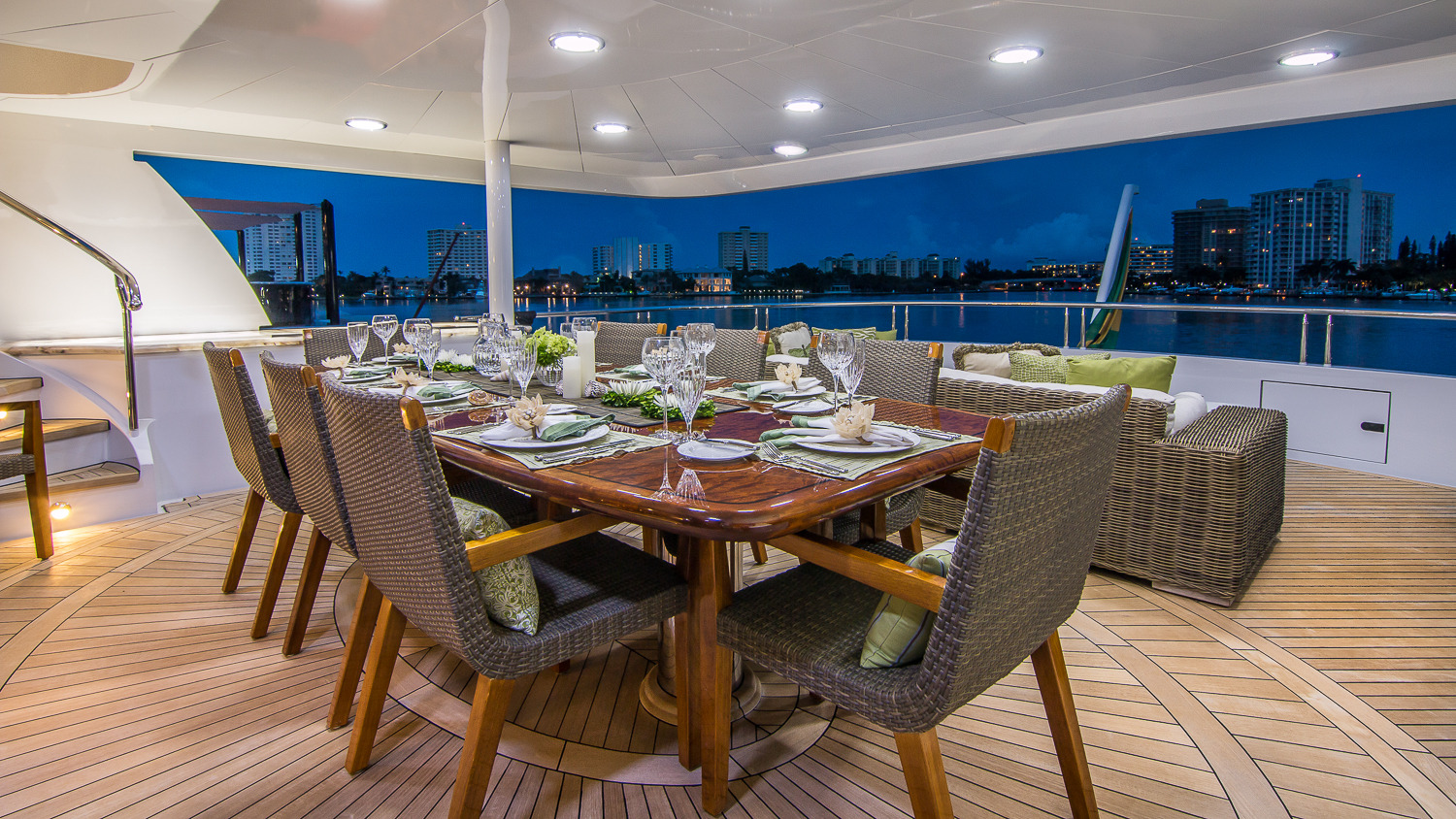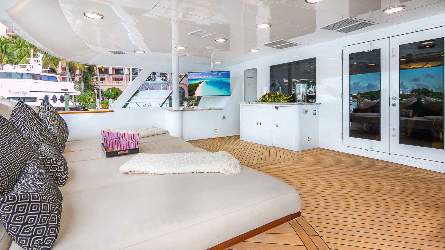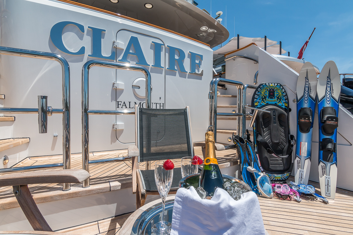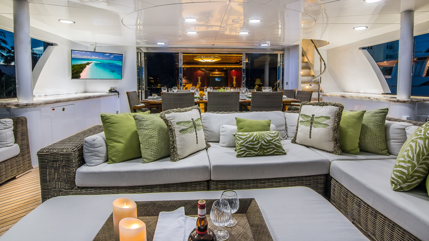 Tenders & Toys: • 32' Boston Whaler towed tender • 19' Wave tender • 40' Waterslide from the sun deck • Floating trampoline • (2) Yamaha waverunners • (2) Double Inflatable kayaks • (2) Stand Up Paddle boards • Waterskis for adults and children • Snorkeling equipment and fishing gear • Kneeboards • Wakeboards • Beach gear • Floating mat • 4-person Donut towable inflatable • The Couch towable inflatable • (2) single person Donut towable inflatable • The Island inflatable Rendezvous diving only ADDITIONAL EQUIPMENT: • Zero-Speed Stabilizers • Treadmill • Migun Massage table (Skylounge) • 24/7 WiFi throughout Audio Visual Equipment and Deck Facilities: • Kaleidoscope A/V system on demand • (4) 21" flat panel multi-system (Staterooms) • (2) 42" Plasma multi-system (Main Salon, Sky Lounge) • 32" Plasma multi-system (Master) • (10) DV 353 Pioneer DVD players (All guest and common areas) • SLV-ED 100 ME Sony multi-system (Master) • 42” Flat screen TV (Main Deck, Bridge Deck Aft) • 32” Flat screen TV (Sun Deck) • I-Pod connection in all A.V. Communications: • Fleet 77 SAT COM • Panasonic telephone system • Furuno SSB • Furuno VHF • Nokia cellular phone system • Panasonic intercom • Wireless Internet throughout 24/7