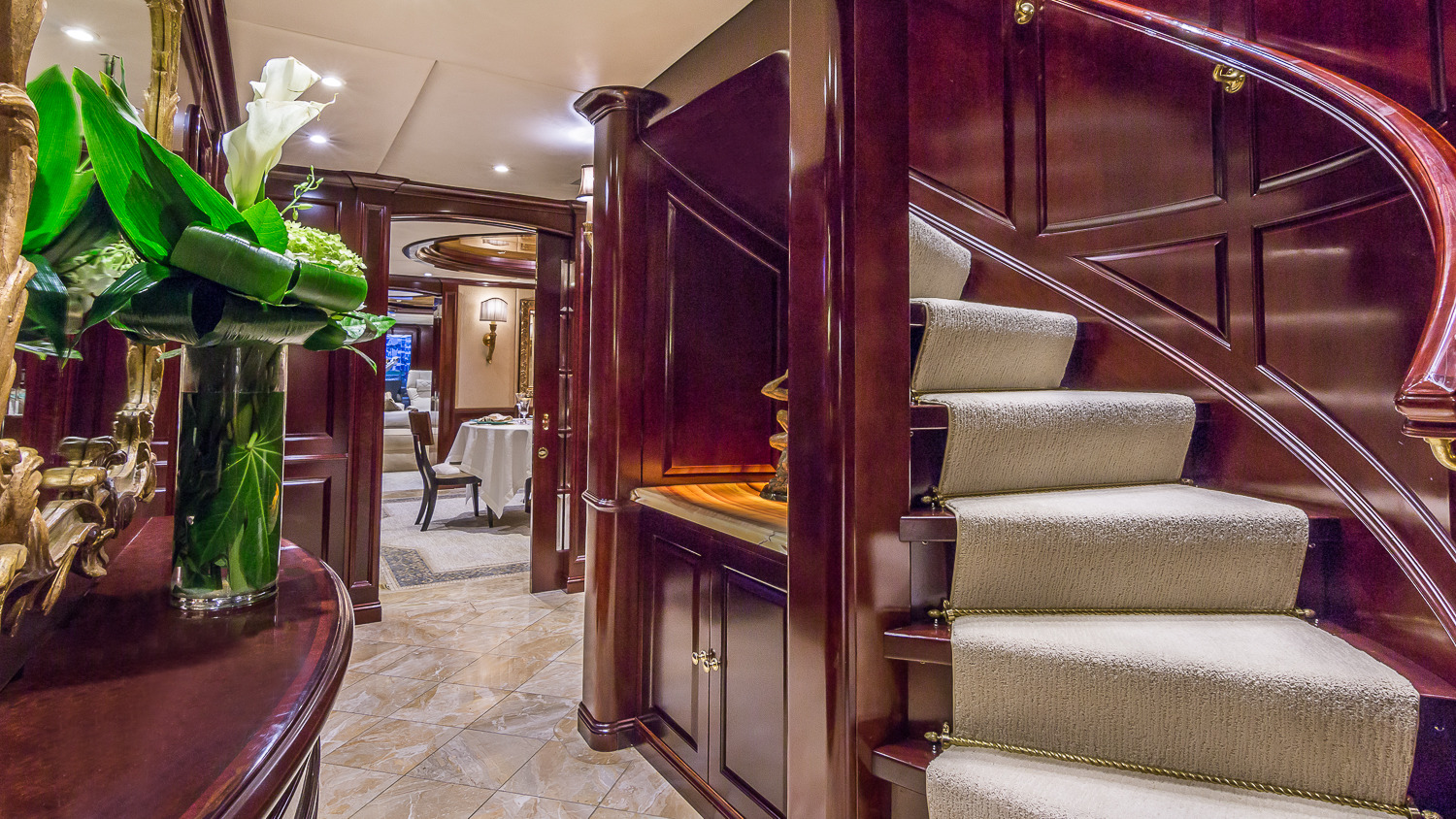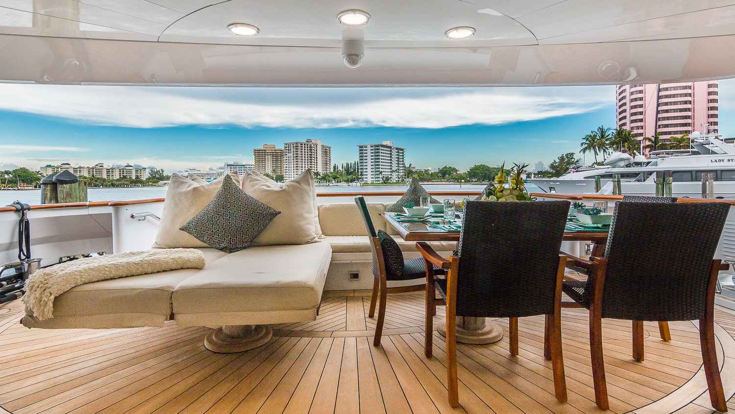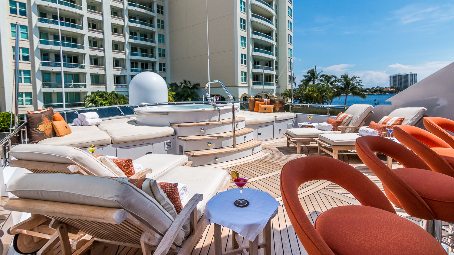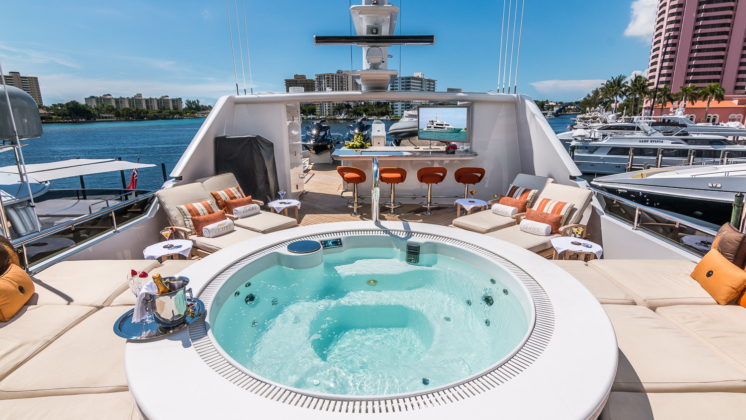 CLAIRE is a stunning 46 metre Trinity Yachts creation launched in 2003. She accommodates up to 10 guests in 5 classic staterooms and is available for charter along the Floridian coastline and in the Bahamas. She is an eclectic mix of interior and exterior volume, offering a rare 4 king cabins and a twin. Outside the al fresco dining area is expansive and can easily seat 12, whilst on the flydeck the jacuzzi and sunbathing area take centre stage on their stunning elevated platform. Her interior is classic, clean and offers a taste of the palatial. She offers extensive space as well as state-of-the-art electronics throughout.