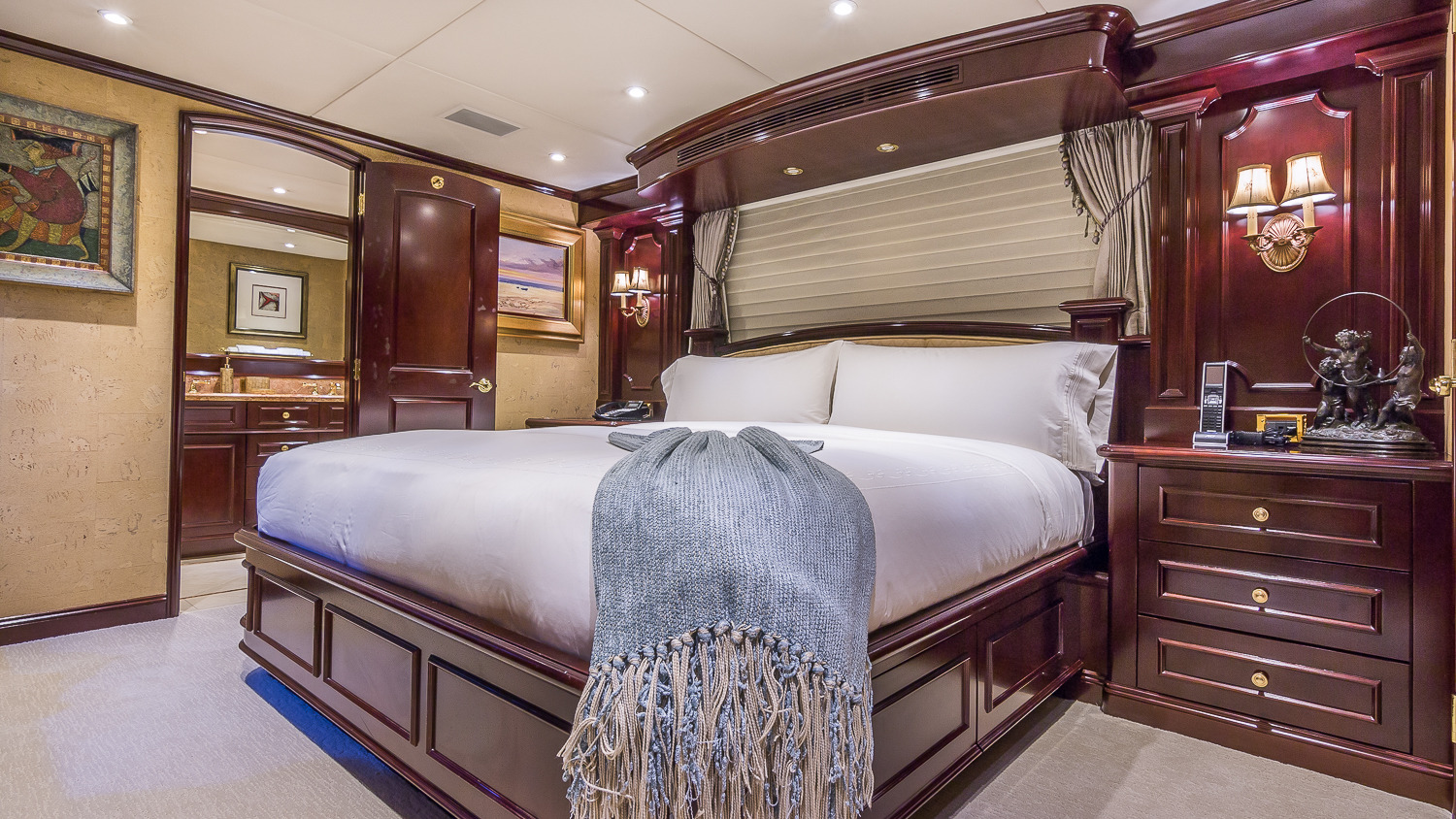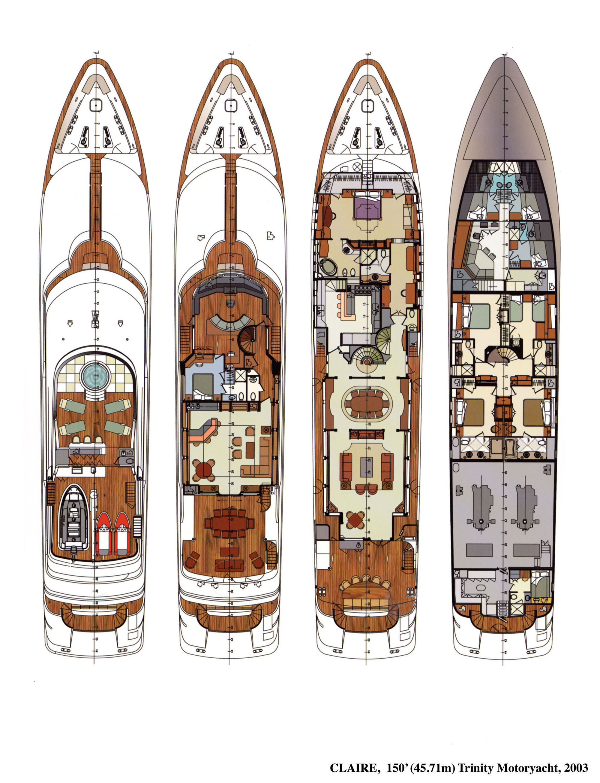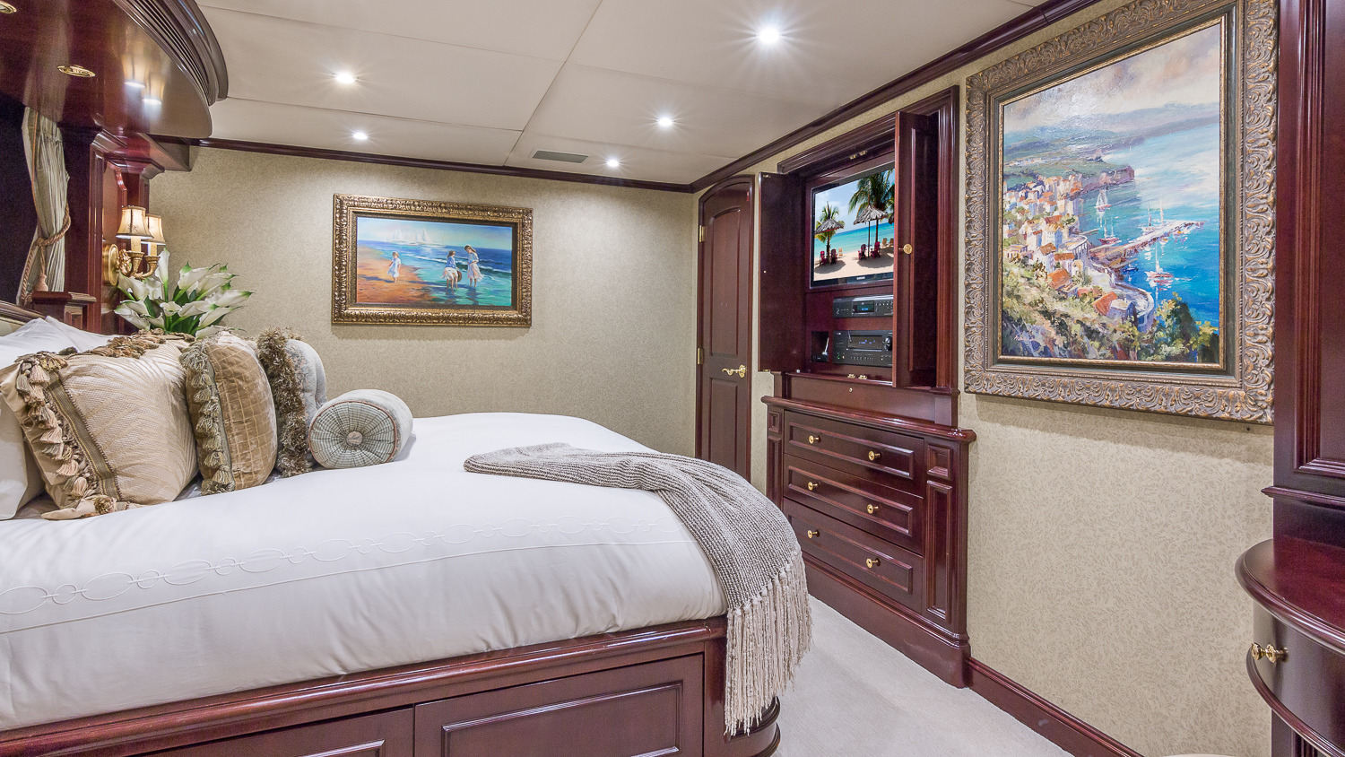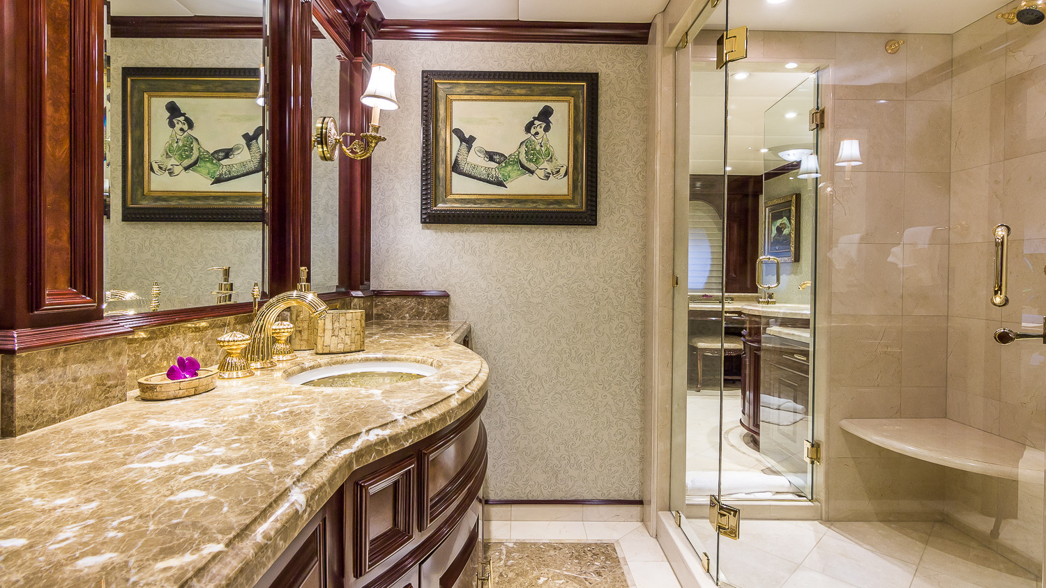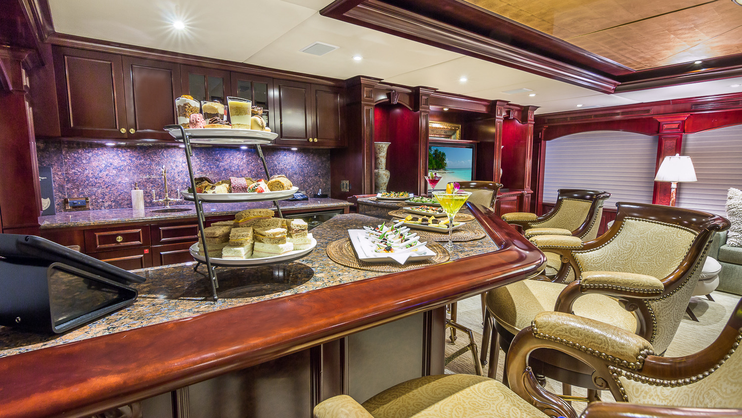CLAIRE maintains all the comforts of a five-star resort—perfect for families and romantic getaways. Her outdoor main aft deck dining tables convert to one or two daybeds, allowing four different aft deck layouts, maximizing the lounging and dining options on this deck. A large-screen TV makes this area perfect for movie nights. Her sun deck is superior, and features a bar, BBQ grill, day head, huge Jacuzzi, huge sunpad, treadmill, and a large-screen TV. CLAIRE sleeps 11 guests in 5 staterooms. The owner's cabin is located forward (full width) on the main deck. There are 4 extra large guest staterooms. 3 are King cabins and the fourth guest cabin is a twin bedded cabin with a pullman.