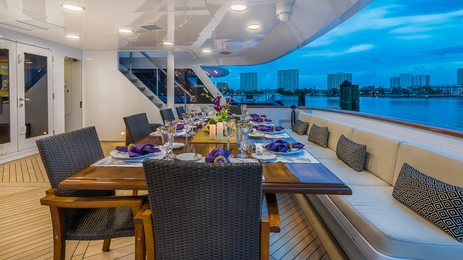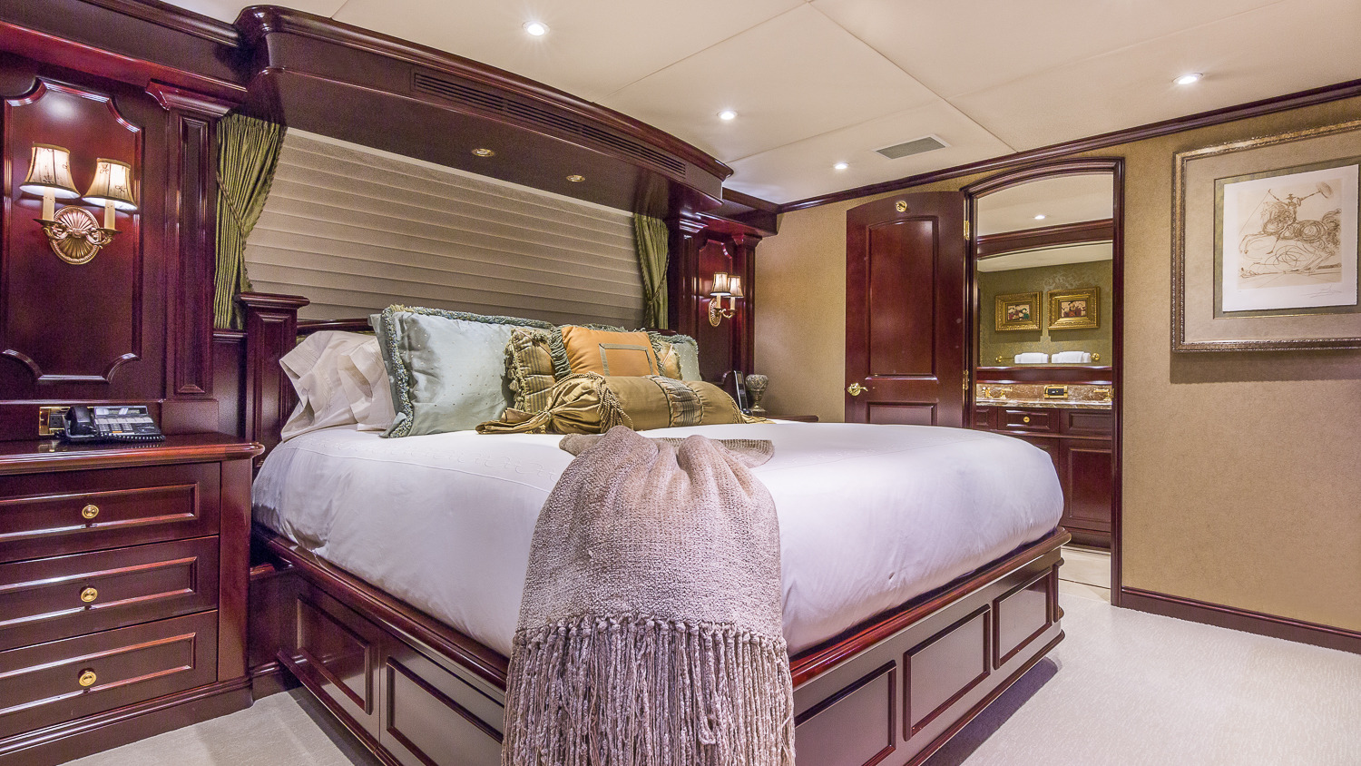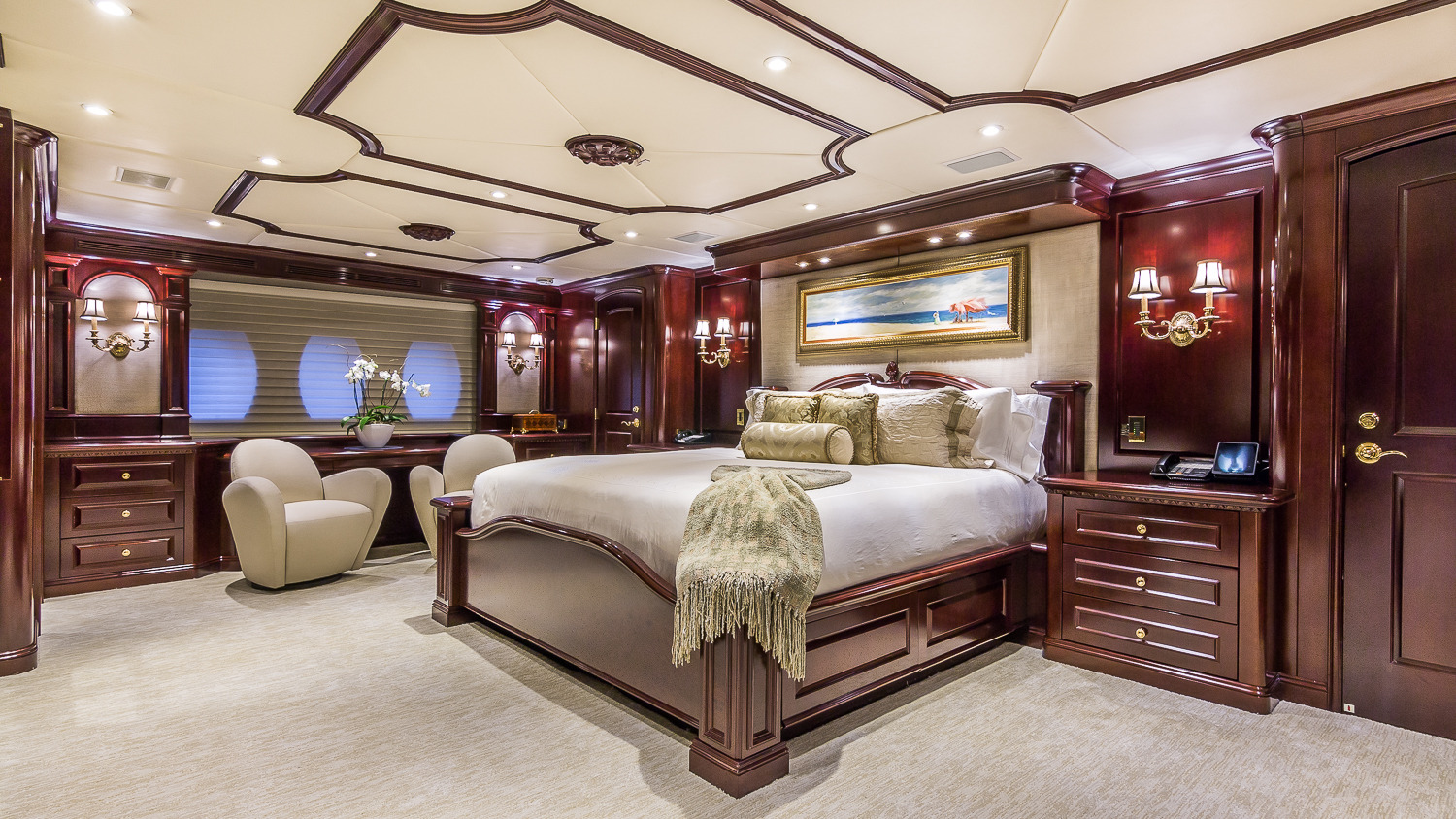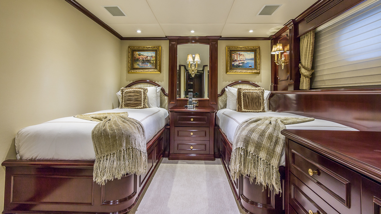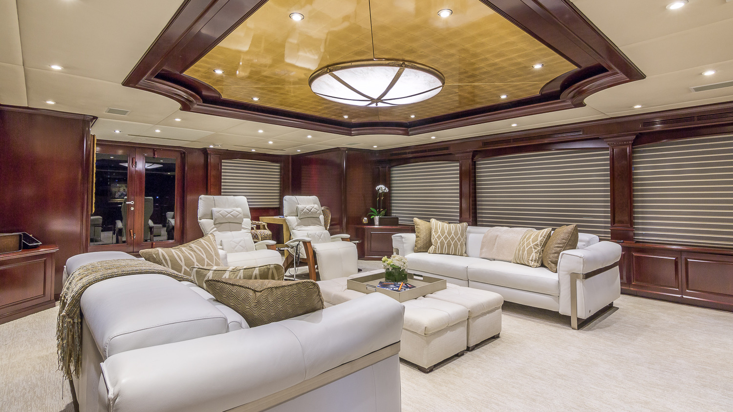 CLAIRE maintains all the comforts of a five-star resort—perfect for families and romantic getaways. Her outdoor main aft deck dining tables convert to one or two daybeds, allowing four different aft deck layouts, maximizing the lounging and dining options on this deck. A large-screen TV makes this area perfect for movie nights. Her sun deck is superior, and features a bar, BBQ grill, day head, huge Jacuzzi, huge sunpad, treadmill, and a large-screen TV. CLAIRE sleeps 11 guests in 5 staterooms. The owner's cabin is located forward (full width) on the main deck. There are 4 extra large guest staterooms. 3 are King cabins and the fourth guest cabin is a twin bedded cabin with a pullman.