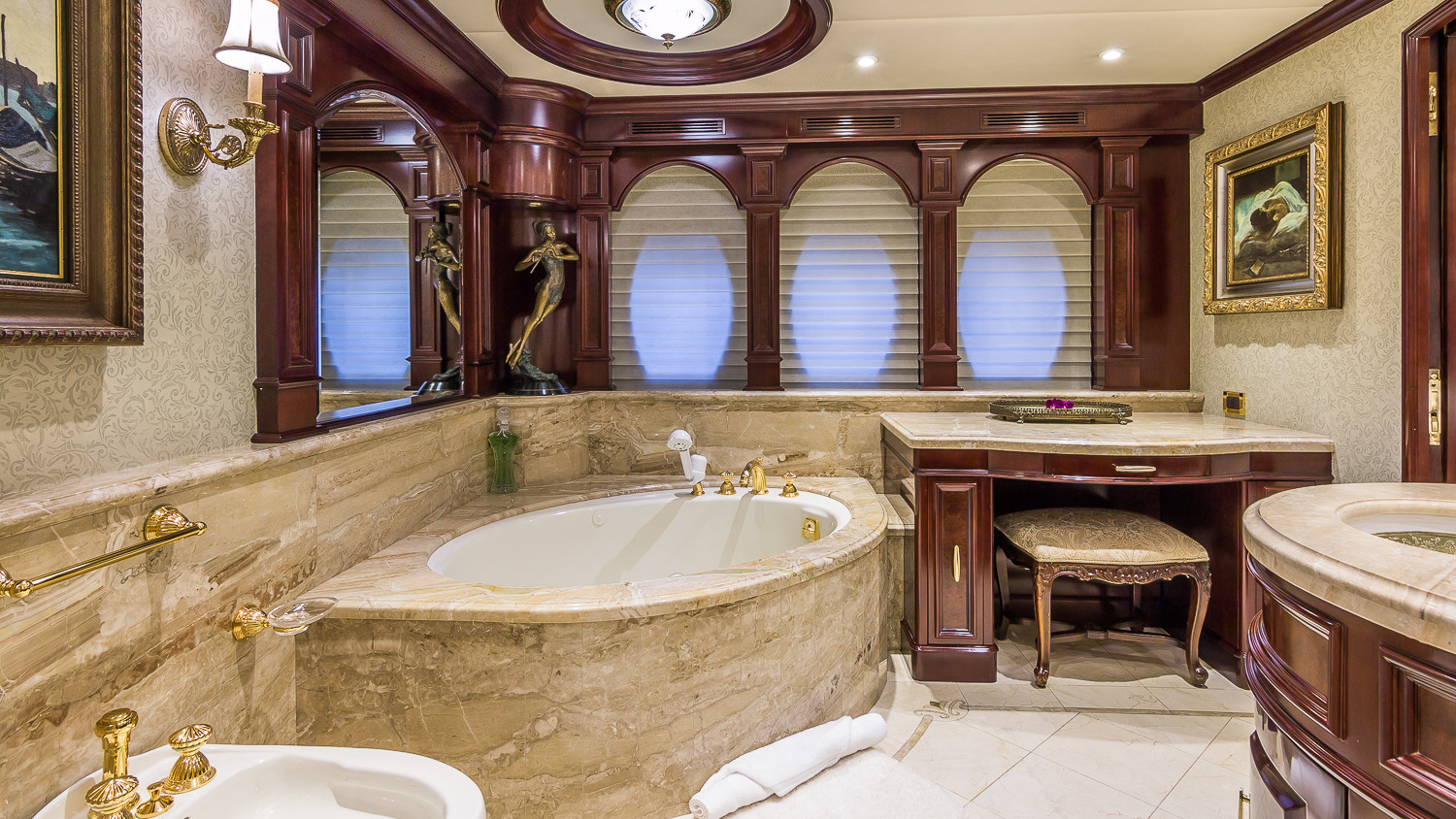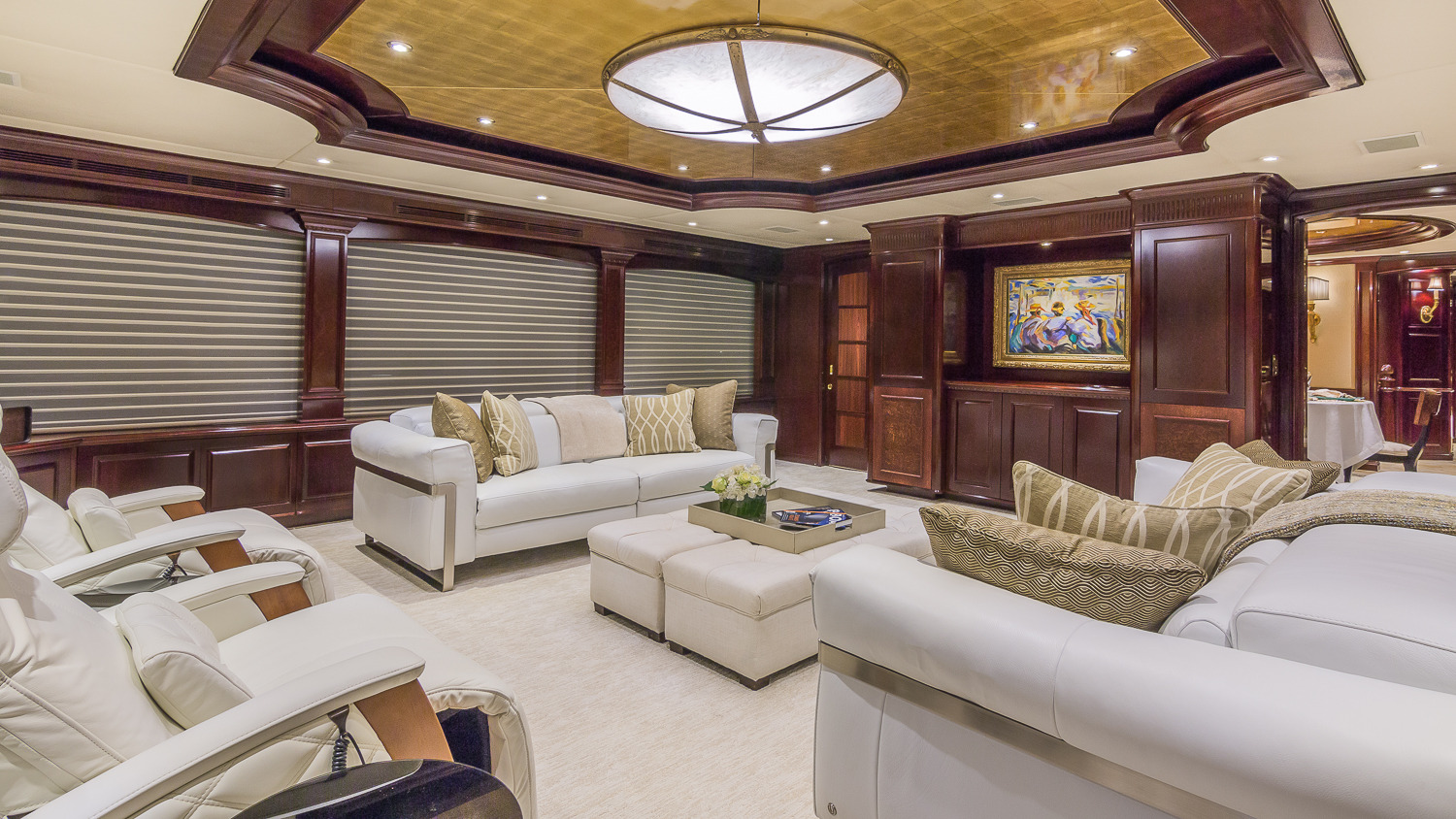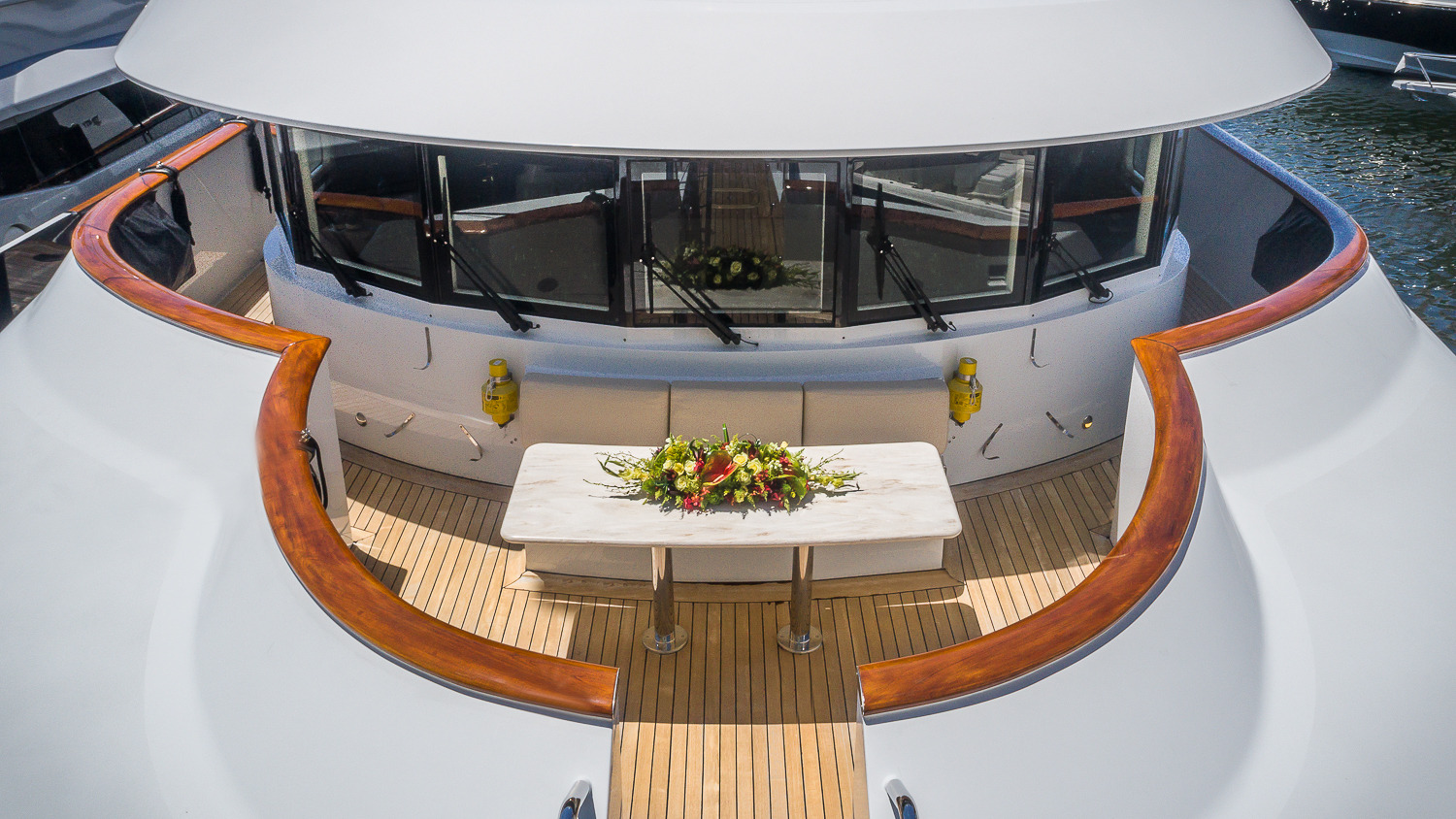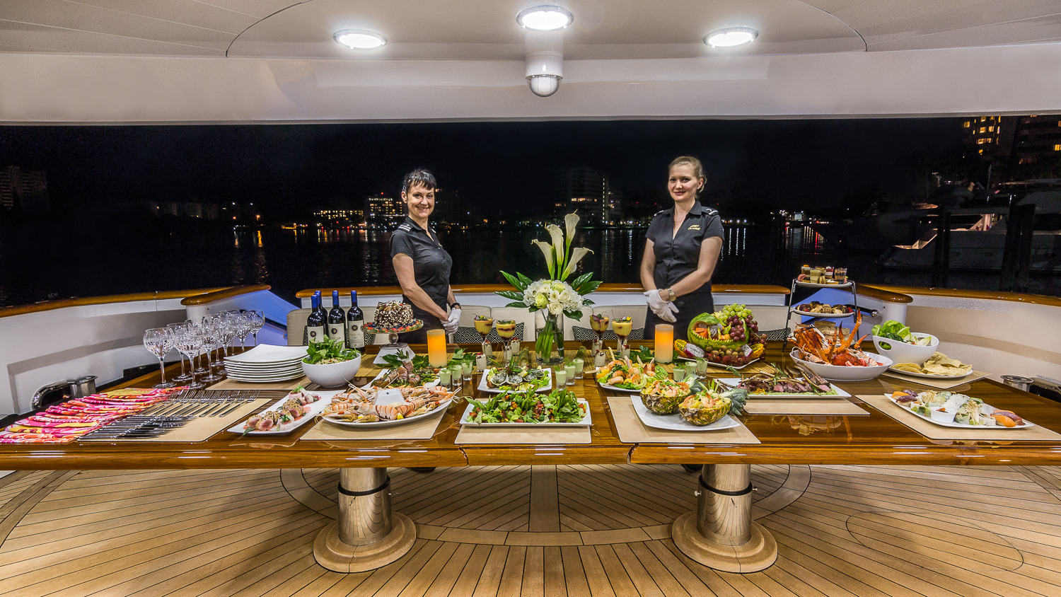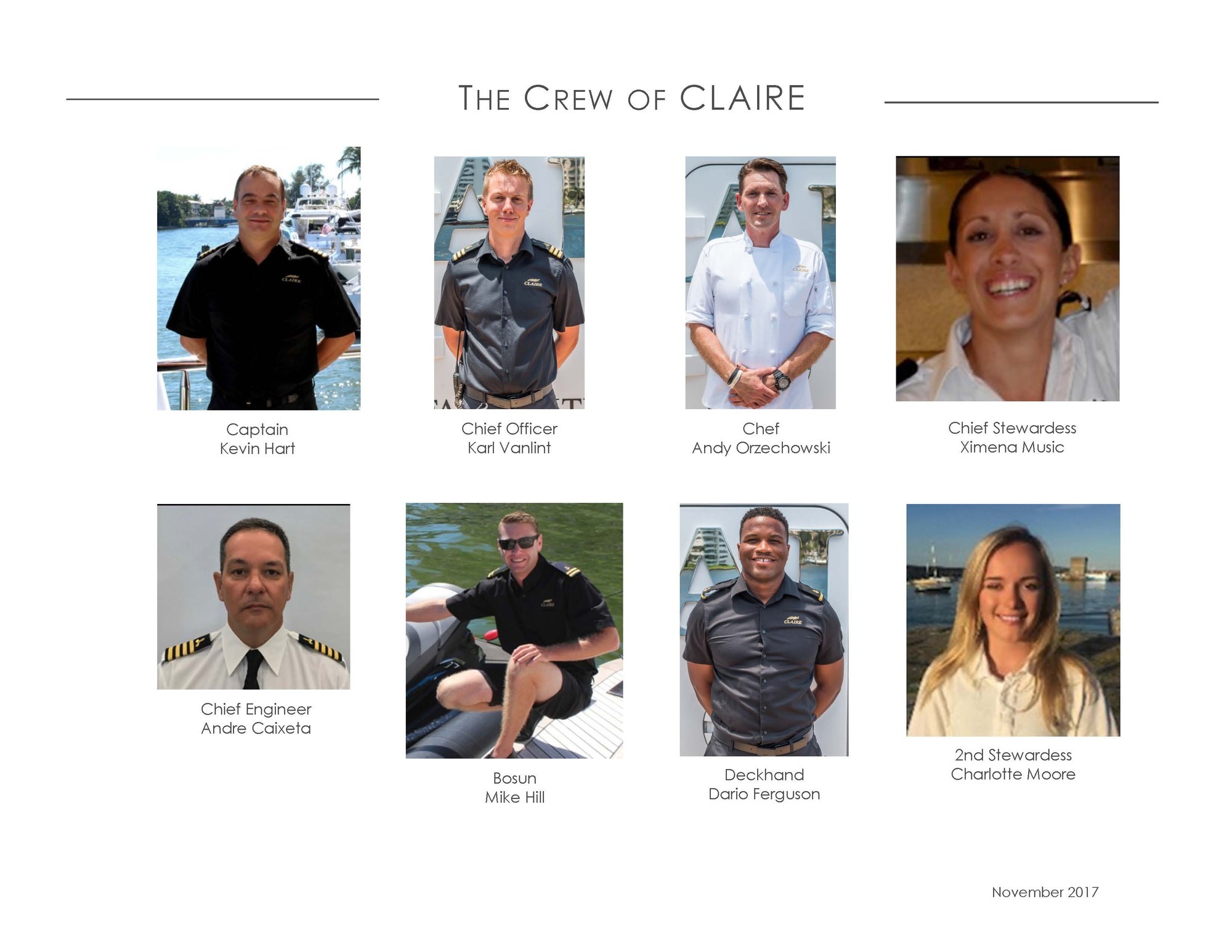 CLAIRE maintains all the comforts of a five-star resort—perfect for families and romantic getaways. Her outdoor main aft deck dining tables convert to one or two daybeds, allowing four different aft deck layouts, maximizing the lounging and dining options on this deck. A large-screen TV makes this area perfect for movie nights. Her sun deck is superior, and features a bar, BBQ grill, day head, huge Jacuzzi, huge sunpad, treadmill, and a large-screen TV. CLAIRE sleeps 11 guests in 5 staterooms. The owner's cabin is located forward (full width) on the main deck. There are 4 extra large guest staterooms. 3 are King cabins and the fourth guest cabin is a twin bedded cabin with a pullman.