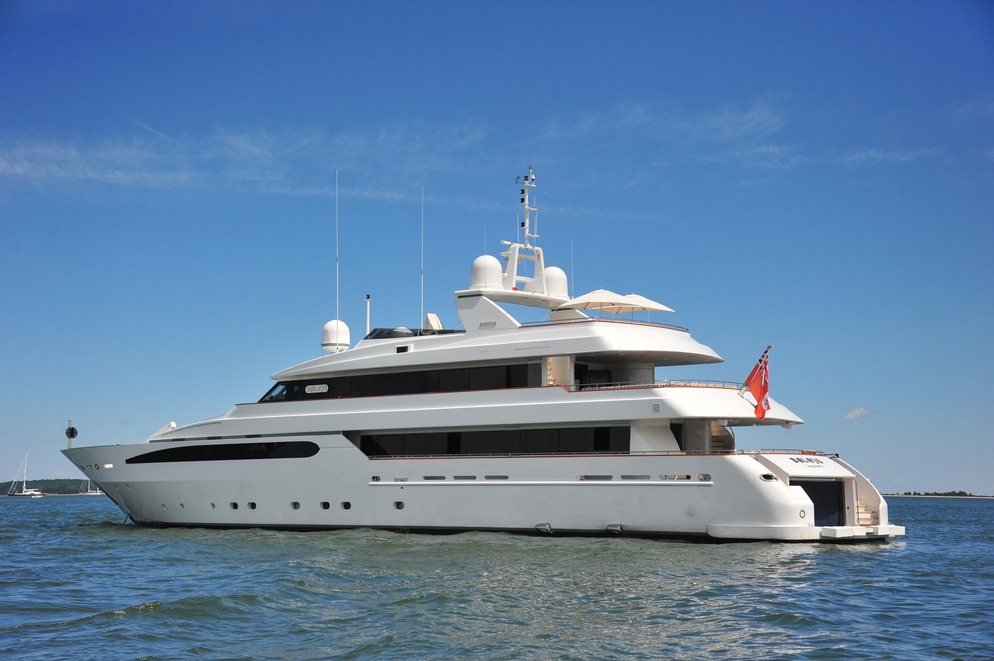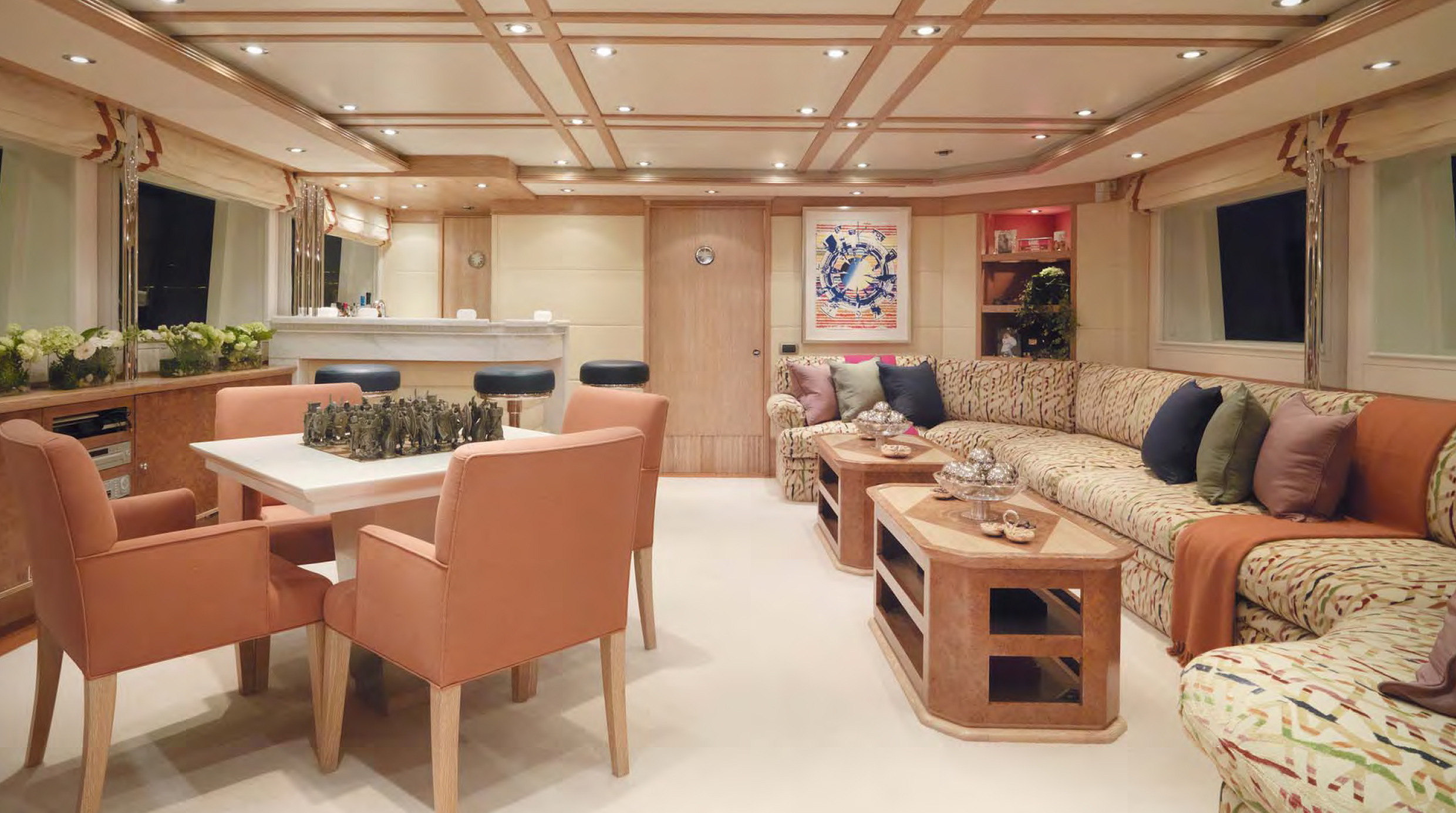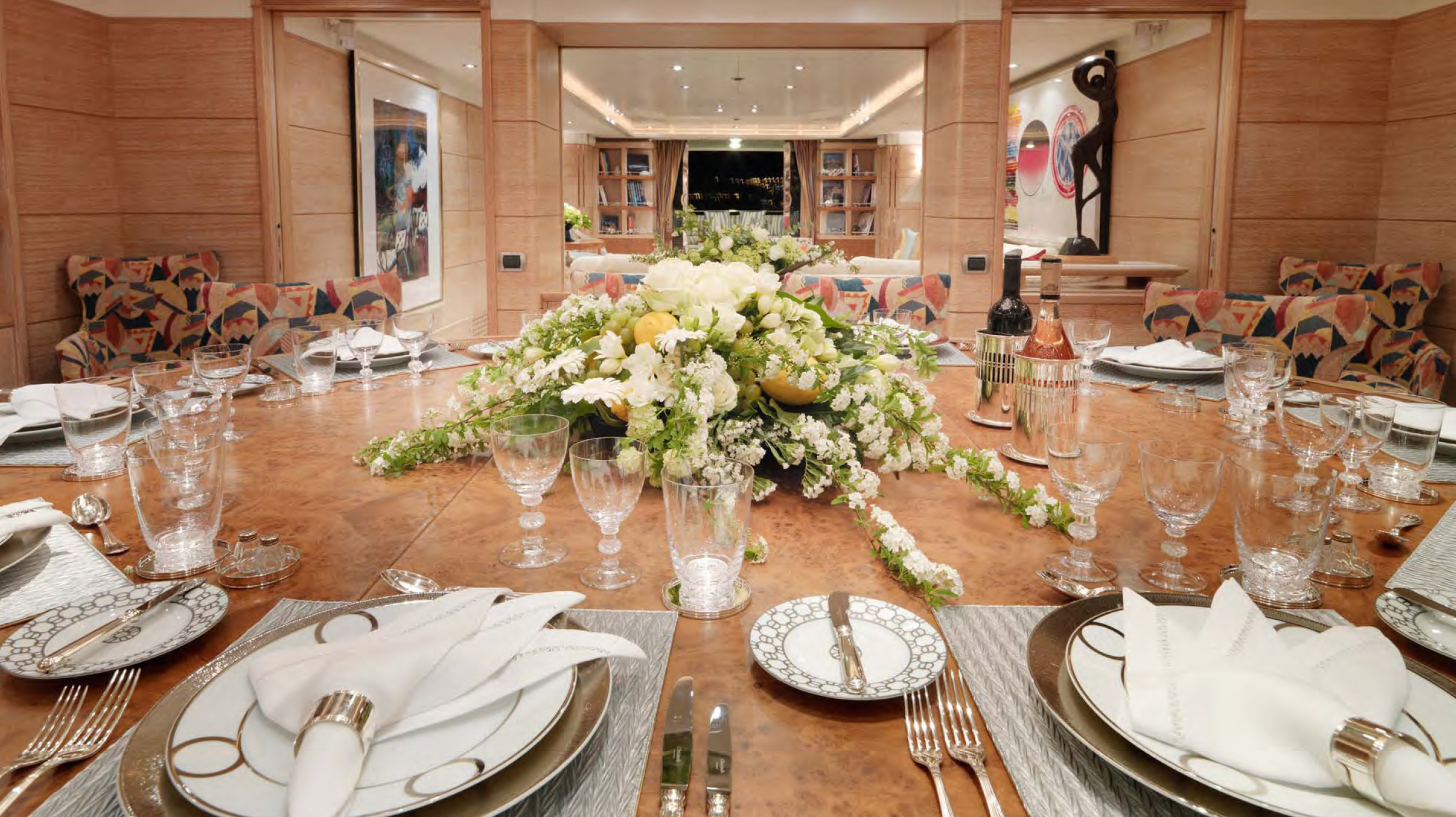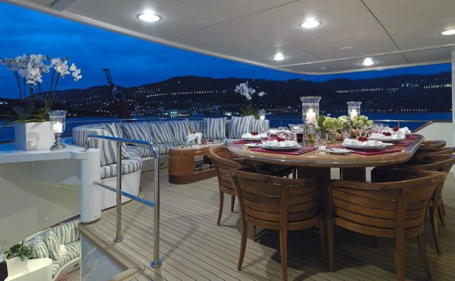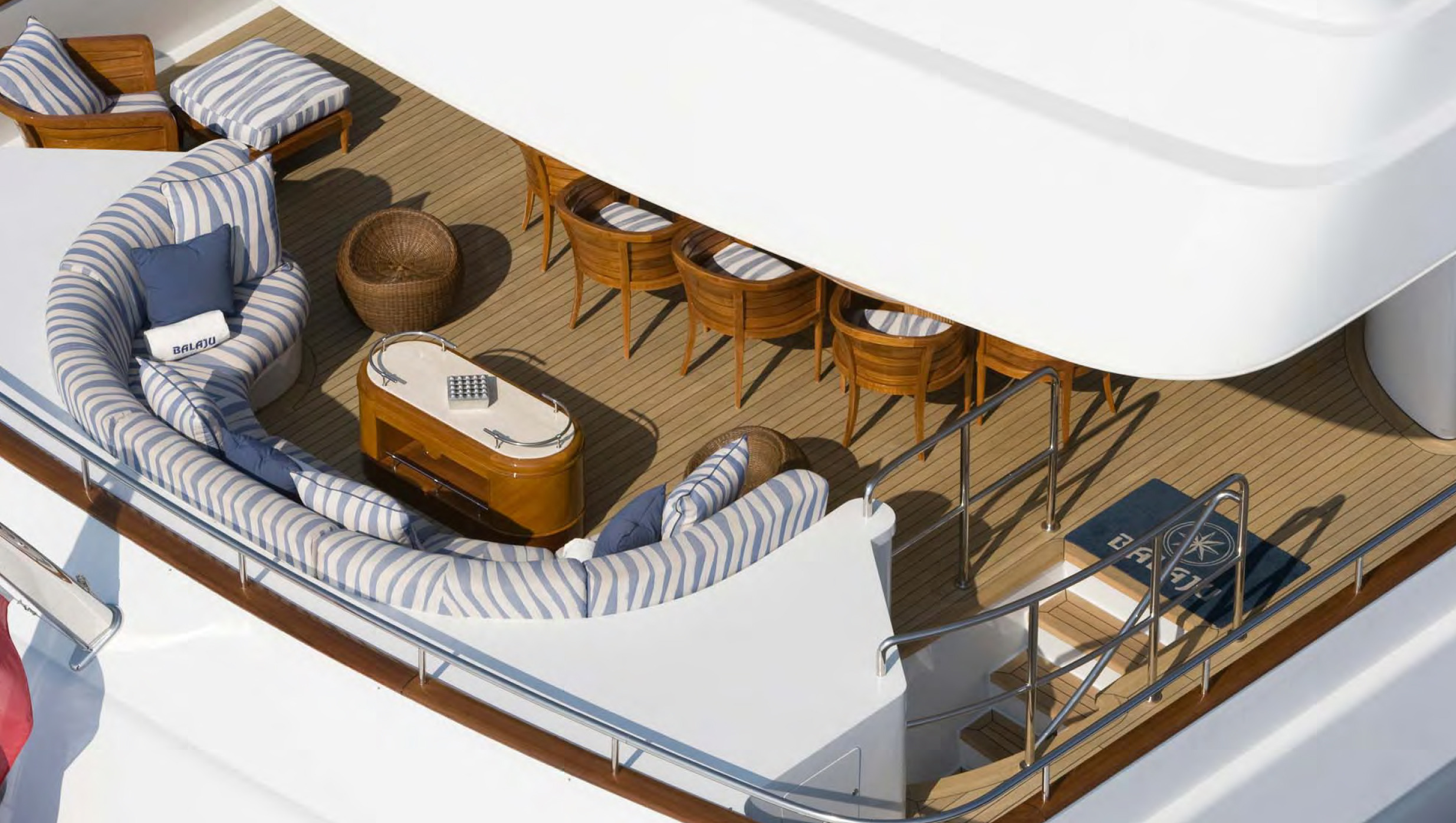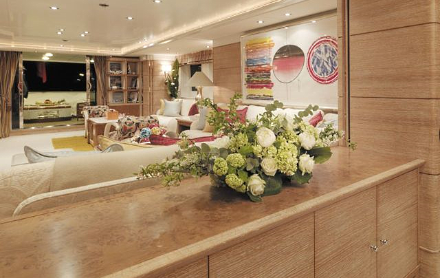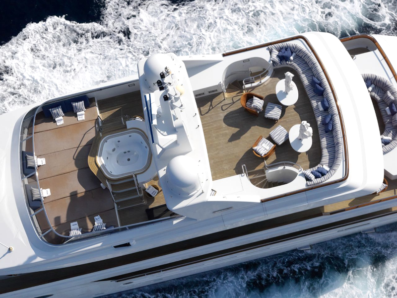BALAJU’s interior is an elegant blend of warm, neutral tones and bright colours using some dramatic furniture and fabrics to add sophistication to this delightful charter yacht. Launched by Intermarine in 2002, she had a refit in 2015. The crew is extremely family-friendly, and charter yacht BALAJU is equipped with a large array of sports equipment from scuba gear to bicycles and even a water trampoline. For guests who like to stay in shape, BALAJU will be ideal with a large portion of the main deck devoted to a gym with a treadmill, weights and other workout equipment. This is adjacent to a dining saloon seating up to 12 guests, where BALAJU’s talented chef can serve up healthy and delicious meals to keep the training programme up to speed. Charter yacht BALAJU’s spacious sundeck has a Jacuzzi, bar and dining area as well as considerable space for sunbathing. The bridge deck skylounge is ideal for entertaining, with a large TV, marble bar and games table. A full-beam master suite is situated on the main deck – which includes a private study – with four guest cabins on the lower deck. All of the accommodation boasts marble adorned en suite bathrooms. Twin 1,350hp Caterpillar engines give BALAJU a cruising speed of 10 knots. AT A GLANCE Private study in owner’s suite Formal dining area Francois Zuretti interior