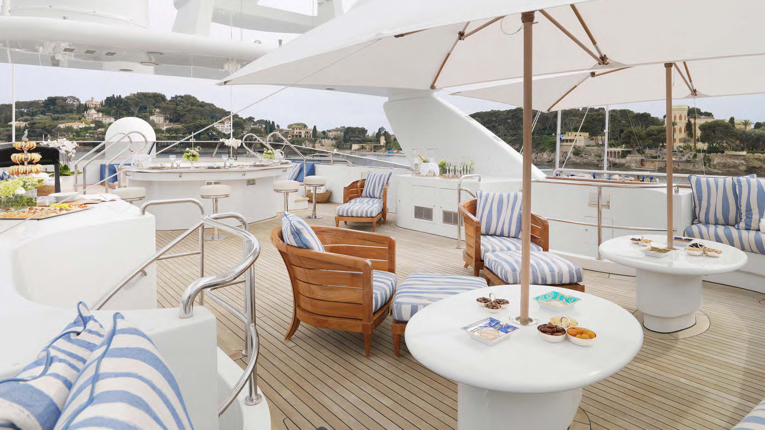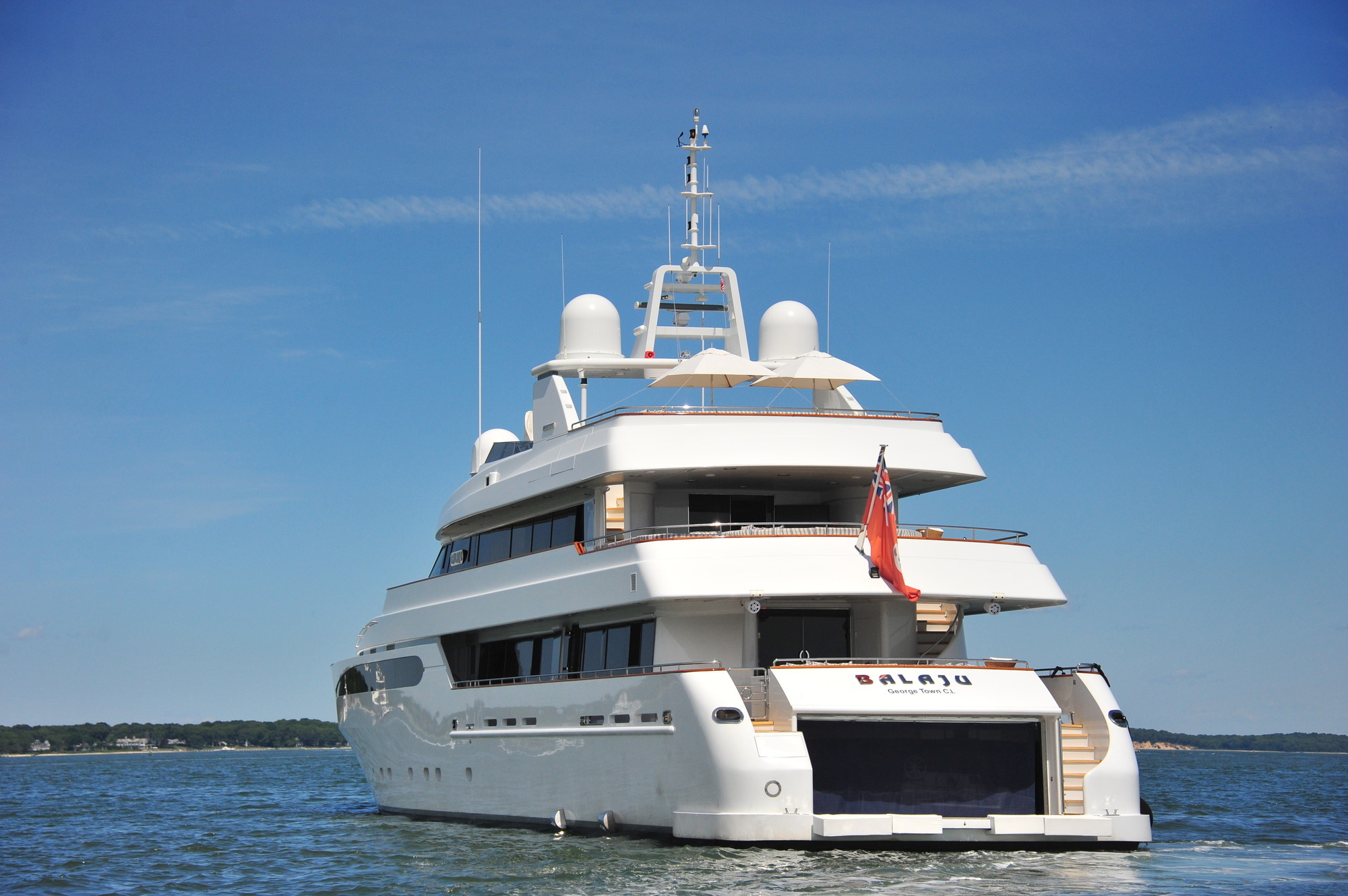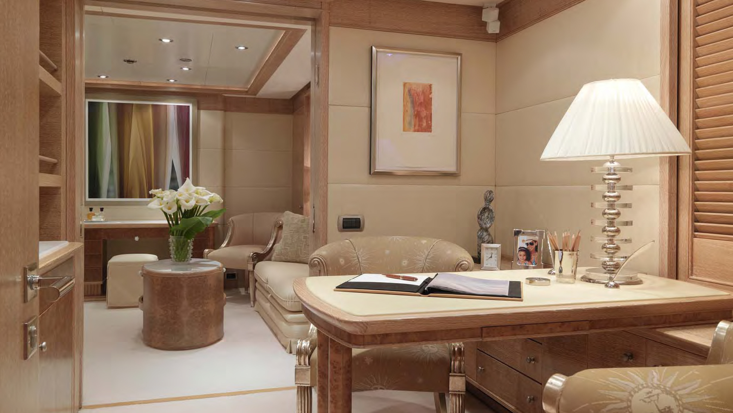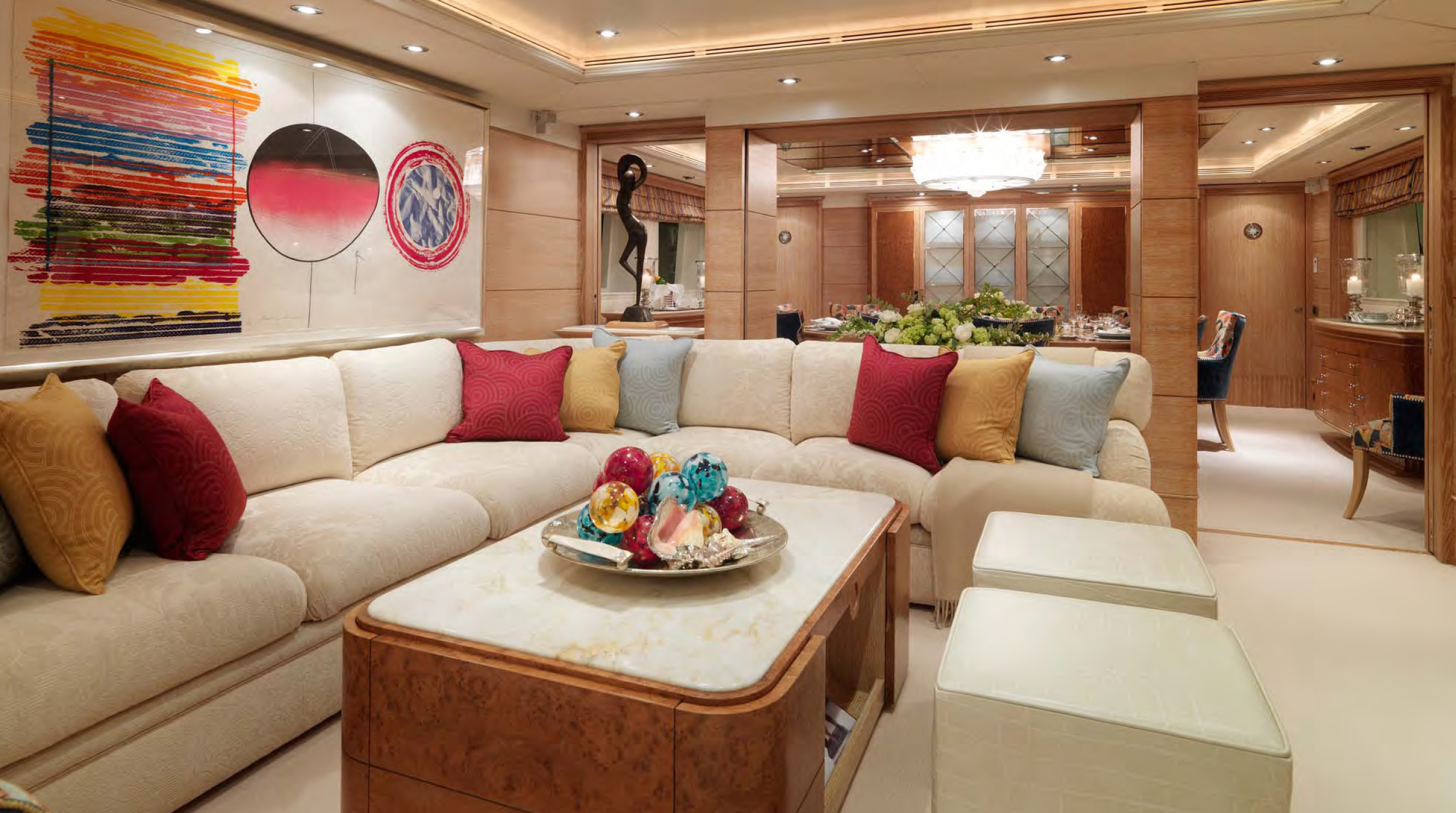BALAJU’s interior is an elegant blend of warm, neutral tones and bright colours using some dramatic furniture and fabrics to add sophistication to this delightful charter yacht. Launched by Intermarine in 2002, she had a refit in 2015. The crew is extremely family-friendly, and charter yacht BALAJU is equipped with a large array of sports equipment from scuba gear to bicycles and even a water trampoline. For guests who like to stay in shape, BALAJU will be ideal with a large portion of the main deck devoted to a gym with a treadmill, weights and other workout equipment. This is adjacent to a dining saloon seating up to 12 guests, where BALAJU’s talented chef can serve up healthy and delicious meals to keep the training programme up to speed. Charter yacht BALAJU’s spacious sundeck has a Jacuzzi, bar and dining area as well as considerable space for sunbathing. The bridge deck skylounge is ideal for entertaining, with a large TV, marble bar and games table. A full-beam master suite is situated on the main deck – which includes a private study – with four guest cabins on the lower deck. All of the accommodation boasts marble adorned en suite bathrooms. Twin 1,350hp Caterpillar engines give BALAJU a cruising speed of 10 knots. AT A GLANCE Private study in owner’s suite Formal dining area Francois Zuretti interior