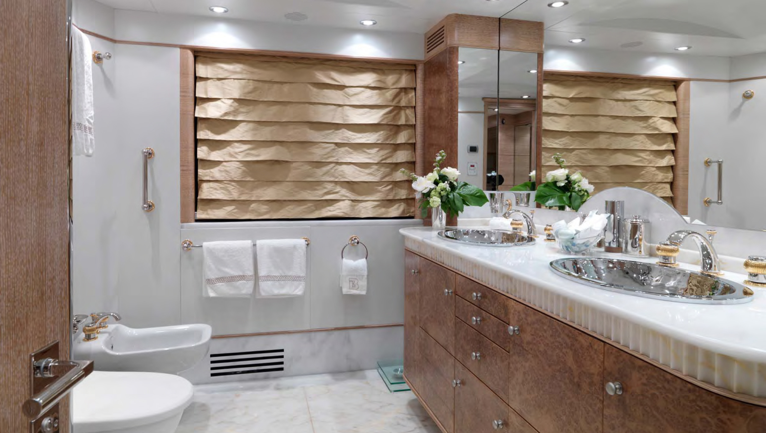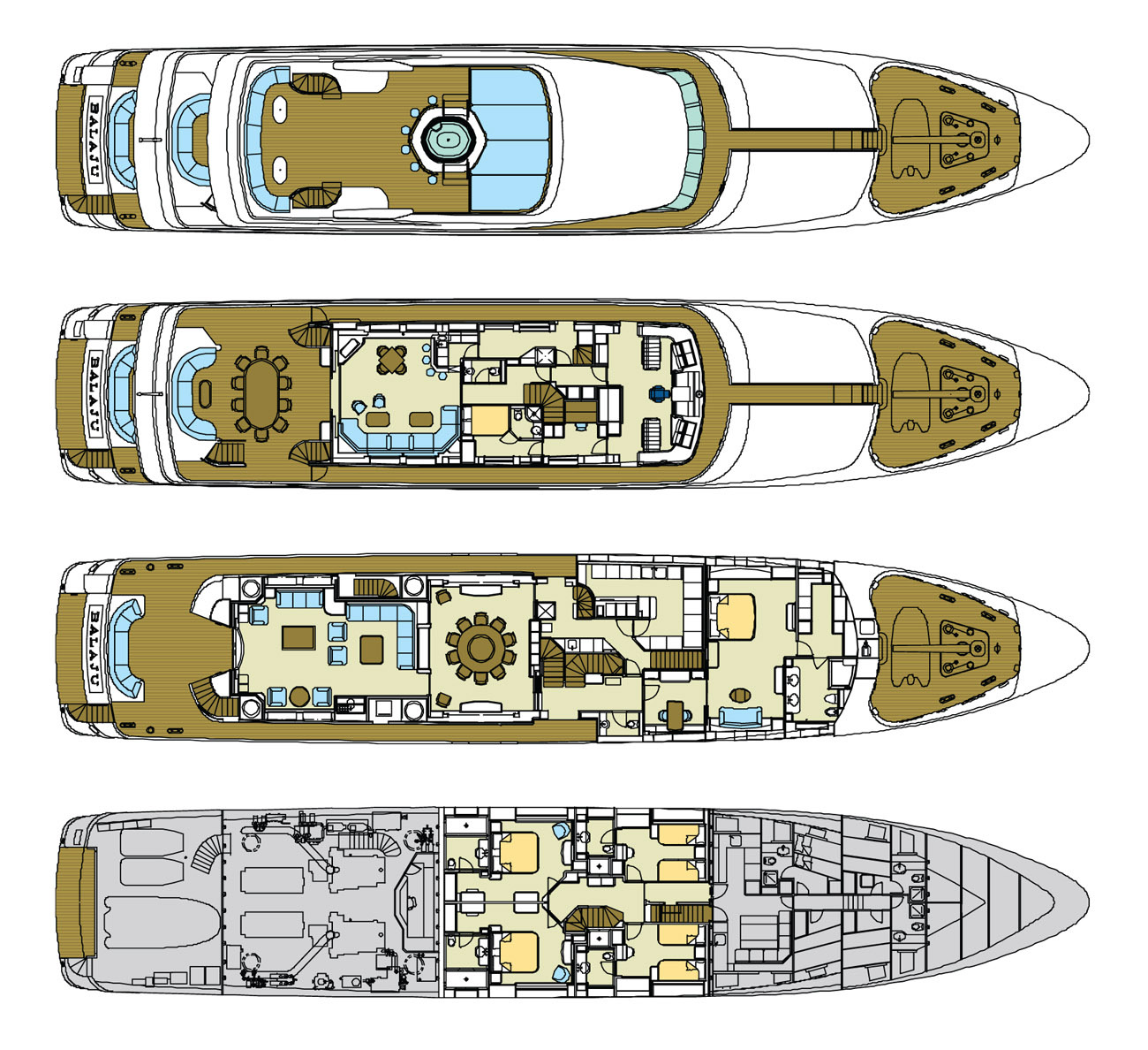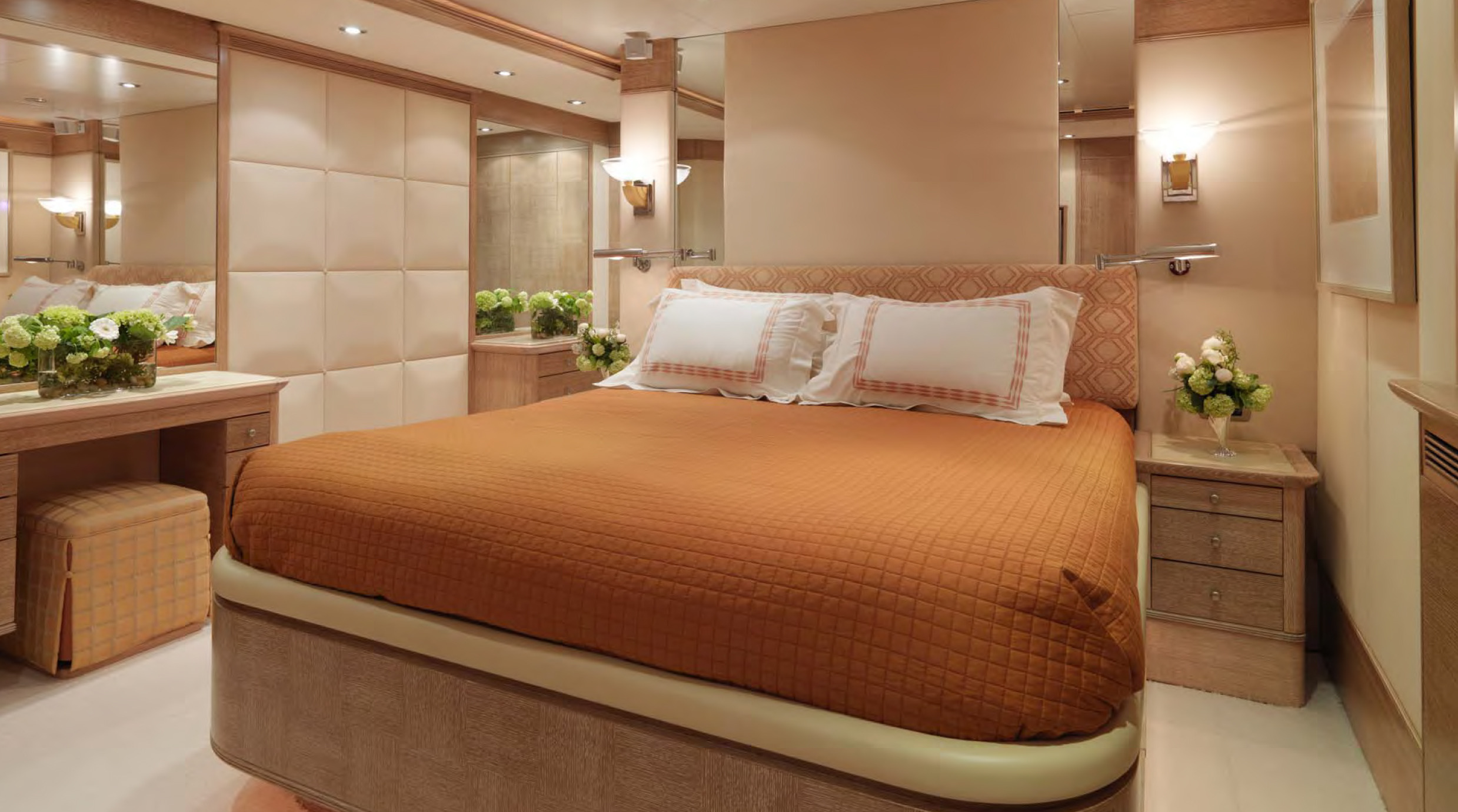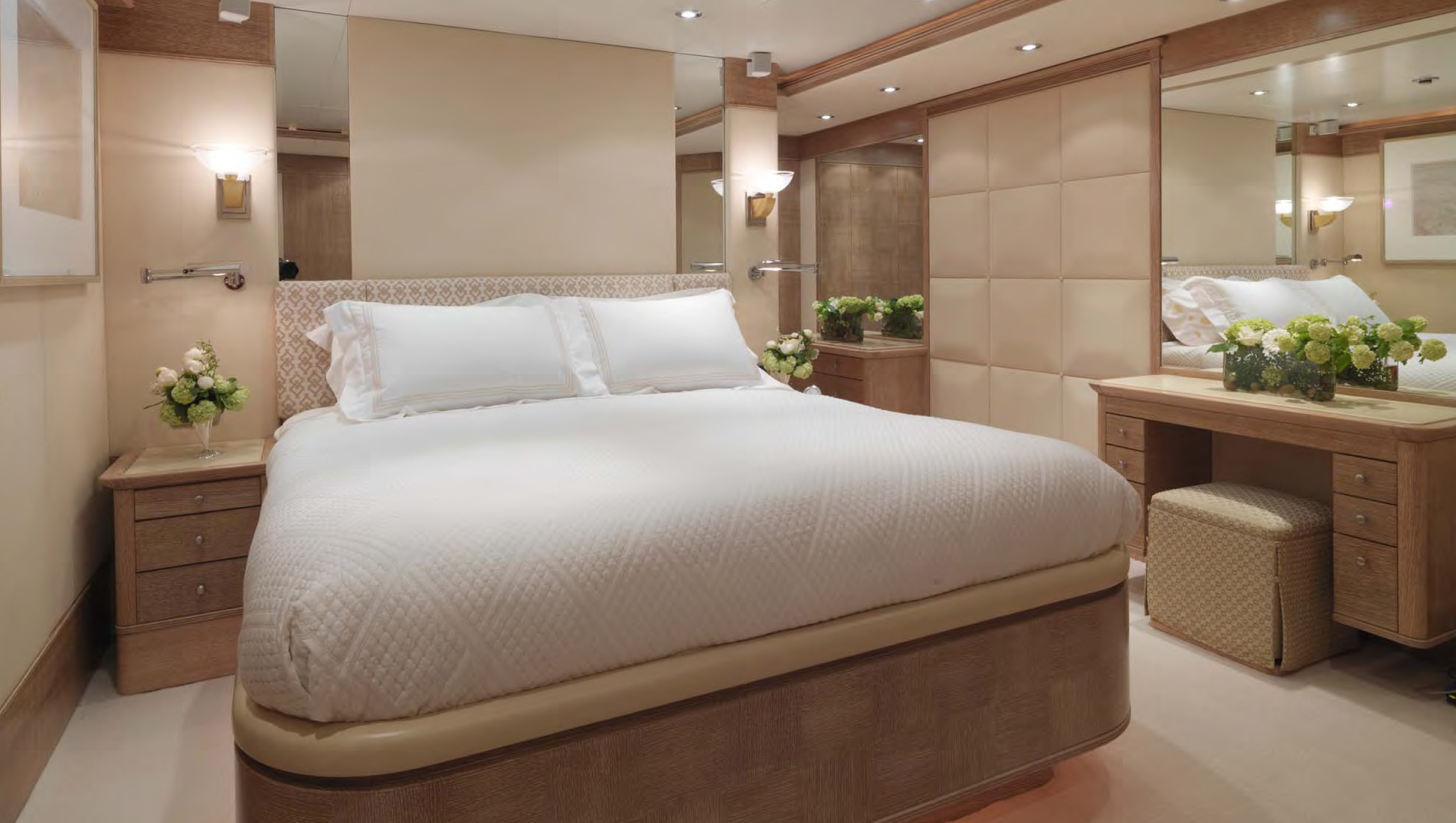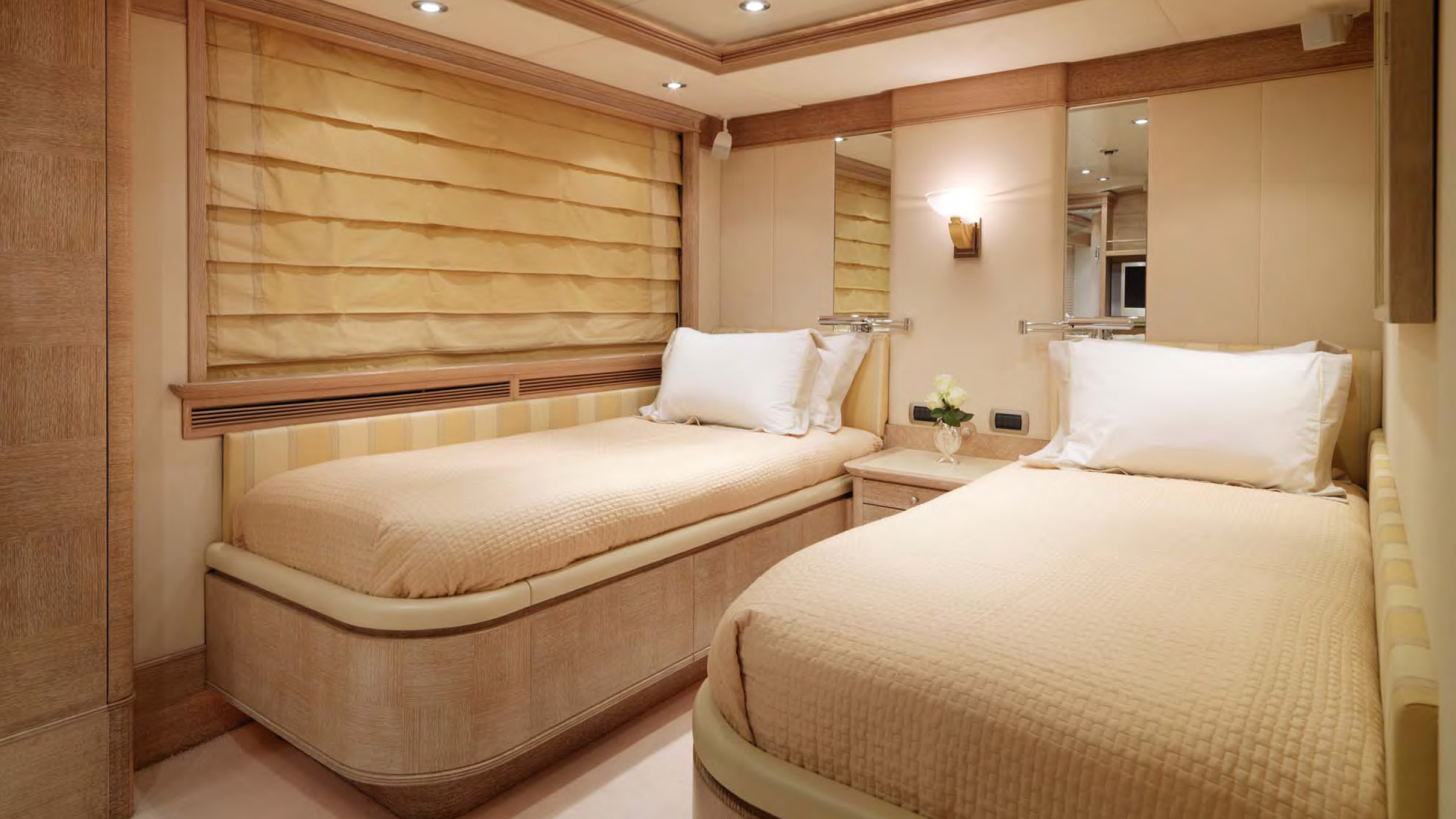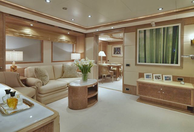 MAIN DECK Master cabin:( Full Beam) King-sized bed, marble-topped tables, dressing room and en-suite marble bath. Private study with leather-topped table, marble-topped wall unit and double sofa and ottoman. On Deck Powder Room Large dining room with extra large dining table Main Salon - forward and aft seating Aft Deck: Large curved seating area and cocktail table, with access to swim platform and passarelle. A stern door folds down to become a "beach club" with teak deck / access to toy and tender garage. LOWER DECK Guest cabin: Queen-sized bed, en-suite marble bath with shower. Guest cabin: Queen-sized bed, en-suite marble bath with shower. Guest cabin: Twin beds, en-suite marble bath with shower. Guest cabin: Twin beds, en-suite marble bath with shower. BED SIZES Master - 2m long x 1.92m wide Aft port/stbd - 1.94m long x 1.7m wide (note the headboard on these take out 6cm otherwise the mattress will be 2m in length. Fwd port/stbd twin rooms - 2m long x 0.85m wide.