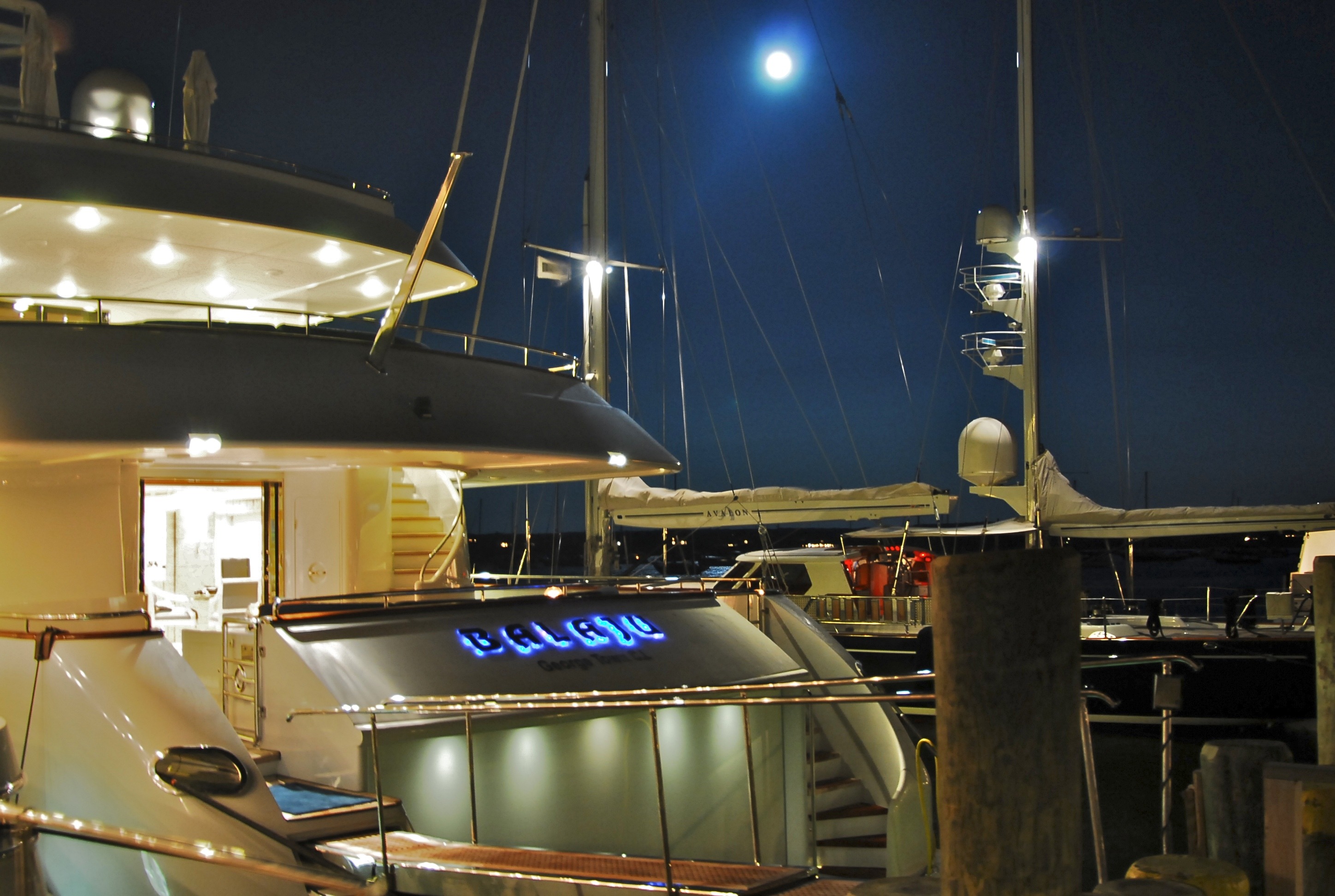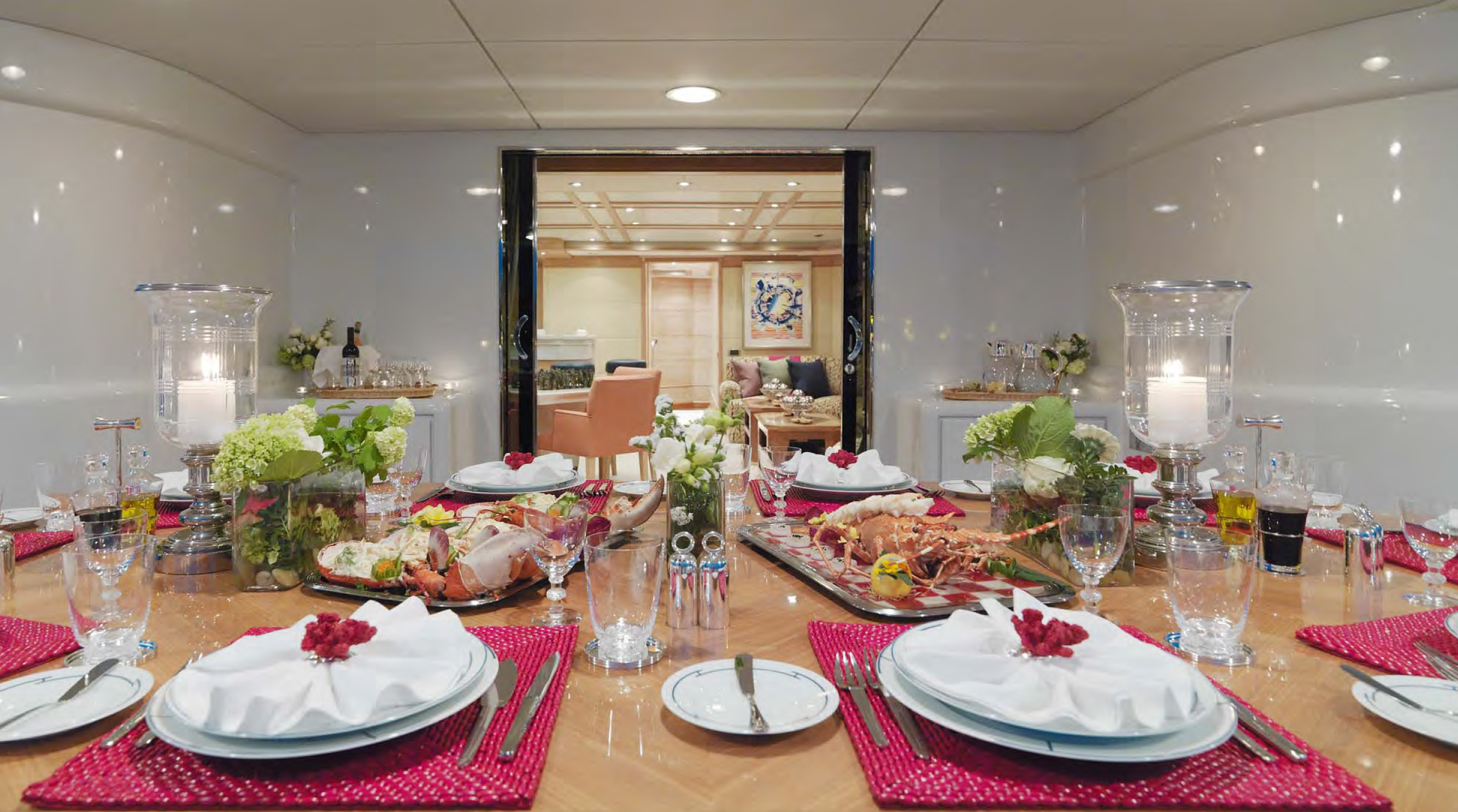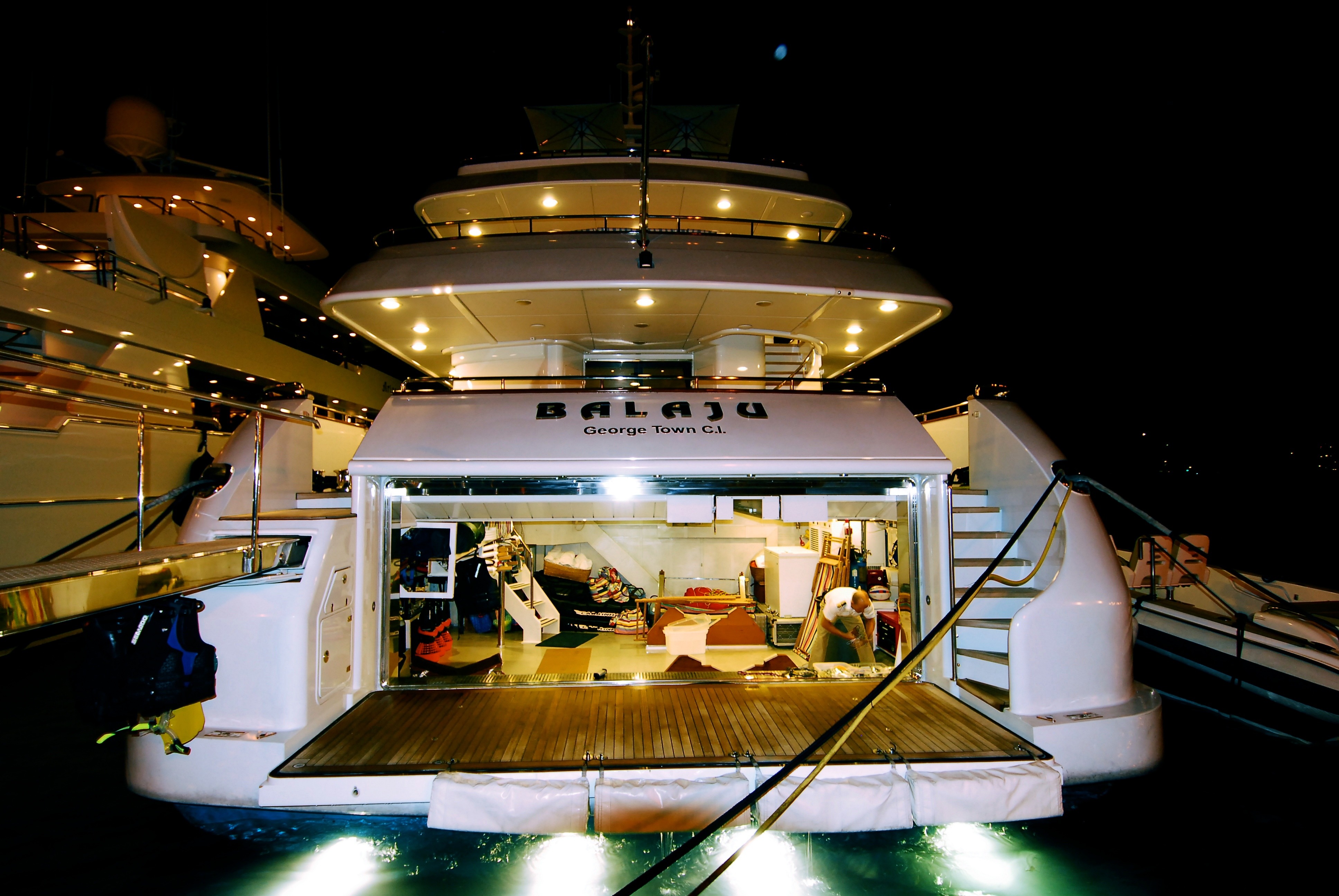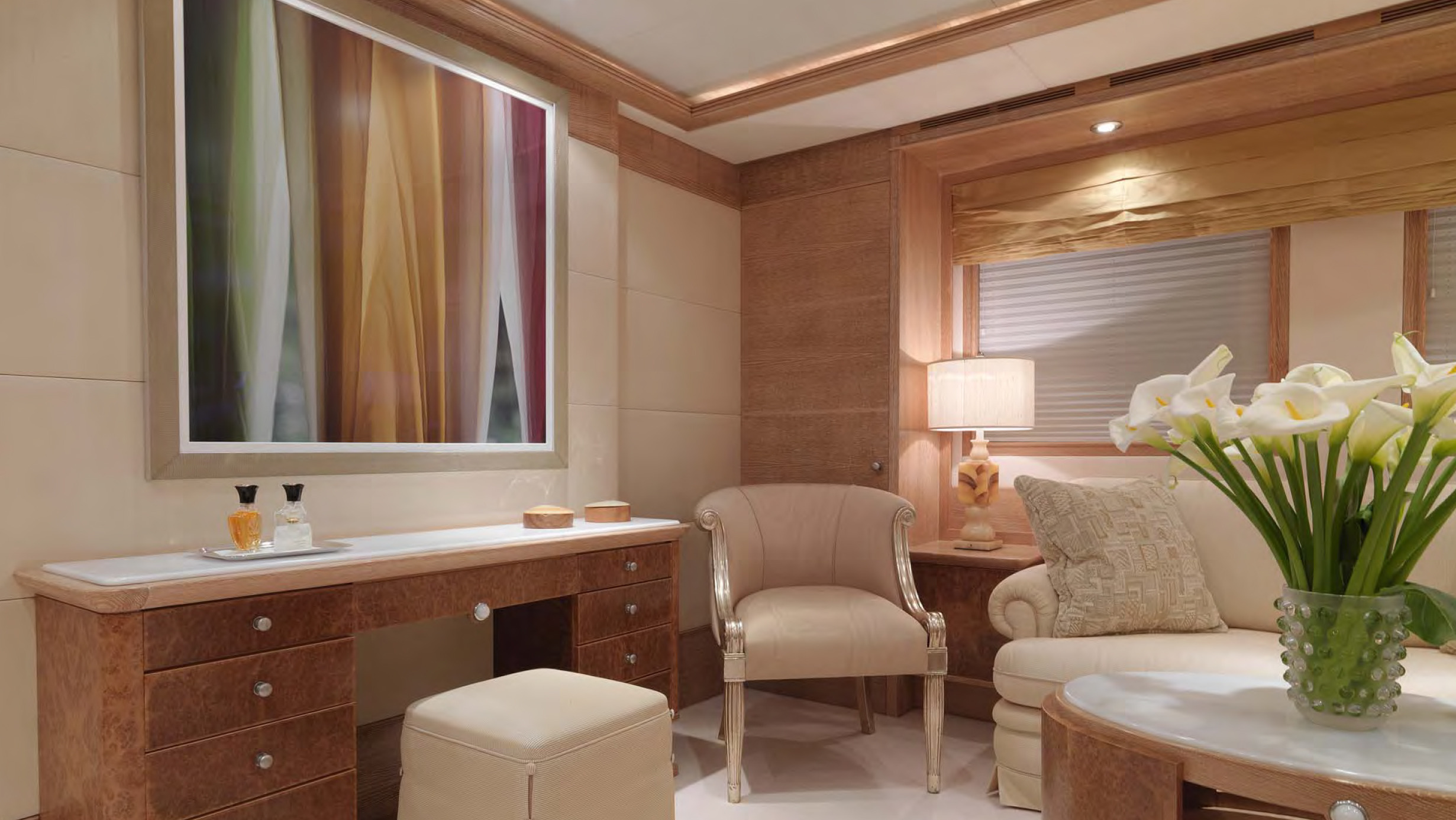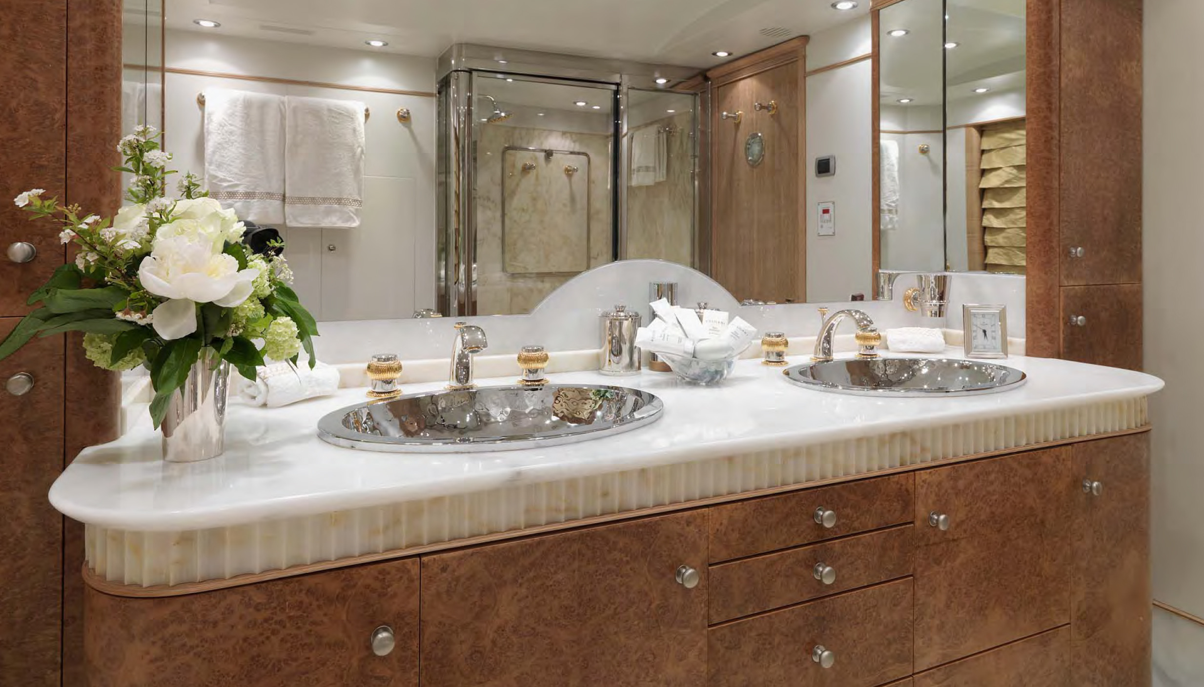 MAIN DECK Master cabin:( Full Beam) King-sized bed, marble-topped tables, dressing room and en-suite marble bath. Private study with leather-topped table, marble-topped wall unit and double sofa and ottoman. On Deck Powder Room Large dining room with extra large dining table Main Salon - forward and aft seating Aft Deck: Large curved seating area and cocktail table, with access to swim platform and passarelle. A stern door folds down to become a "beach club" with teak deck / access to toy and tender garage. LOWER DECK Guest cabin: Queen-sized bed, en-suite marble bath with shower. Guest cabin: Queen-sized bed, en-suite marble bath with shower. Guest cabin: Twin beds, en-suite marble bath with shower. Guest cabin: Twin beds, en-suite marble bath with shower. BED SIZES Master - 2m long x 1.92m wide Aft port/stbd - 1.94m long x 1.7m wide (note the headboard on these take out 6cm otherwise the mattress will be 2m in length. Fwd port/stbd twin rooms - 2m long x 0.85m wide.