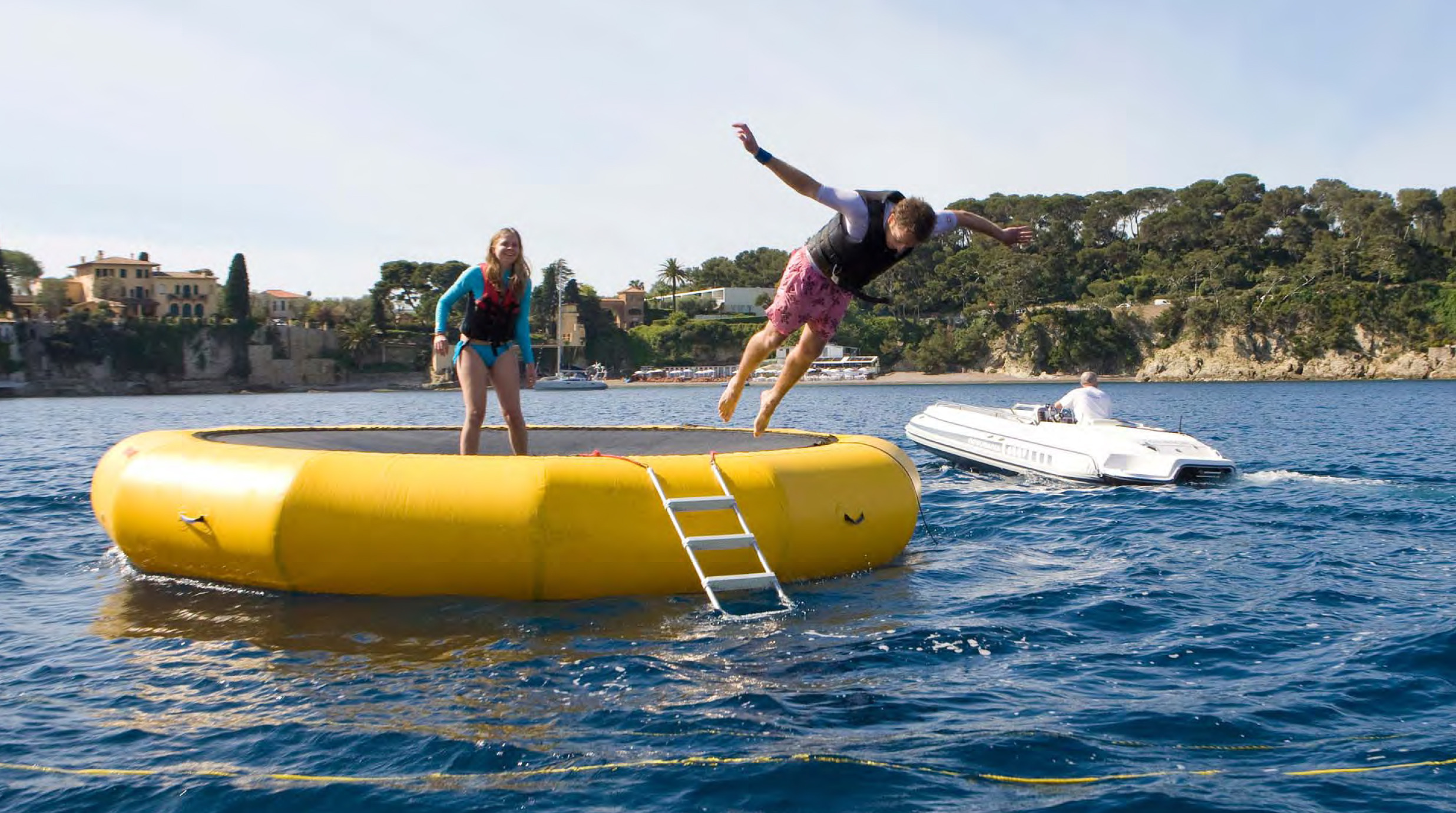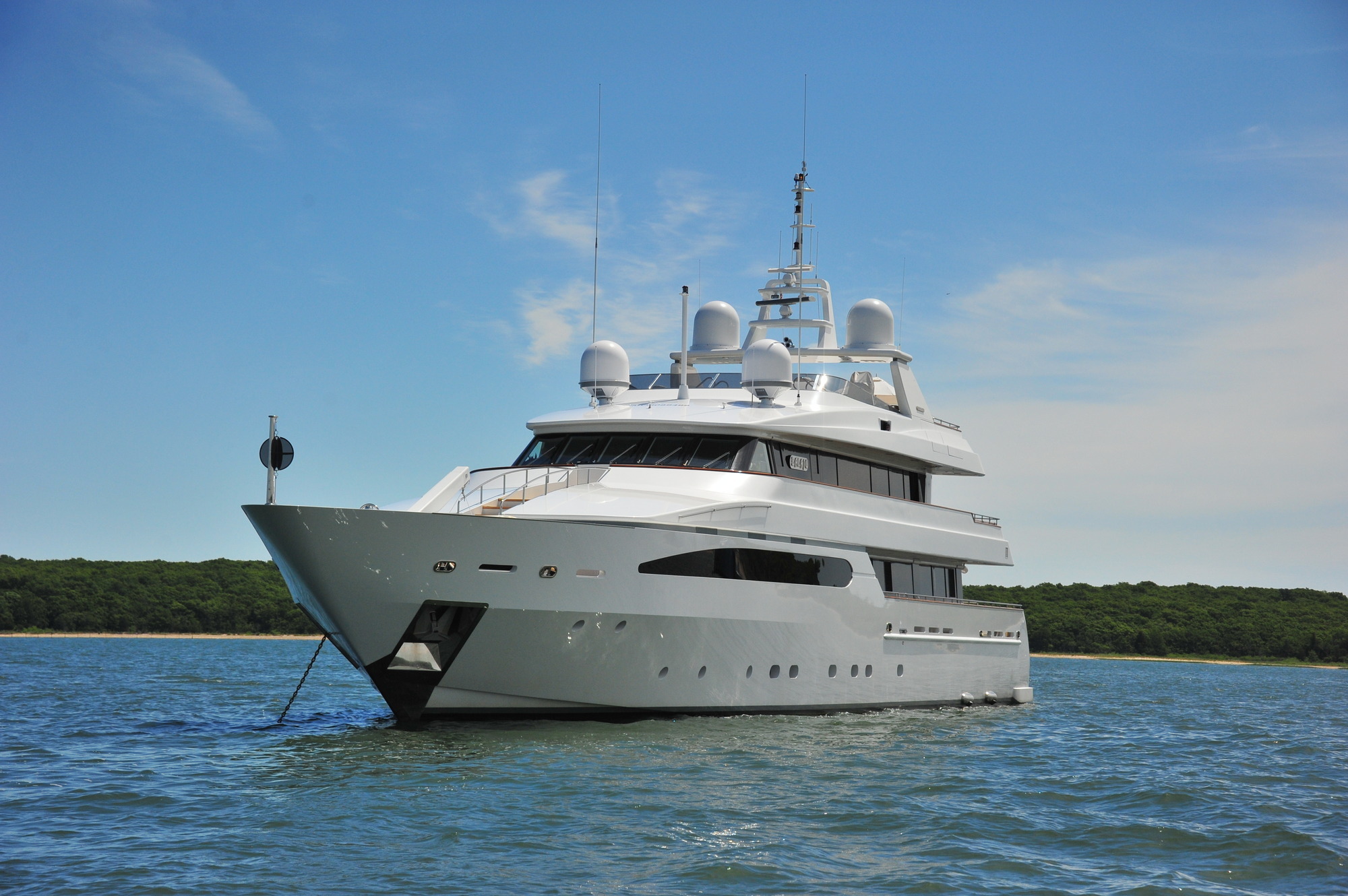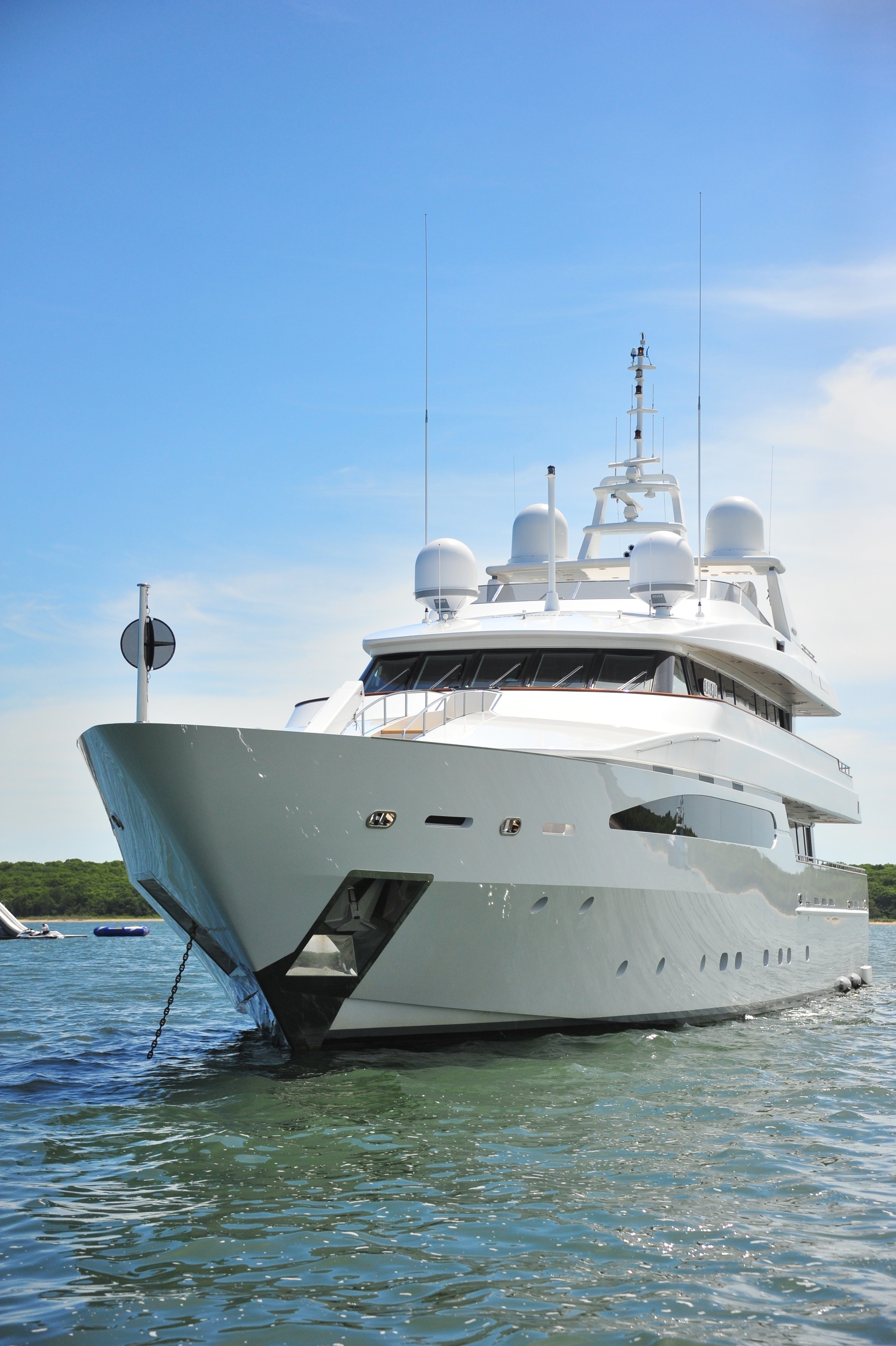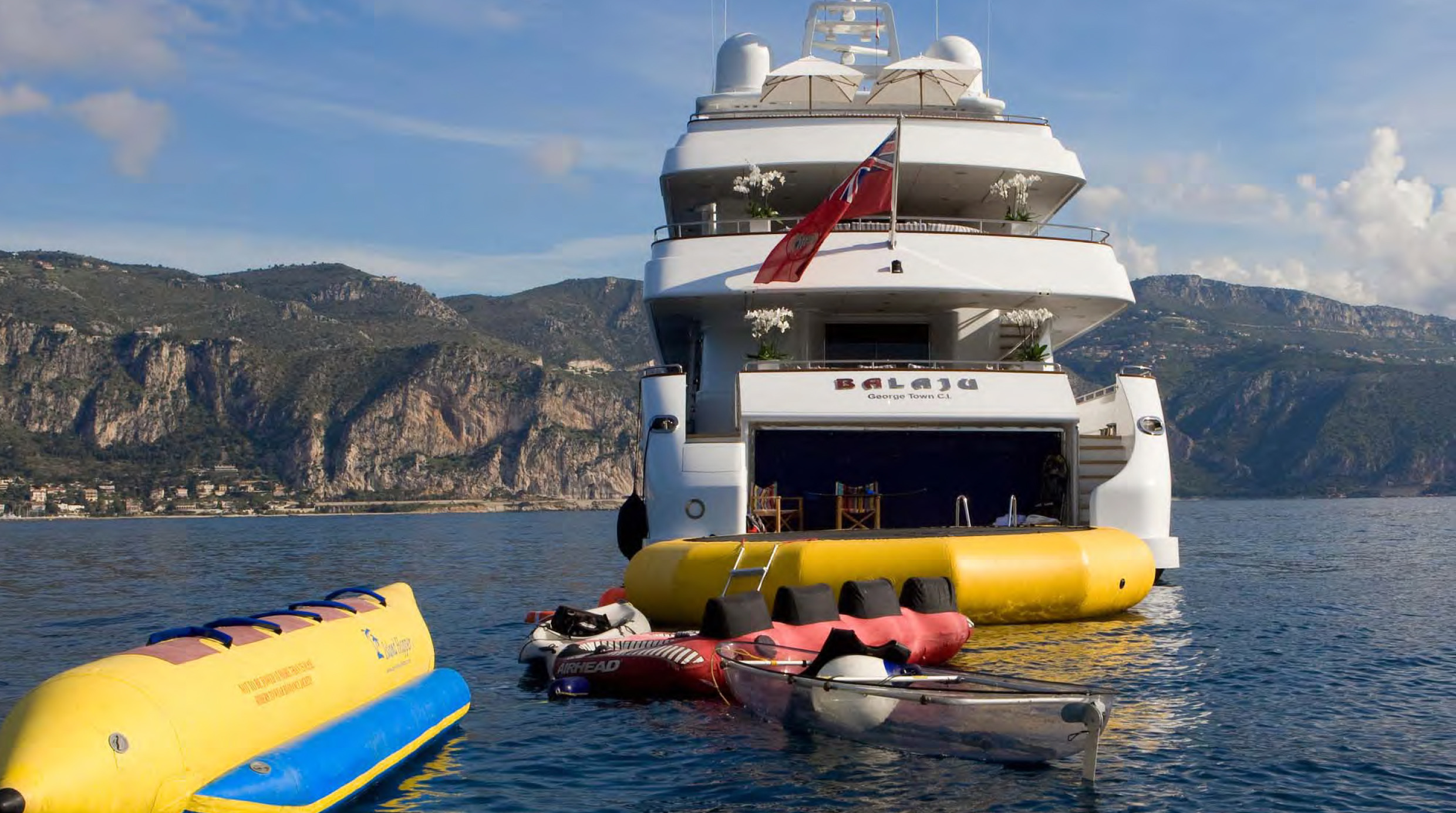 Tenders & Toys: 29 ft / 8.8 m Cigarette / 2 x 250 hp (towed) 14 ft / 4.5 m Novamarine Jet Tug /115hp diesel inboard with Castoldi jet drive 1 x wave runner, 1 x stand-up jet ski, water skis, 2 wake boards, and kneeboards, Miscellaneous towables, 6-person banana, Assorted snorkel gear, 1 windsurfer, 1 kite board, 1 Sea kayak, 1 trampoline with slide and extensions. 2 x bicycles There is exercise equipment on the sundeck 1 x treadmill, 1 x elliptical machine, 1 x stationary bike, 2 step-blocks 2 yoga mats, 2 medicine balls, 1 jump rope, push-up pads, 2 x workout mats, A variety of resistance bands, A selection of free weights (2 - 45 lbs) Audio Visual Equipment and Deck Facilities: Main Salon - 28 inch TV/DVD/CD/Stereo. Wii, XBox Sky lounge - 42 inch TV (retractable)/DVD/CD/stereo/surround sound which also plays to upper aft deck and sundeck iPod connection feeds upper aft deck and sundeck Master Cabin - 42” TV/DVD/CD/stereo Guest Cabins - Flat Screen TV/DVD/CD/Stereo Communications: V-Sat, Fleet 77, WiFi throughout