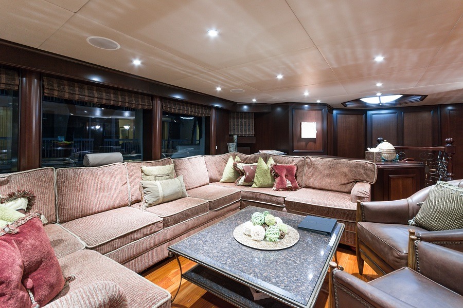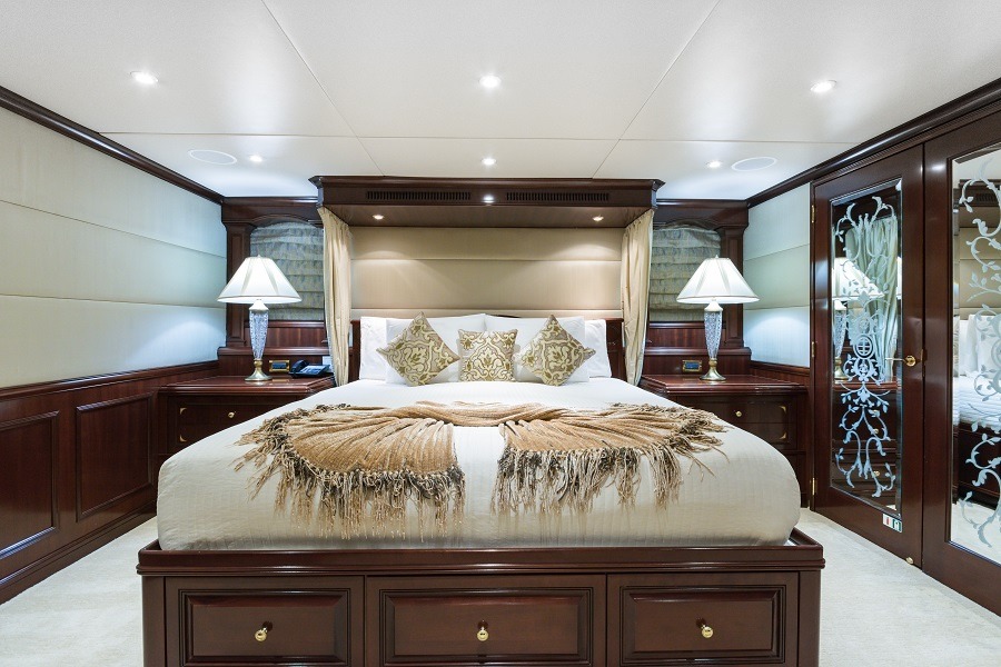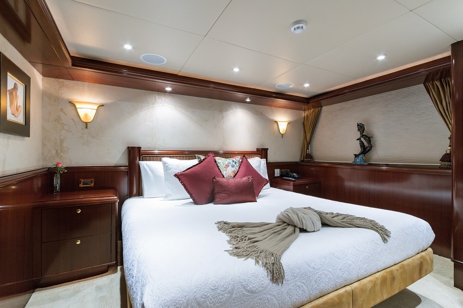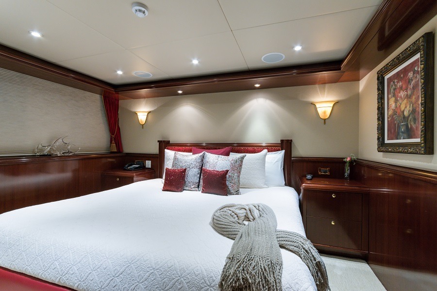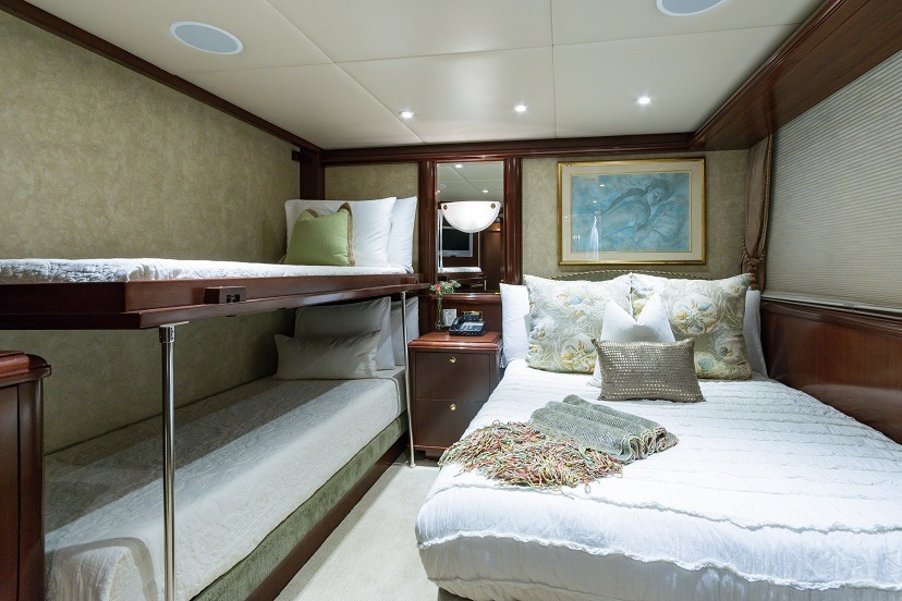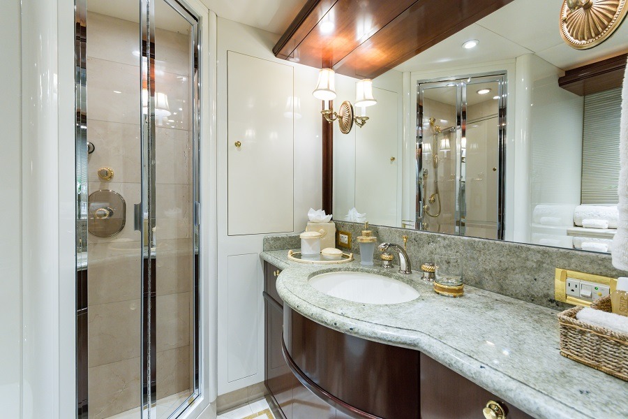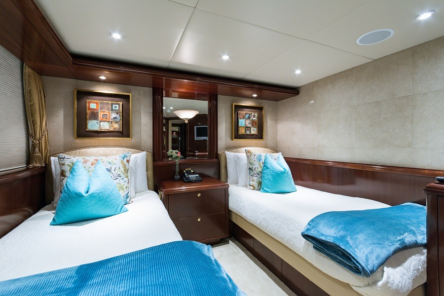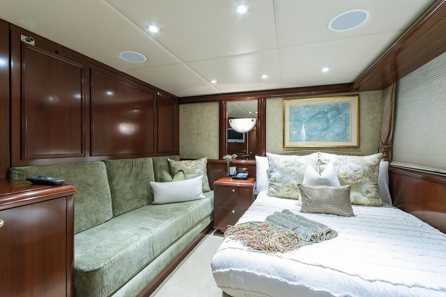The master suite is located amidship on the lower deck and features a California King bed, full seating area with sofa and chairs, large walk-in closets with dressing area and elegant en-suite marble accented bathroom with steam shower. There are four additional staterooms aft of the Master including a Double Guest Stateroom with pullman and sofa bed, two mirrored guest staterooms set with King sized beds and a twin guest stateroom to starboard. Each stateroom is ensuite with head and shower and fully equipped with flat screen TV (with direct TV in every room), DVD and CD.